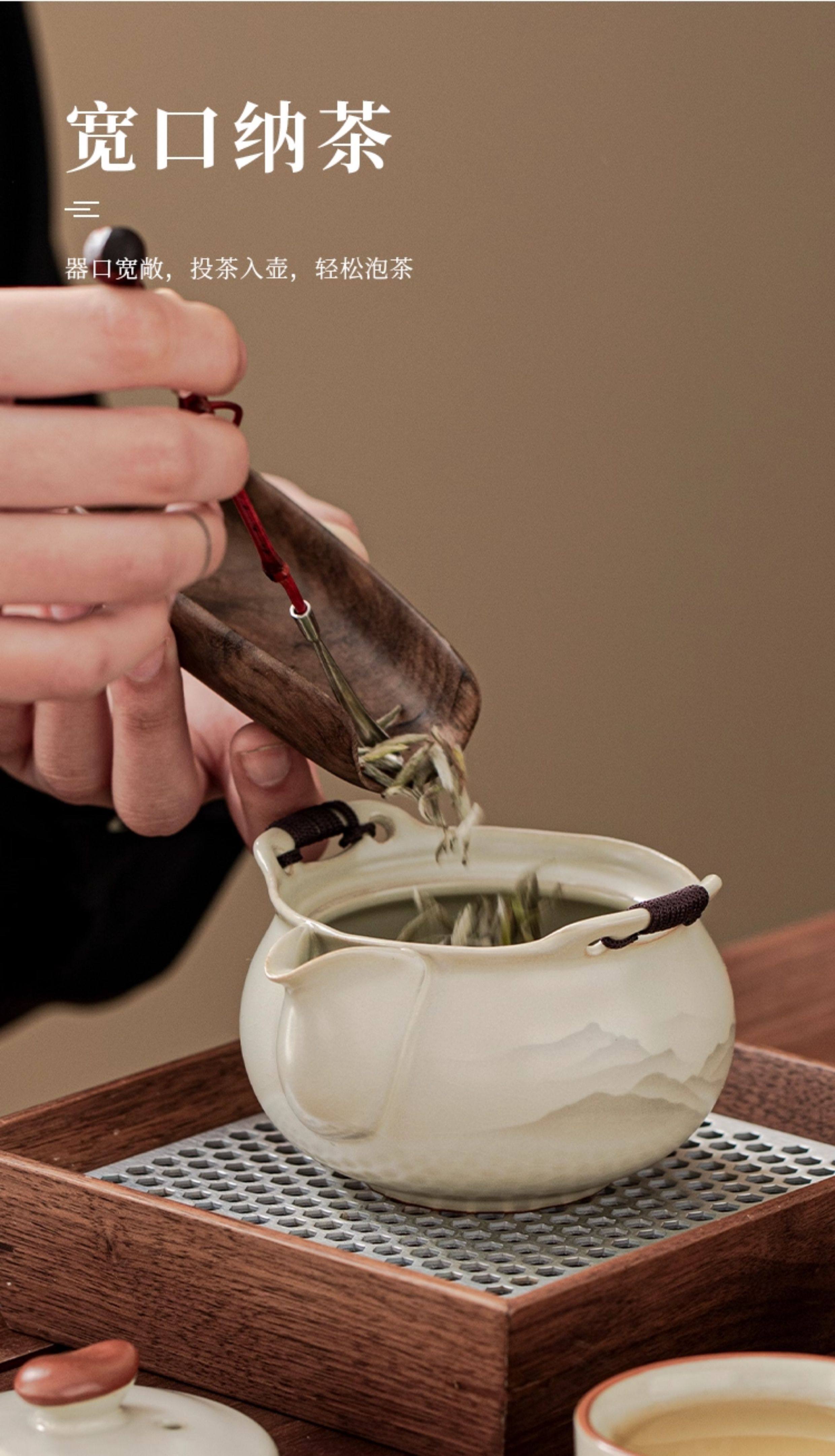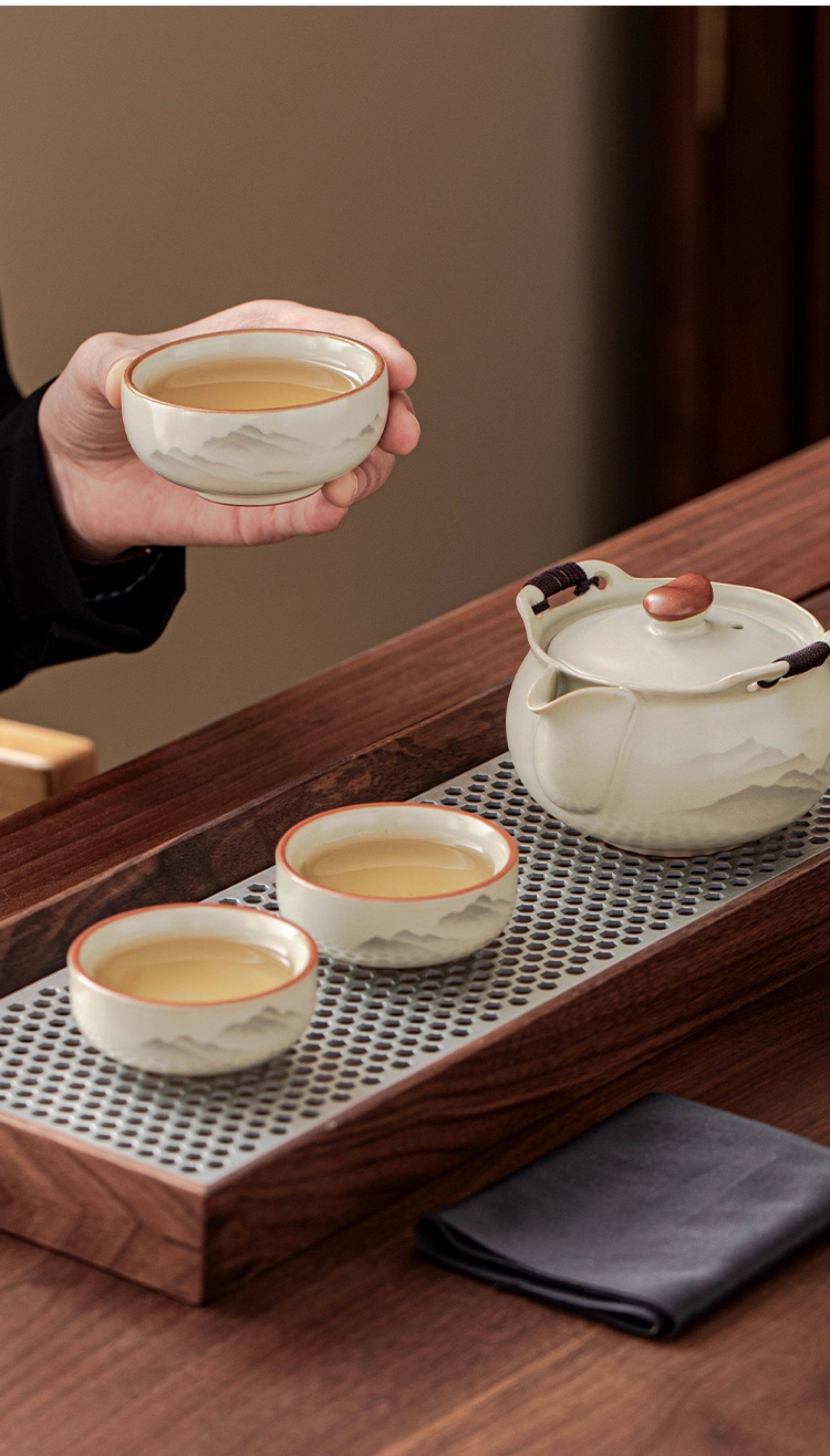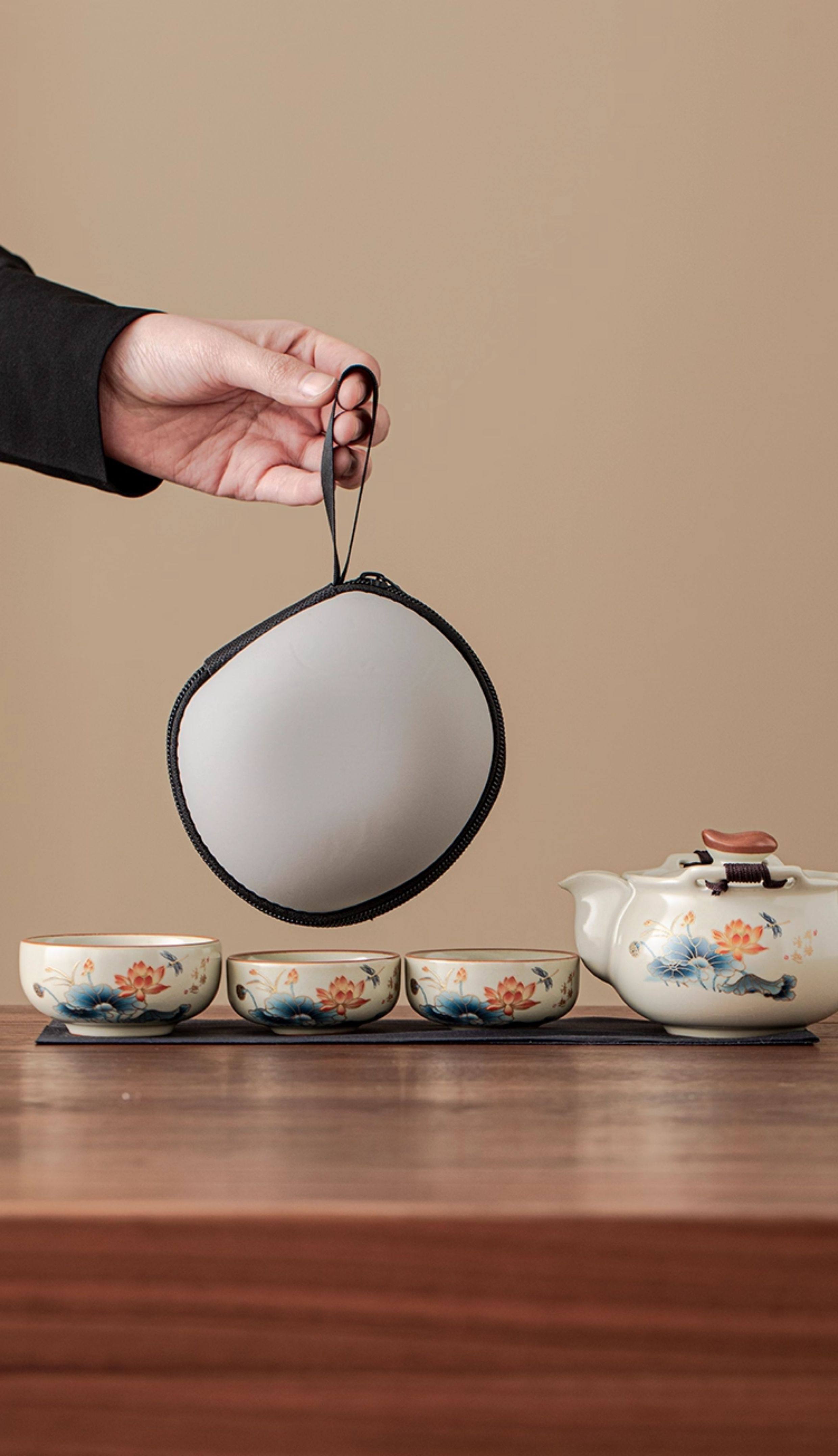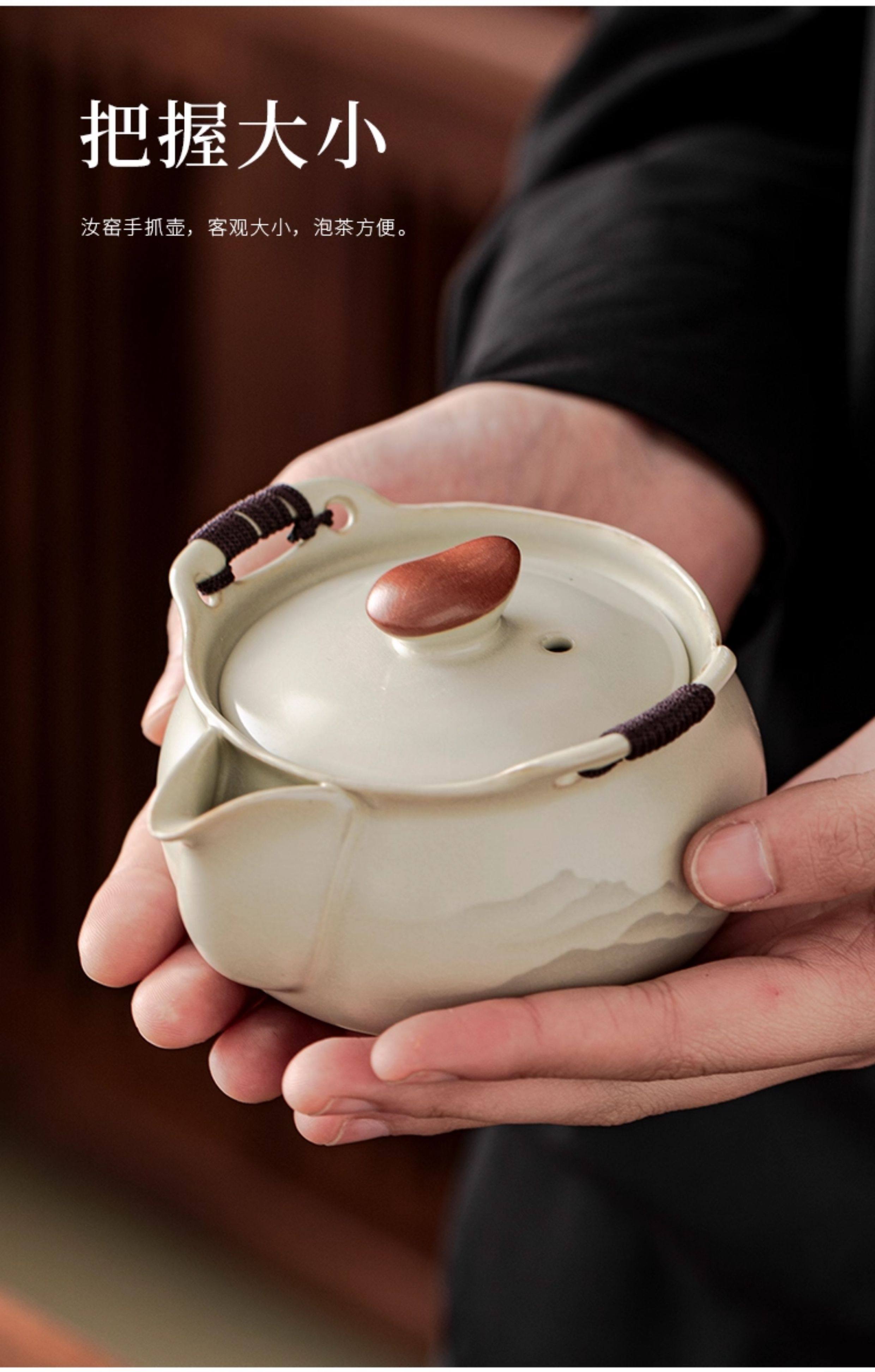 Haoyao Ru Kiln Travel Tea Set, One Pot and Three Cups, Hand-Held Pot with Lid, Bowl, Outdoor Portable Tea Brewing Set, Quick Tea Cup