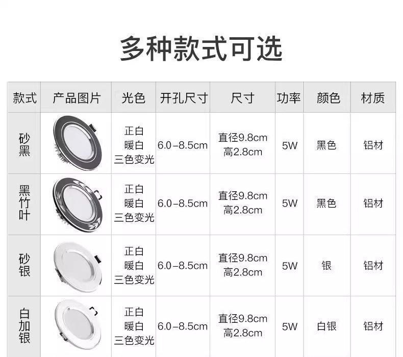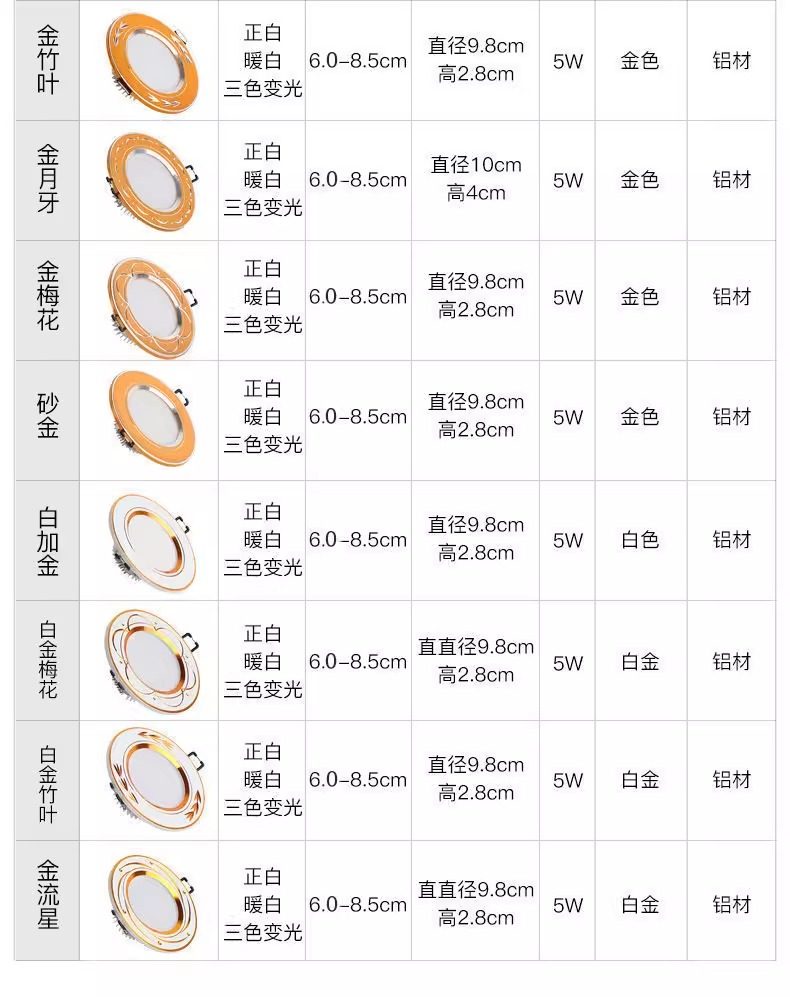 | Color Classification | 10 Pieces - White + Gold [5W-High Brightness White Light],10 Pieces - Platinum [5W-Three-Color Dimming],10 Pieces - Platinum [5W-Warm Basket Purple Light],10 Pieces - Silver [5W-High Brightness White Light],10 Pieces - Silver [5W-Three-Color Dimming],10 Pieces - Silver [5W-Warm Basket Purple Light],10 Pieces - White and Black [5W-High Brightness White Light],10 Pieces - White and Black [5W-Three-Color Dimming],10 Pieces - White and Black [5W-Warm Blue and Purple Light],10 Pieces - Frosted Gold [5W-High Brightness White Light],10 Pieces - Frosted Gold [5W-Three-Color Dimming],10 Pieces - Frosted Gold [5W-Warm Basket Purple Light],10 Pieces - Frosted Silver [5W-High Brightness White Light],10 Pieces - Frosted Silver [5W-Three-Color Dimming],10 Pieces - Frosted Silver [5W-Warm Basket Purple Light],10 Pieces - Matte Black [5W-High Brightness White Light],10 Pieces - Matte Black [5W-Three-Color Dimming],10 Pieces - Matte Black [5W-Warm Basket Purple Light] |