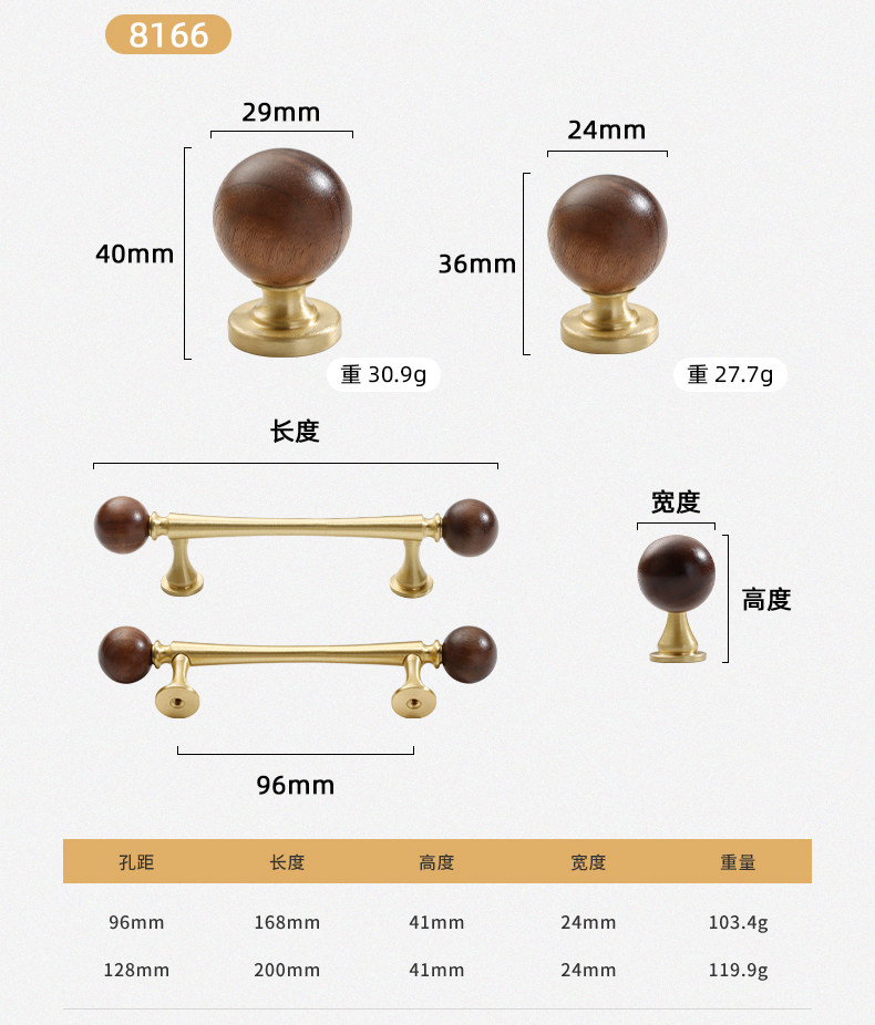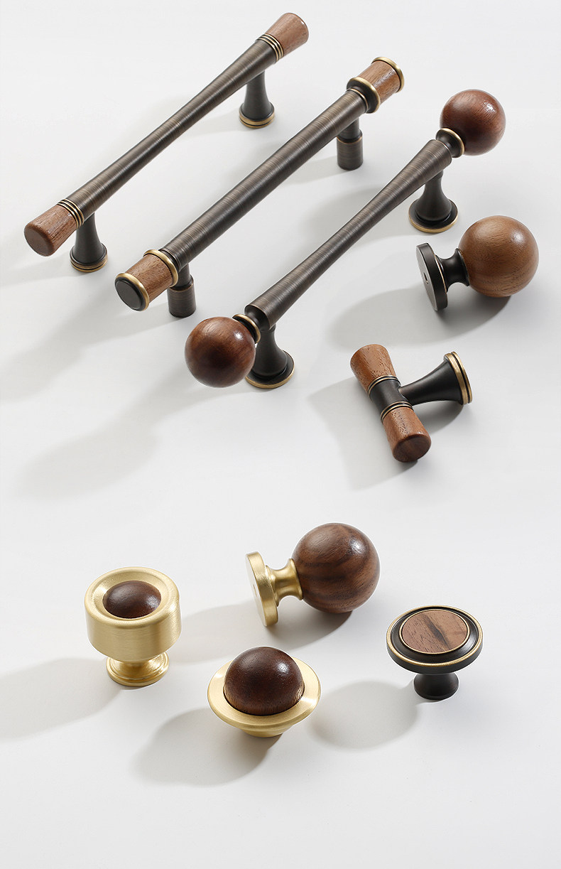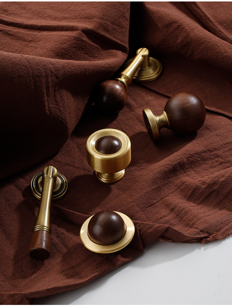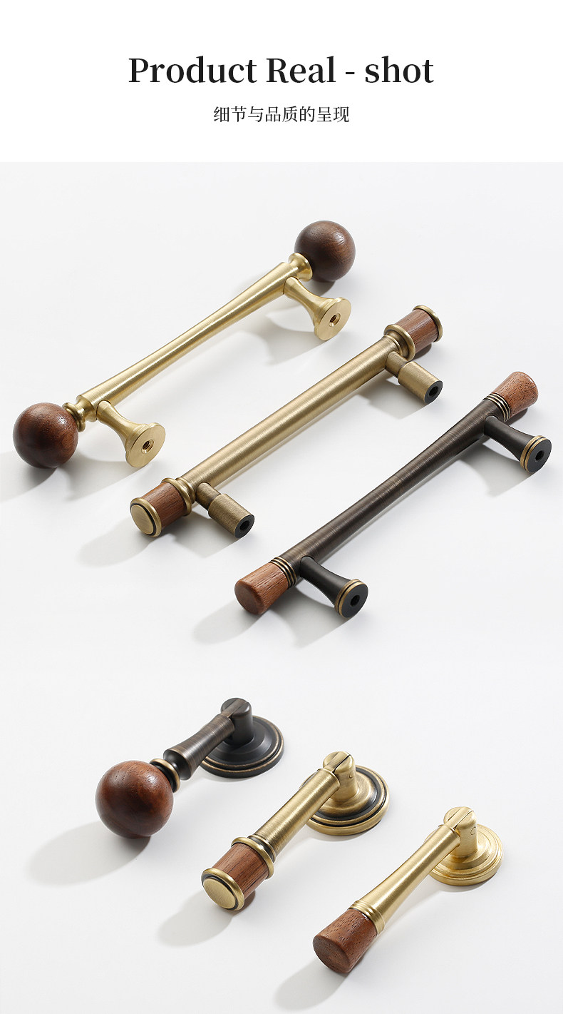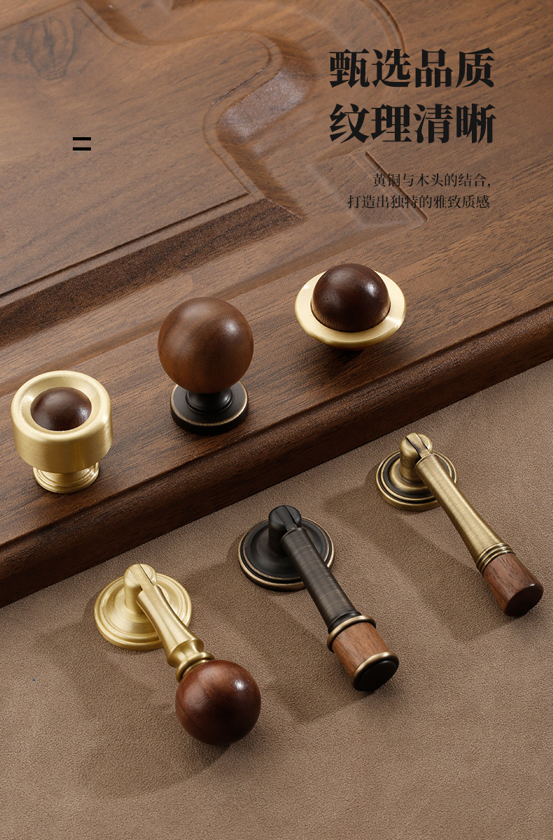 New Chinese-Style Retro Walnut Wood Brass Cabinet Door Handle, Antique Bronze Color Round Ball Cabinet Wardrobe Drawer Handle