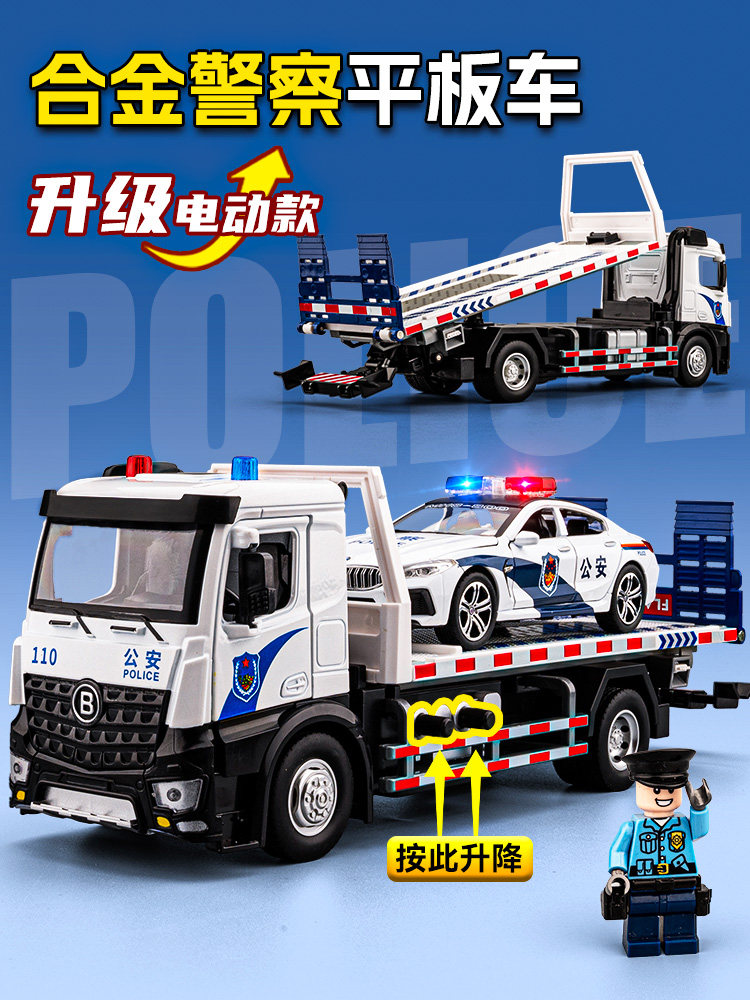 Large Electric Alloy Flatbed Trailer Toy Boy's Simulated Police Car Children's Toy Car Road Rescue Vehicle Model