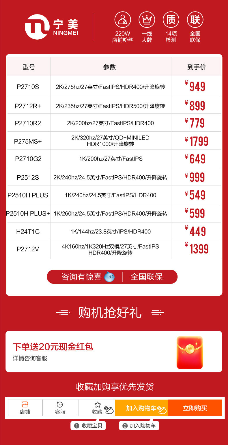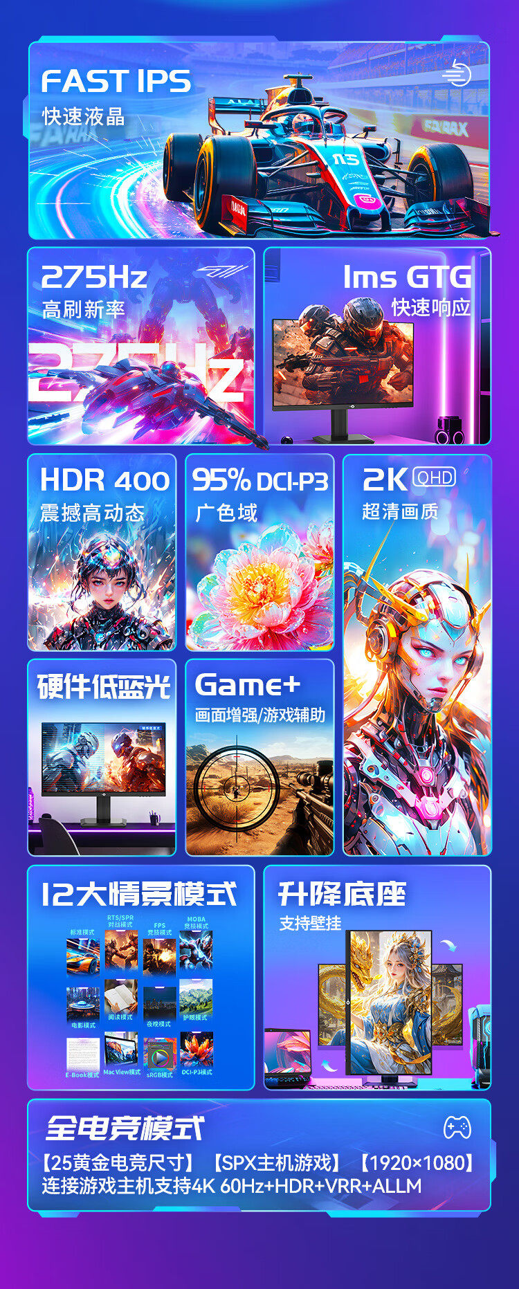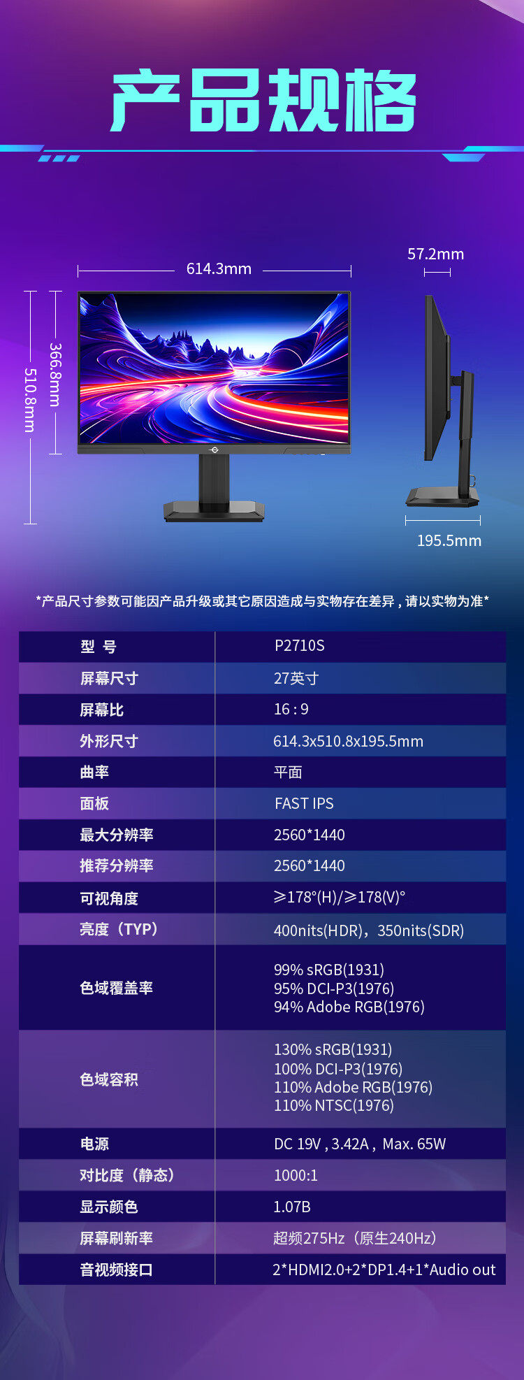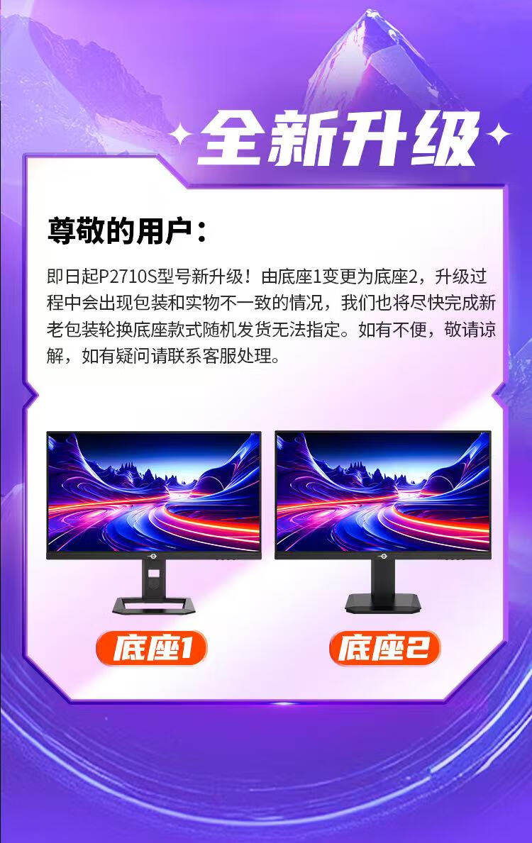 | Color Classification | [2K/275Hz/ 27inch /Fastips/Lifting Rotation/Hdr400] P2710S,[2K/235Hz/ 27inch /Fastips/Hdr500/Lifting and Rotating] P2712R+,[2K/200Hz/ 27inch /Fastips/Hdr400/Lifting and Rotating] P2712R,【2K/235Hz/ 27inch /Fast Ips/Hdr 500】P2710R2+,【2K/200Hz/ 27inch /Fast Ips/Hdr 400】P2710R2,[2K/320Hz/ 27inch /Qd-Miniled/Hdr1000/Lifting Rotation] P275Ms+,【1K/260Hz/ 27inch /Fast Ips/Hdr400】 P2710H Plus,【1K/200Hz/ 27inch /Fast Ips】P2710G2,[2K/240Hz/ 24.5inch /Fastips/Lift and Rotate/Hdr400] P2512S,【2K/170Hz/ 24.5inch /Fast Ips】 P2510R,【1K/260Hz/ 24.5inch /Fastips/Lift and Rotate/Hdr400】 P2510H Plus+,【1K/240Hz/ 24.5inch /Fast Ips/Hdr400】 P2510H Plus,【1K/200Hz/ 24.5inch /Fast Ips/Hdr400】P2510G2,【1K/144Hz/ 23.8inch / Ips/Hdr400】H24T1C,[4K160Hz/1K320Hz Dual Mode/ 27inch /Fastips/Lifting and Rotating/Hdr400] P2712V |