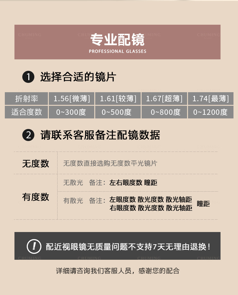 | Lens Refractive Index | Frame + 0 Degree Anti-Radiation Lenses,Eyeglass Frames + [Thin & Lightweight] Premium 1.56 Blue Light Blocking & Anti-Radiation Lenses [Suitable for 0-300] [Please Specify Prescription],Eyeglass Frames + [Slightly Thinner] Premium 1.61 Blue Light Blocking & Anti-Radiation Lenses [Suitable for 0-500] [Please Specify Prescription],Eyeglass Frames + [Ultra-Thin] Premium 1.67 Blue Light Blocking & Anti-Radiation Lenses [Suitable for 0-800] [Please Specify Prescription],Eyeglass Frames + [Ultra-Thin] Premium 1.74 Blue Light Blocking & Anti-Radiation Lenses [Suitable for 0-1200] [Please Specify Prescription],Eyeglass Frames + [Thin & Lightweight] Premium 1.56 Anti-Blue Light Lenses [Suitable for 0-300] [Please Specify Prescription],Eyeglass Frames + [Slightly Thinner] Premium 1.61 Anti-Radiation Lenses [Suitable for 0-500 Prescription] [Please Specify Prescription],Eyeglass Frames + [Ultra-Thin] Premium 1.67 Anti-Radiation Lenses [Suitable for 0-800] [Please Specify Prescription],Eyeglass Frames + [Ultra-Thin] Premium 1.74 Anti-Blue Light Lenses [Suitable for 0-1200] [Please Specify Prescription],Frame + Essilor Wanxin 1.56 Multi-Screen Anti-Blue Light Lenses [Suitable for 0-300] [Remark Degree],Eyeglass Frames + Essilor's Varifocal 1.60 Blue Light Blocking Lenses [Suitable for 0-500] [Please Specify Prescription],Eyeglass Frames + Essilor Vanessa 1.67 Multi-Screen Anti-Blue Light Lenses [Suitable for 0-800] [Please Specify Prescription],Frame + Essilor Wanxin 1.74 Multi-Screen Anti-Blue Light Lenses [Suitable for 0-1200] [Remark Degree],Frame + Essilor Wanxin 1.56 Daily Anti-Radiation Lenses [Suitable for 0-300] [Remark Degree],Frame + Essilor Wanxin 1.60 Daily Anti-Radiation Lenses [Suitable for 0-500] [Remark Degree],Frame + Essilor Wanxin 1.67 Daily Anti-Radiation Lenses [Suitable for 0-800] [Remark Degree],Frame + Essilor Wanxin 1.74 Daily Anti-Radiation Lenses [Suitable for 0-1200] [Remark Degree] |
