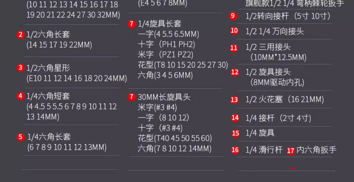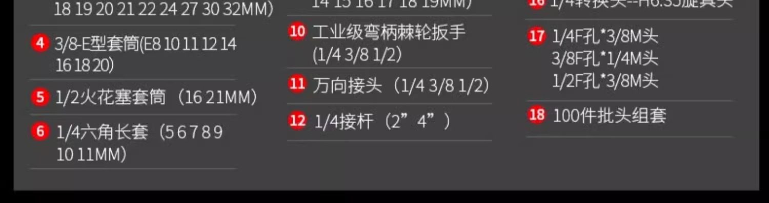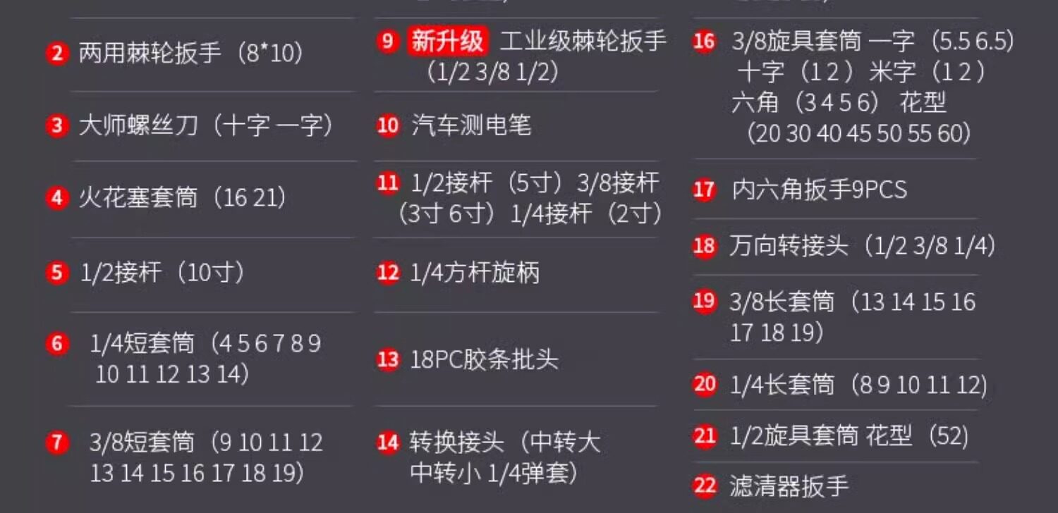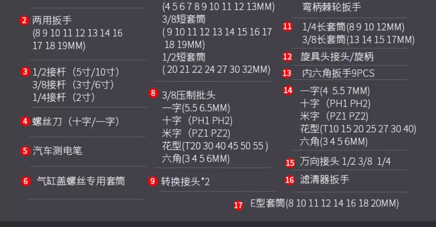 | Color Classification | Upgraded 72-Tooth Curved Handle Auto Repair 108-Piece Set,Upgraded 72-Tooth Curved Handle Auto Repair 121-Piece Set,Upgraded 72-Tooth Curved Handle Auto Repair 150-Piece Set,Upgraded 72-Tooth Curved Handle Auto Repair 172-Piece Set,Upgraded 72-Tooth Curved Handle Auto Repair 216-Piece Set,[Flagship Model] 72-Tooth Curved Handle Auto Repair 108-Piece Set,[Flagship Model] 72-Tooth Curved Handle Auto Repair 121-Piece Set,[Flagship Model] 72-Tooth Curved Handle Auto Repair 150-Piece Set,ăDetachable Quick-Release Wrench Rack, Mobile RepairăComprehensive Auto Repair 128-Piece Set,[5 Times Labor-Saving-X-Shaped Wrench] 162-Piece Auto Repair Set,ă4S Anti-Dropă72-Tooth Curved Handle 121-Piece Set,ă4S Anti-Dropă72-Tooth Curved Handle 128-Piece Set,ă4S Anti-Dropă72-Tooth Curved Handle 210-Piece Set,ă4S Anti-Dropă72-Tooth Curved Handle 255-Piece Set,[4S Anti-Falling] 255 Pieces+â850N·M Electric Impact Wrench,Upgraded 72-Tooth Curved Handle Auto Repair 150-Piece Set,Upgraded 72-Tooth Curved Handle Auto Repair 108-Piece Set,[4S Anti-Falling] 210 Pieces+â600N·M Electric Impact Wrench,[4S Anti-Falling] 210 Pieces + Electric Drill Set |