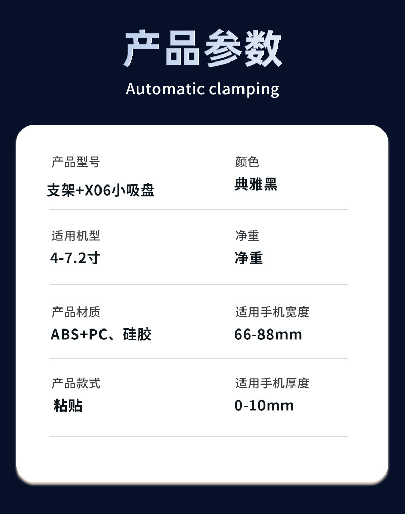 | Color Classification | ăDual-Purpose Mini Suction CupăOne-Touch Clampingâ Can Be Used Horizontally or Verticallyâ Does Not Block the View,ăDual-Powered Mini Suction Cupă+ Enhanced Adhesion Auxiliary Plate â One-Click Clamping â Can Be Used Horizontally or Vertically â Stability Improved by 200% |