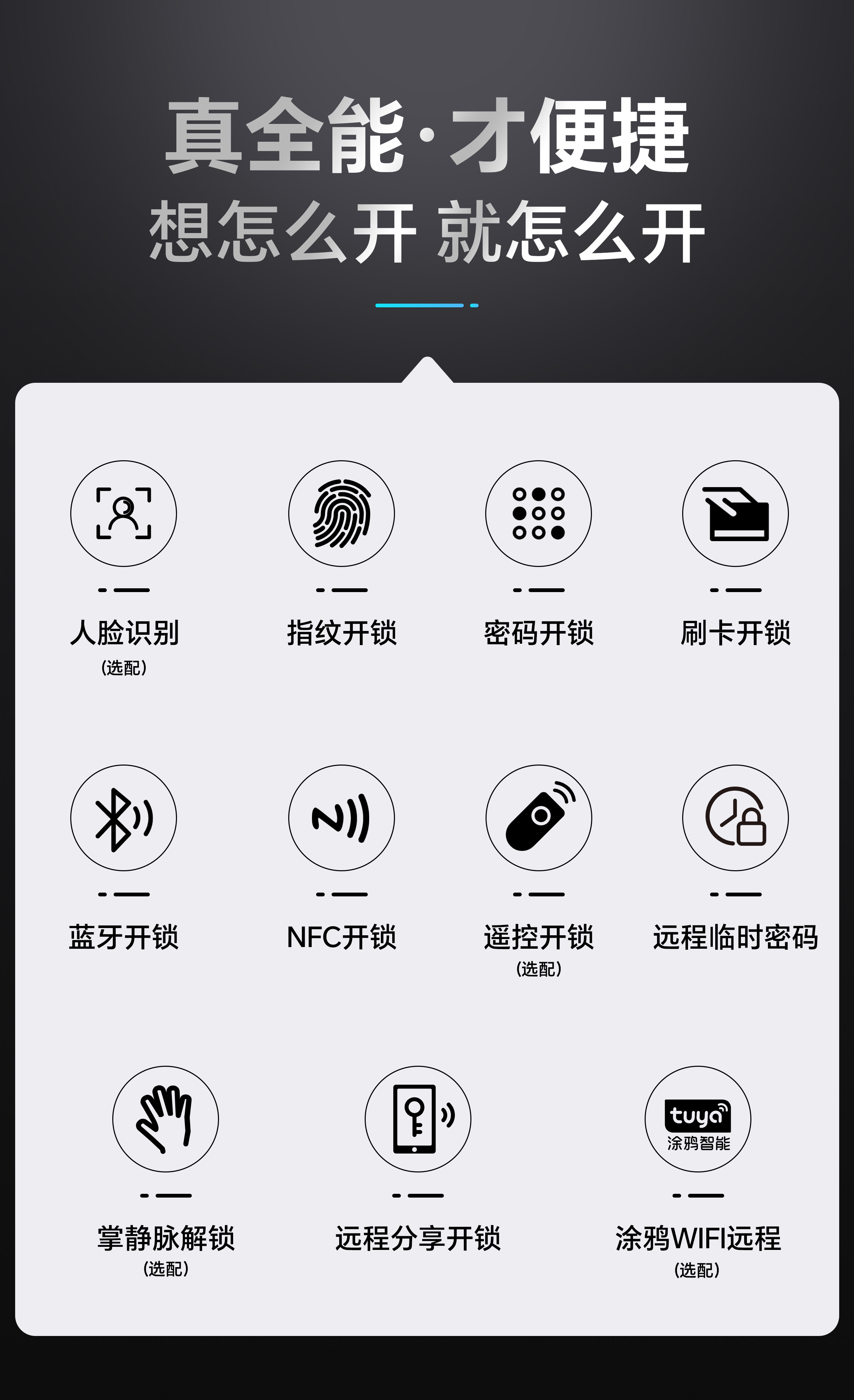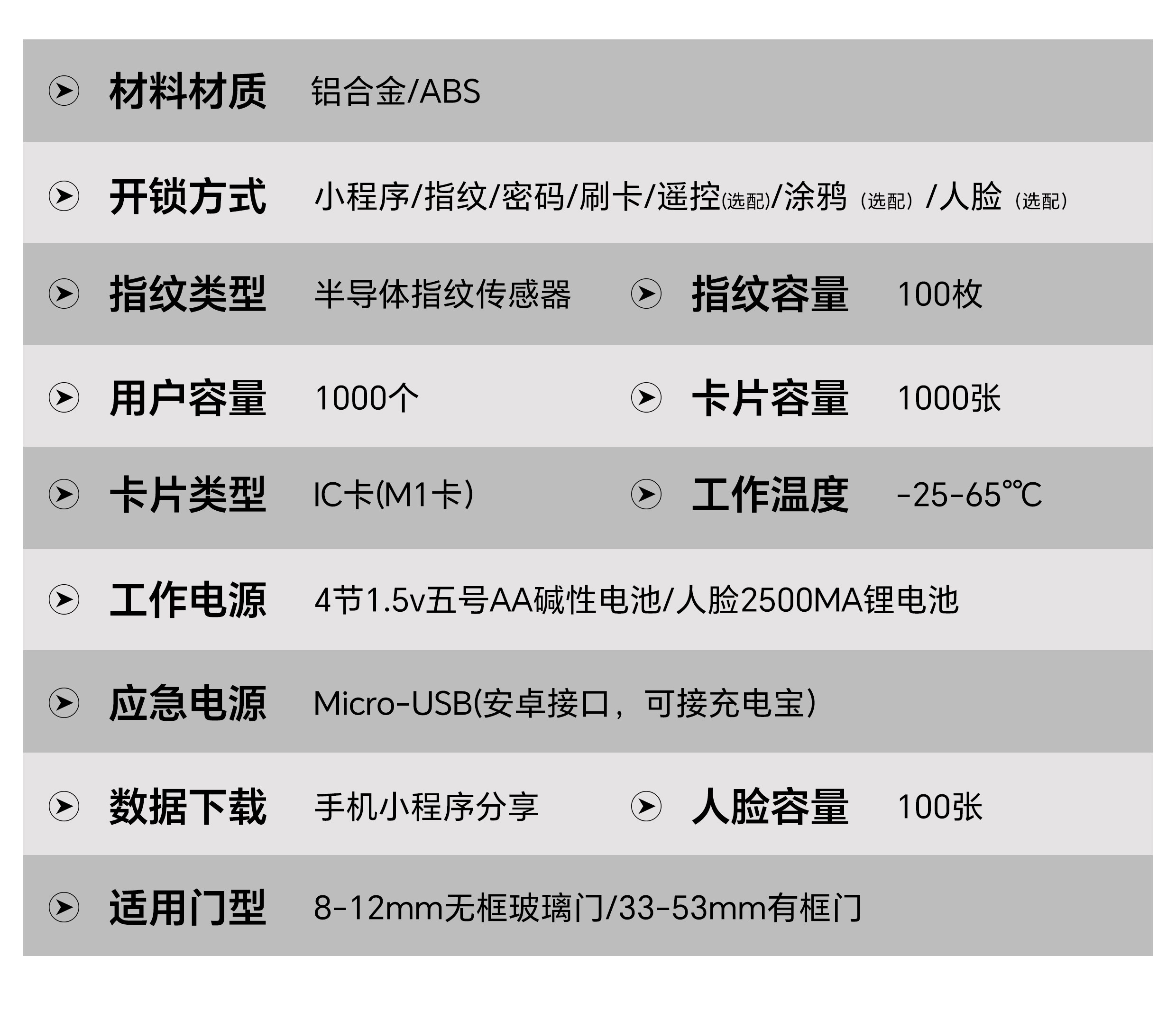 | Finish Color | Fingerprint Model[Door Thickness 3.3-3.6cm]Overlord Hook + Free Ground Lock,Fingerprint Model[Door Thickness 3.7-4.2cm]Overlord Hook + Free Ground Lock,Fingerprint Model[Door Thickness 4.3-4.7cm]Overlord Hook + Free Ground Lock,Fingerprint Model[Door Thickness 4.8-5.2cm]Overlord Hook + Free Ground Lock,3D Face[Door Thickness 3.5-3.8cm]Double Hook + No Ground Lock,3D Face[Door Thickness 3.9-4.3cm]Double Hook + No Ground Lock,3D Face[Door Thickness 4.4-4.6cm]Double Hook + No Ground Lock,3D Face[Door Thickness 4.7-5.1cm]Double Hook + No Ground Lock,3D Face[Door Thickness 5.2-5.6cm]Double Hook + No Ground Lock,3D Face[Door Thickness 5.7-6.1cm]Double Hook + No Ground Lock,Palm Veins + 3D Face[Door Thickness 3.3-3.6CM]Overlord Hook + Ground Plug-Free - Waterproof,Palm Veins + 3D Face[Door Thickness 3.7-4.2CM]Overlord Hook + Ground Plug-Free - Waterproof,Palm Veins + 3D Face[Door Thickness 4.3-4.7CM]Overlord Hook + Ground Plug-Free - Waterproof,Palm Veins + 3D Face[Door Thickness 4.8-5.2CM]Overlord Hook + Ground Plug-Free - Waterproof,Palm Vein Remote Model + 3D Face Recognition[Door Thickness 3.3-3.6CM]Overlord Hook + Ground Plug-Free - Waterproof,Palm Vein Remote Model + 3D Face Recognition[Door Thickness 3.7-4.2CM]Overlord Hook + Ground Plug-Free - Waterproof,Palm Vein Remote Model + 3D Face Recognition[Door Thickness 4.3-4.7CM]Overlord Hook + Ground Plug-Free - Waterproof,Palm Vein Remote Model + 3D Face Recognition[Door Thickness 4.8-5.2CM]Overlord Hook + Ground Plug-Free - Waterproof,Fingerprint Model[]Contact Customer Service to Note the Door Thickness,3D Face[]Contact Customer Service to Note the Door Thickness,Palm Veins + 3D Face[]Contact Customer Service to Note the Door Thickness,Palm Vein Remote Model + 3D Face Recognition[]Contact Customer Service to Note the Door Thickness |