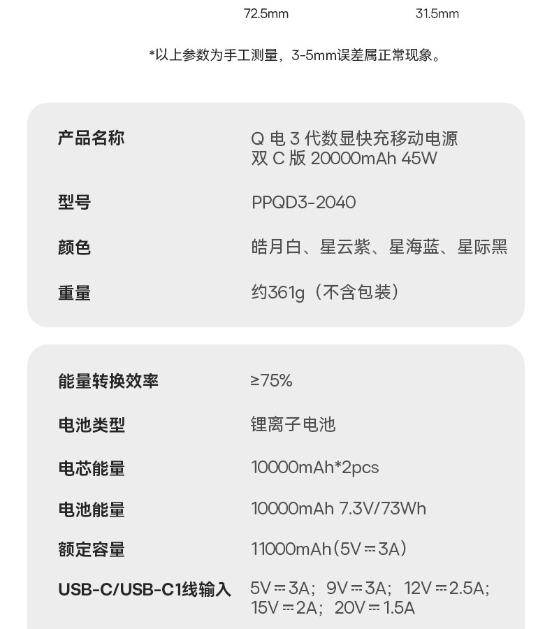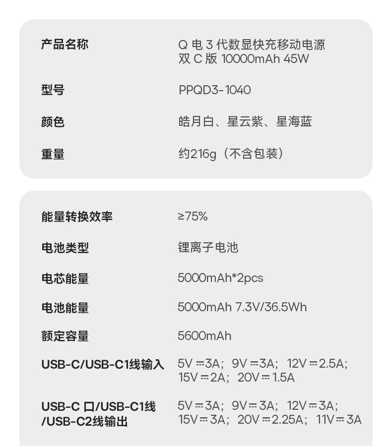 | Fast Charging Protocol | PD3.0,PD2.0,Other,SCP |