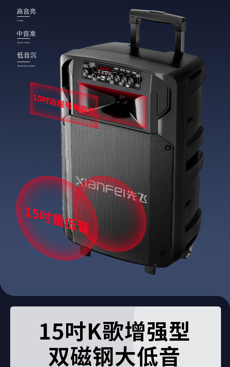 | Color Classification | Dual 12inch Speakers/Three-Unit Sound/Heavy Bass (Without Microphone),Dual 12inch Speakers/Three-Unit Sound/Bass (Without Microphone) + 32g Music USB Flash Drive,Dual 12inch Speakers/Three-Unit Sound/Bass (Without Microphone) + Speaker Stand,Dual 12inch Speakers/Three-Unit Sound/Heavy Bass +1 Rechargeable Wireless Handheld Microphone,Dual 12inch Speakers/Three-Unit Sound/Heavy Bass + 1 Rechargeable Wireless Handheld Microphone + 32g Music USB Flash Drive,Dual 12inch Speakers/Three-Unit Sound/Heavy Bass + 1 Rechargeable Wireless Handheld Microphone + Stand,Dual 12inch Speakers/Three-Unit Sound/Heavy Bass + 2 Rechargeable Wireless Handheld Microphones,Dual 12inch Speakers/Three-Unit Sound/Heavy Bass + 2 Rechargeable Wireless Handheld Microphones + 32g Music USB Flash Drive,Dual 12inch Speakers/Three-Unit Sound/Heavy Bass + 2 Rechargeable Wireless Handheld Microphones + Stand,Dual 12inch Speakers/Three-Unit Sound/Heavy Bass +1 Rechargeable Wireless Headset Microphone,Dual 12inch Speakers/Three-Unit Sound/Heavy Bass + 1 Rechargeable Wireless Headset Microphone + 32g Music USB Flash Drive,Dual 12inch Speakers/Three-Unit Sound/Heavy Bass + 1 Rechargeable Wireless Headset Microphone + Stand,Dual 12inch Speakers/Three-Unit Sound/Heavy Bass + 1 Headset Microphone + 1 Handheld Microphone,Dual 12inch Speakers/Three-Unit Sound/Heavy Bass + 1 Headset Microphone + 1 Handheld Microphone + 32g Music USB Flash Drive,Dual 12inch Speakers/Three-Unit Sound/Heavy Bass + 1 Headset Microphone + 1 Handheld Microphone + Stand,Dual 15inch Speakers/Three-Unit Sound/Noise/Improved Sound Quality and Volume (Without Microphone),Dual 15inch Speakers/Three-Unit Sound/Noise/Improved Sound Quality and Volume (Without Microphone) + 32g Music USB Flash Drive,Dual 15inch Speakers/Three-Unit Sound/Noise Quality and Volume Improvement (Without Microphone) + Stand,Dual 15inch Speakers/Three-Unit Sound Production/Improved Sound Quality and Volume +1 Rechargeable Wireless Handheld Microphone,Dual 15inch Speakers/Three-Unit Sound Production/Improved Sound Quality and Volume + 1 Rechargeable Wireless Handheld Microphone + 32g Music USB Flash Drive,Dual 15inch Speakers/Three-Unit Sound Production/Improved Sound Quality and Volume + 1 Rechargeable Wireless Handheld Microphone + Stand,Dual 15inch Speakers/Three-Unit Sound Production/Improved Sound Quality and Volume + 2 Rechargeable Wireless Handheld Microphones,Dual 15inch Speakers/Three-Unit Sound Production/Improved Sound Quality and Volume + 2 Rechargeable Wireless Handheld Microphones + 32g Music USB Flash Drive,Dual 15inch Speakers/Three-Unit Sound Production/Improved Sound Quality and Volume + 2 Rechargeable Wireless Handheld Microphones + Stand,Dual 15inch Speakers/Three-Unit Sound/Noise Quality and Volume Increase +1 Rechargeable Wireless Headset Microphone,Dual 15inch Speakers/Three-Unit Sound/Noise Quality and Volume Increase + 1 Rechargeable Wireless Headset Microphone + 32g Music USB Flash Drive,Dual 15inch Speakers/Three-Unit Sound/Noise Quality and Volume Increase + 1 Rechargeable Wireless Headset Microphone + Stand,Dual 15inch Speakers/Three-Unit Sound/Noise Quality and Volume Increase + 1 Headset Microphone + 1 Handheld Microphone,Dual 15inch Speakers/Three-Unit Sound/Quality and Volume Improvement + 1 Headset Microphone + 1 Handheld Microphone + 32g Music USB Flash Drive,Dual 15inch Speakers/Three-Unit Sound Production/Improved Sound Quality and Volume + 1 Headset Microphone + 1 Handheld Microphone + Stand |
