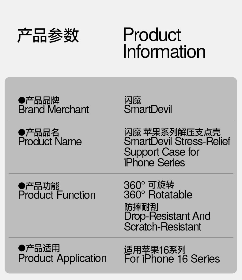 | Model | Flash Magic 360°Rotating Decompression Fulcrum Case Suitable for Apple 16~with Ticking Sound |