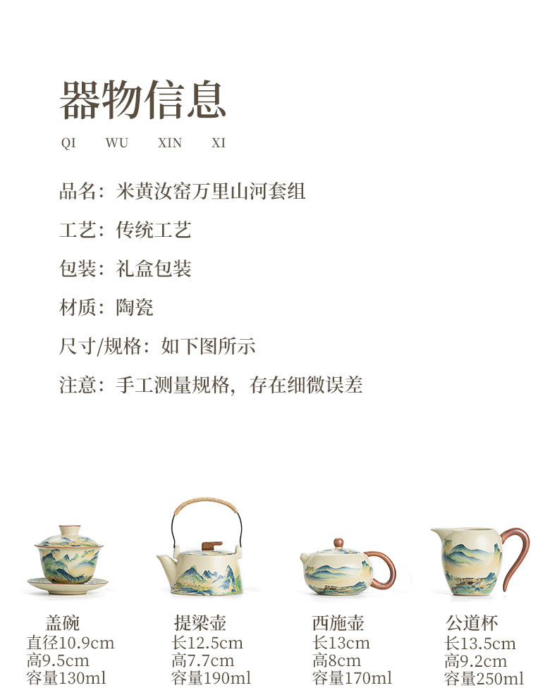 | Color Classification | Ten Thousand Miles of Mountains and Rivers. 15-Piece Teapot Set + Sliding Window Tea Tray (Thousand Miles of Rivers and Mountains Gift Box),Ink Wash Landscape 15-Piece Teapot Set with Lift Handle + Flowing Window Tea Tray (Thousand Miles of Rivers and Mountains Gift Box),Ru Kiln Flowers. 15-Piece Set of Teapots + Sliding Window Tea Tray (Qianli Jiangshan Gift Box),Ten Thousand Miles of Mountains and Rivers. Xishi Pot 10-Piece Set + Flowing Window Tea Tray (Thousand Miles of Rivers and Mountains Gift Box),Ten Thousand Miles of Mountains and Rivers. Xishi Pot 10-Piece Set (Thousand Miles of Mountains and Rivers Gift Box),Ten Thousand Miles of Mountains and Rivers. 10-Piece Set of Teapots (Thousand Miles of Rivers and Mountains Gift Box),Ten Thousand Miles of Mountains and Rivers. 10-Piece Tureen Set (Thousand Miles of Rivers and Mountains Gift Box),Ten Thousand Miles of Mountains and Rivers. Xishi Pot 15-Piece Set (Qianli Jiangshan Gift Box),Ten Thousand Miles of Mountains and Rivers. 15-Piece Set of Teapots (Qianli Jiangshan Gift Box),Ten Thousand Miles of Mountains and Rivers. Xishi Pot 15-Piece Set + Flowing Window Tea Tray (Thousand Miles of Rivers and Mountains Gift Box),Ten Thousand Miles of Mountains and Rivers. 10-Piece Tureen Set + Sliding Window Tea Tray (Thousand Miles of Rivers and Mountains Gift Box),Ten Thousand Miles of Mountains and Rivers. 10-Piece Set of Teapots + Sliding Window Tea Tray (Thousands of Miles of Mountains and Rivers Gift Box),Ru Kiln Floral Teapot 15-Piece Set (Qianli Jiangshan Gift Box),Ru Kiln Ink Wash Landscape Teapot 15-Piece Set (Thousand Miles of Rivers and Mountains Gift Box),Ru Kiln Ink Jiangshan Xishi Pot 15-Piece Set (Qianli Jiangshan Gift Box),Ru Kiln Ink Jiangshan Xishi Pot 15-Piece Set + Sliding Window Tea Tray (Qianli Jiangshan Gift Box),Beige Ru Kiln | Wanli Shanhe Tureen 10-Piece Set (Leather Gift Box),Beige Ru Kiln | Wanli Shanhe Xi Shi Teapot 10-Piece Set (Leather Gift Box),Beige Ru Kiln|Wanli Shanhe 10-Piece Teapot Set (Leather Gift Box),Beige Ru Kiln|Wanli Shanhe 15-Piece Teapot Set (Leather Gift Box),Beige Ru Kiln|Wanli Shanhe Xi Shi Teapot 15-Piece Set (Leather Gift Box),Beige Ru Kiln|15 Pieces of Wanli Shanhe Xi Shi Pot + Painted Mountain Flying Bird Dry Soaking Tray (Leather Gift Box),Beige Ru Kiln|15 Pieces of Wanli Mountains and Rivers Lift Kettle + Painted Mountain Flying Bird Dry Brewing Plate (Leather Gift Box),Ru Kiln Flowers. 15-Piece Set of Teapots (Qianli Jiangshan Gift Box),Ink Wash Landscape Teapot 15-Piece Set (Thousand Miles of Rivers and Mountains Gift Box),Ink Wash Landscape Xishi Teapot 15-Piece Set (Thousand Miles of Rivers and Mountains Gift Box),Ink Wash Landscape "Xi Shi" Teapot 15-Piece Set + Flowing Window Tea Tray (Thousand Miles of Rivers and Mountains Gift Box) |