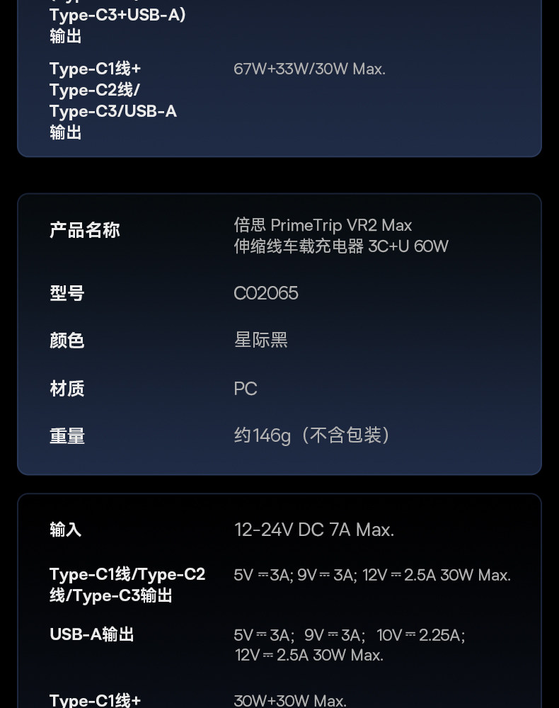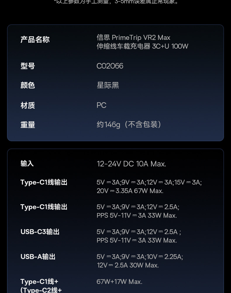 | Model | Vr2 Max Retractable Cable Car Charger |