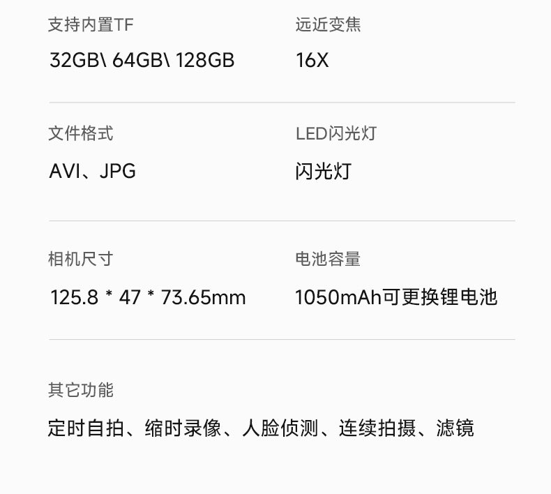 | Package | Official Standard Configuration,32g (Approximately 3000 Photos),64g (Approximately 6,000 Photos),128g (Approximately 12,000 Photos Stored) |