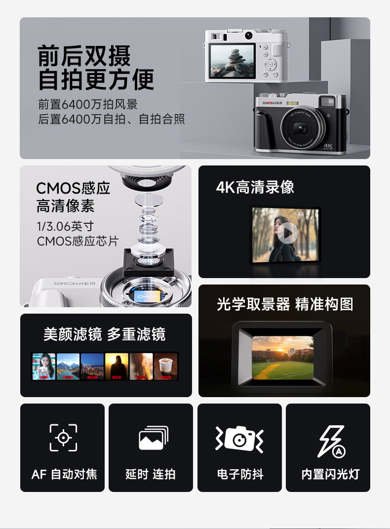 | Color Classification | [Single Camera Model] Dark Black [6400W Pixels + 4K High-Definition Recording + Af Intelligent Focus + Beauty Filter],[Single Camera Model] Haobai [6400W Pixels + 4K High-Definition Recording + Af Intelligent Focus + Beauty Filter],[Single Camera Model] Caramel Brown [6400W Pixels + 4K Hd Recording + Af Intelligent Focus + Beauty Filter],[Dual Front and Rear Cameras] Dark Black [Dual Front and Rear Cameras + 6400W Pixels + 4K Hd Recording + Af Smart Focus + Beauty Filter],[Dual Front and Rear Cameras] Haobai [Dual Front and Rear Cameras + 6400W Pixels + 4K High-Definition Recording + Af Intelligent Focus + Beauty Filter],[Dual Front and Rear Cameras] Dark Black + Camera Bag [Dual Front and Rear Cameras + 6400W Pixels + 4K High-Definition Recording + Af Smart Focus + Beauty Filter],[Dual Front and Rear Cameras] Haobai + Camera Bag [Dual Front and Rear Cameras + 6400W Pixels + 4K High-Definition Recording + Af Intelligent Focus + Beauty Filter],[Dual Front and Rear Cameras] Dark Black + Flash [Dual Front and Rear Cameras + 6400W Pixels + 4K Hd Recording + Af Smart Focus + Beauty Filter],[Dual Front and Rear Cameras] Haobai + Flash [Dual Front and Rear Cameras + 6400W Pixels + 4K Hd Recording + Af Smart Focus + Beauty Filter],【Package Description: Standard Official Configuration - No Memory Card】Please Do Not Purchase This Option |
