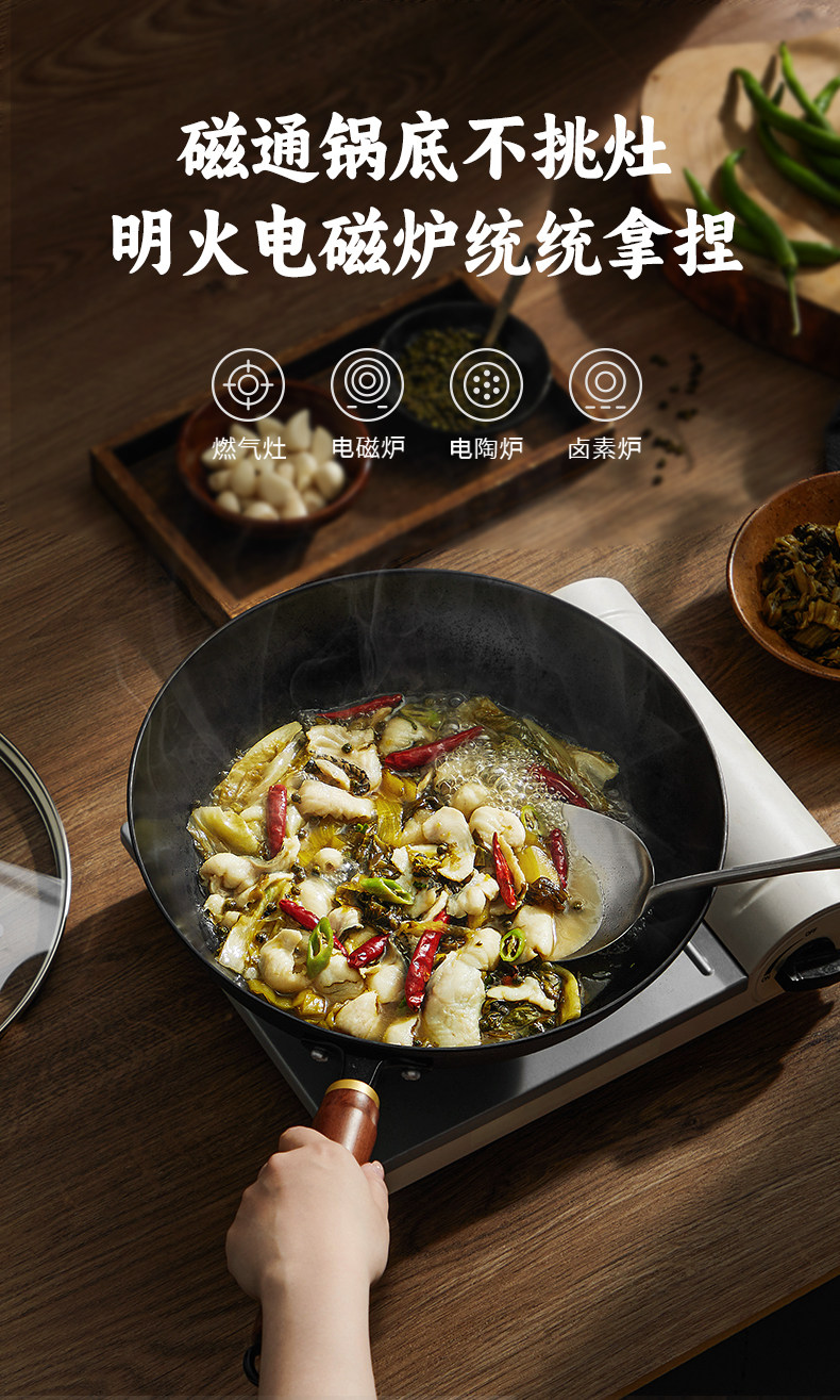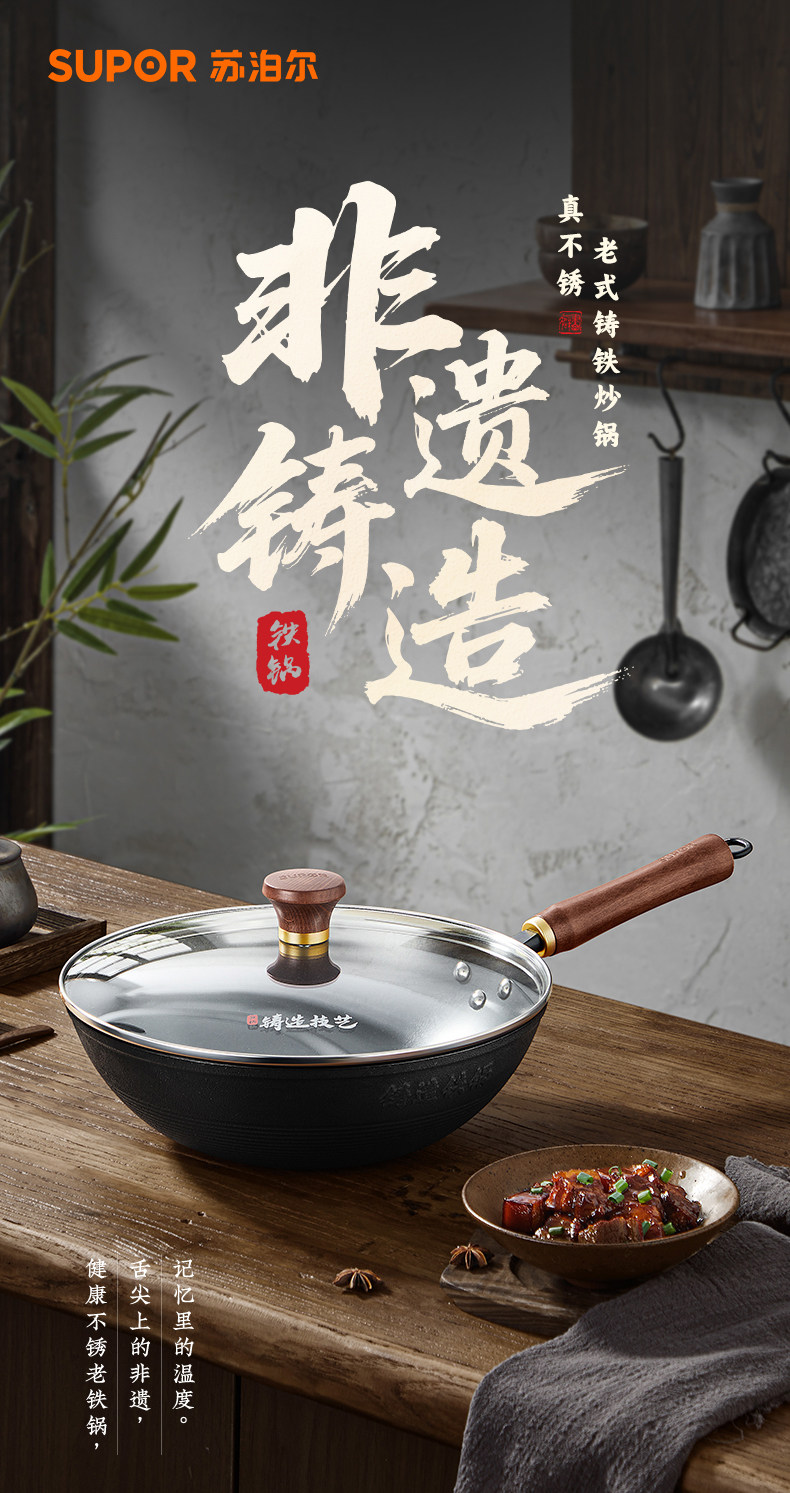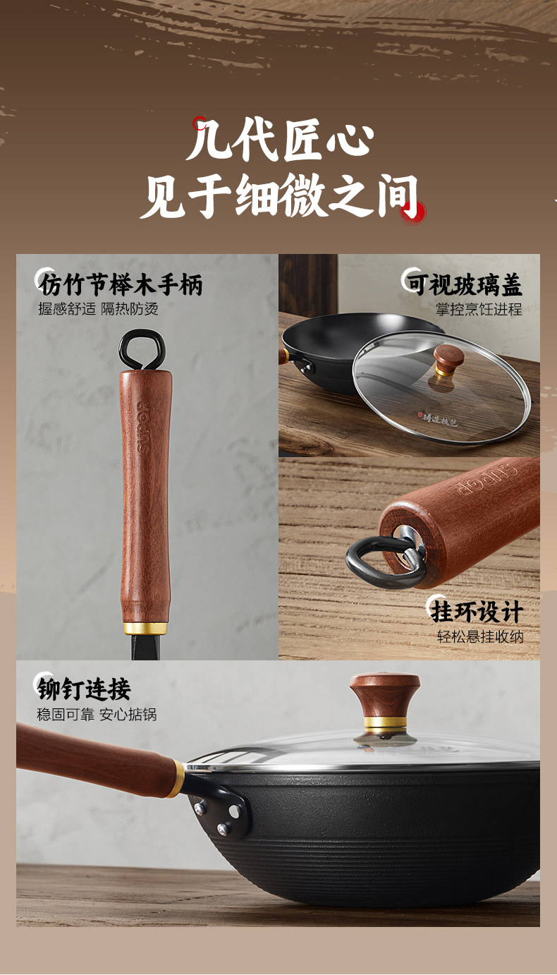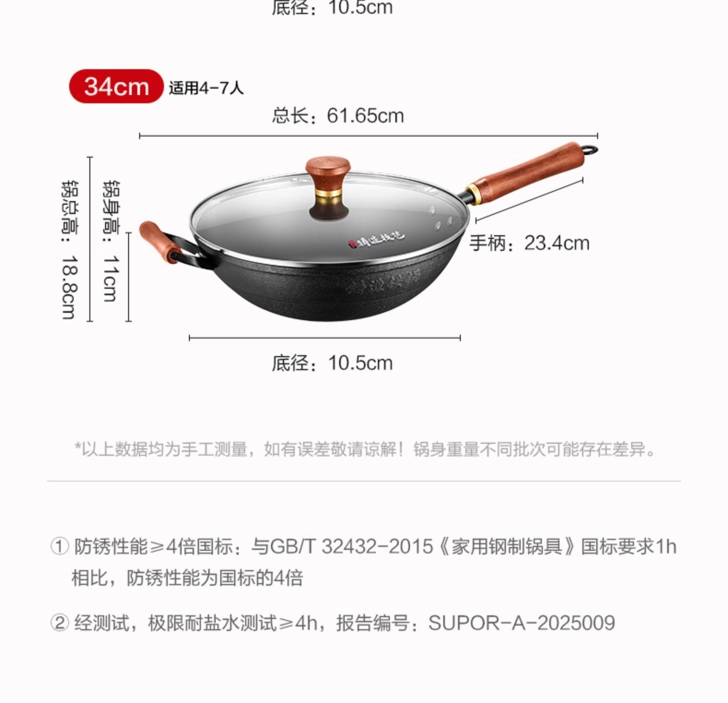 Supor Traditional Uncoated Cast Iron Wok for Home Cooking, Non-Stick Frying Pan, Traditional Craftsmanship, Suitable for Gas and Induction Cookers