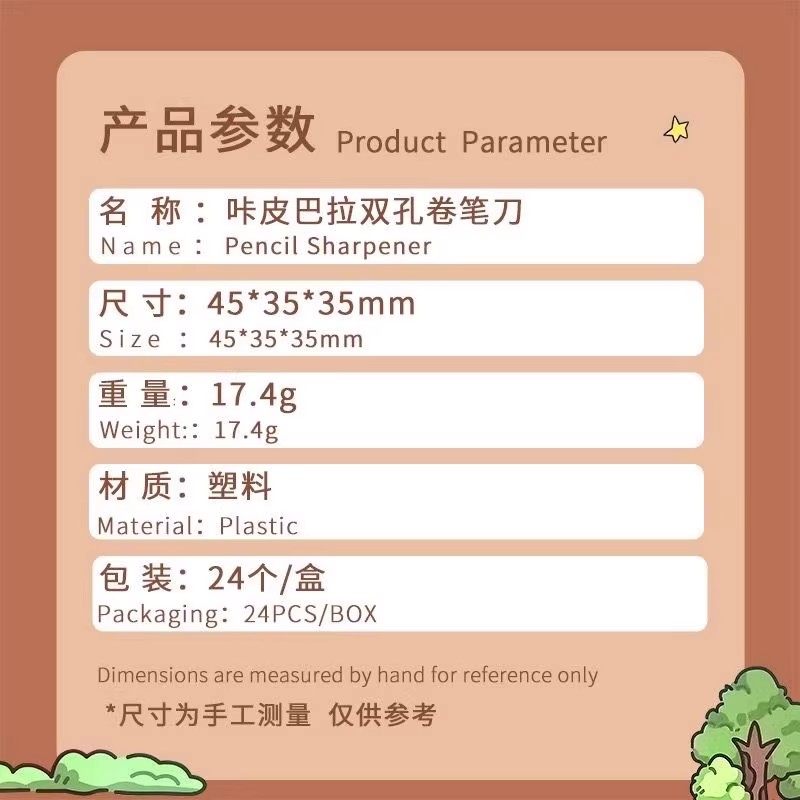 | Classification | [Shoot One and Two]Capybara Dual-Hole Pencil Sharpener[2 Pack],Capybara Dual-Hole Pencil Sharpener[1 Pack],Loss Momentum: Stainless Steel-Artist[1 Pack] |