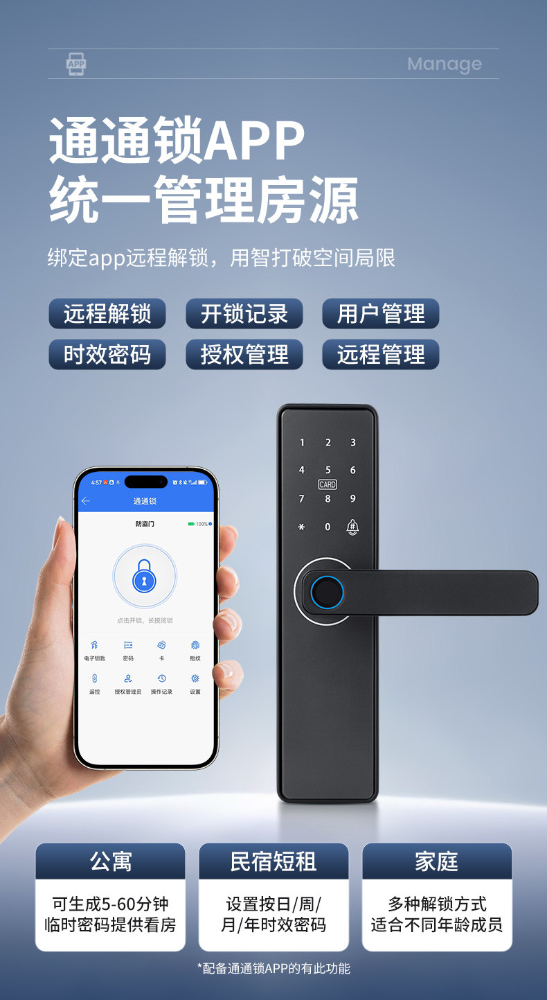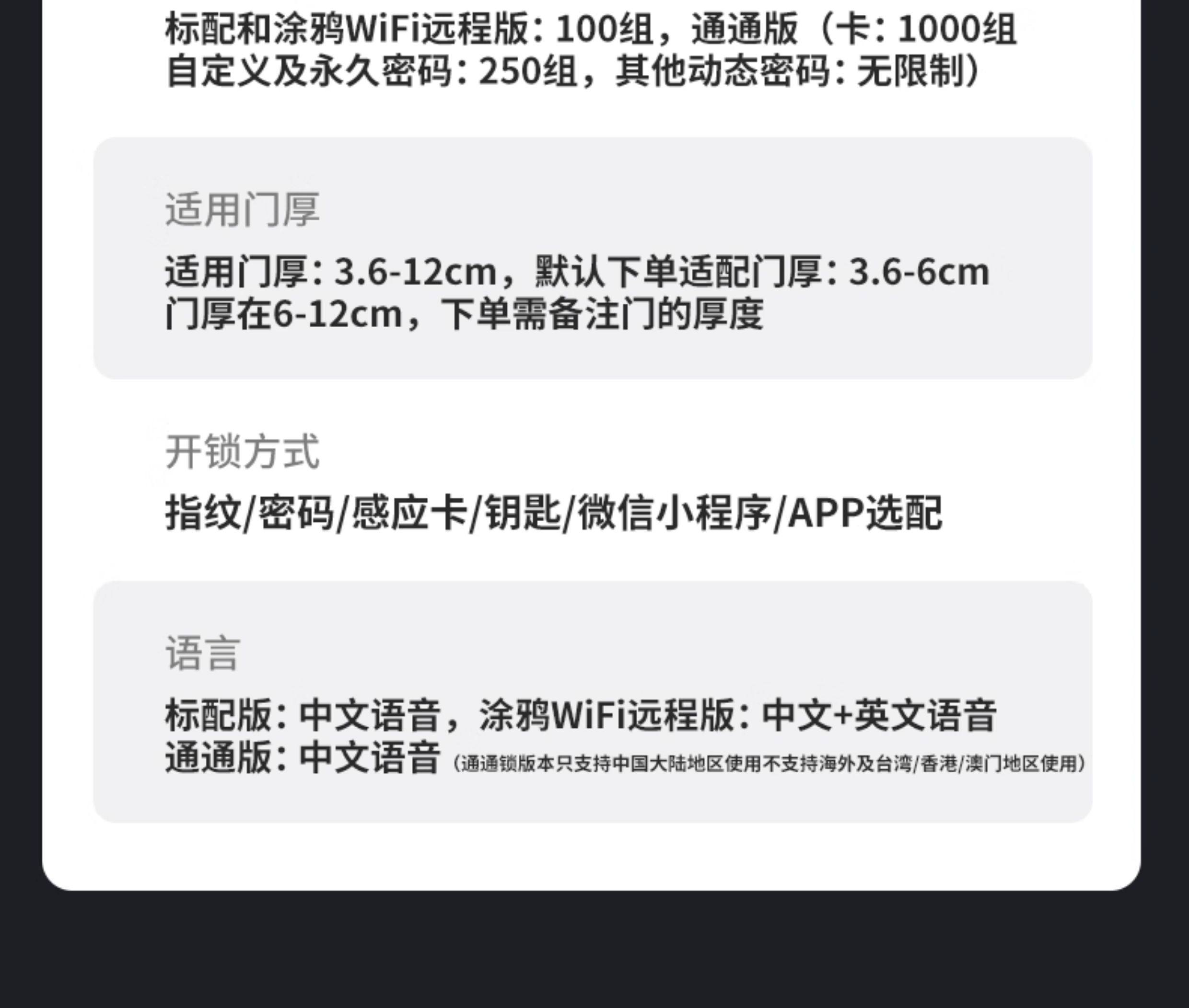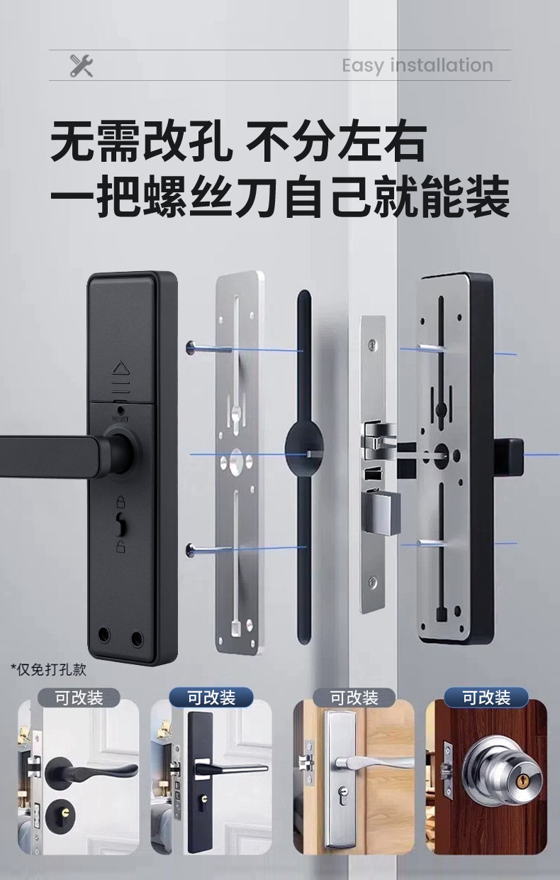 | Finish Color | Fixed Hole Spacing-*Special Offer Standard Version*[Fingerprint + Password + Card Swipe + Key + Remote Temporary Password]Guided Installation,Fixed Hole Spacing-*Special Offer Standard Version*[Fingerprint + Password + Card Swipe + Key + Remote Temporary Password]Door-To-Door Installation,Fixed Hole Spacing-*Special Tuya Wifi Remote Model*[Fingerprint + Password + Card Swipe + Key + Remote Temporary Password]Door-To-Door Installation,▼Household Wooden Doors/Office Use▼Indoor One-Click Reverse Lock,Standard Model - Adjustable Hole Spacing (Fingerprint + Password + Card Swipe + Key + Nfc + Remote Password) Guided Installation,Standard Model - Adjustable Hole Spacing (Fingerprint + Password + Card Swipe + Key + Nfc + Remote Password) Door-To-Door Installation,Tuya Wifi Remote - Adjustable Hole Spacing (6 Unlocking Methods + Remote Unlocking) - Installation Guide,Tuya Wifi Remote - Adjustable Hole Spacing (6 Types of Unlocking + Remote Unlocking) Door-To-Door Installation,Fingerprint Pass-All Model - Adjustable Hole Spacing (6 Unlocking Methods + Mobile App Management) - Includes Installation Guide,Fingerprint Pass-Through Model - Adjustable Hole Spacing (6 Unlocking Methods + Mobile App Management) - On-Site Installation Available,▼Tongtong Lock App: Specifically for Hotels, Apartments, and Homestays (Customizable Timed Unlock Available)▼,Tongtong Bluetooth Model - Can Be Set to Open Regularly (6 Types of Unlocking + Tongtong Lock Management/B&B/Rental House) Guidance on Installation,Tongtong Bluetooth Model - Can Be Set to Open Regularly (6 Types of Unlocking + Tongtong Lock Management/B&B/Rental House) Door-To-Door Installation,Connected All-In-One Smart Lock - Remote Mobile Control (6 Unlocking Methods + Wifi Remote Smart Control/Airbnb/Rental Property) - Includes Installation Guidance,Connected All-In-One Smart Lock - Remote Mobile Control (6 Unlocking Methods + Wifi Remote Smart Control/Airbnb/Rental Property) - Professional Installation Available |