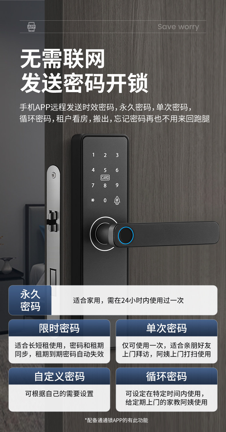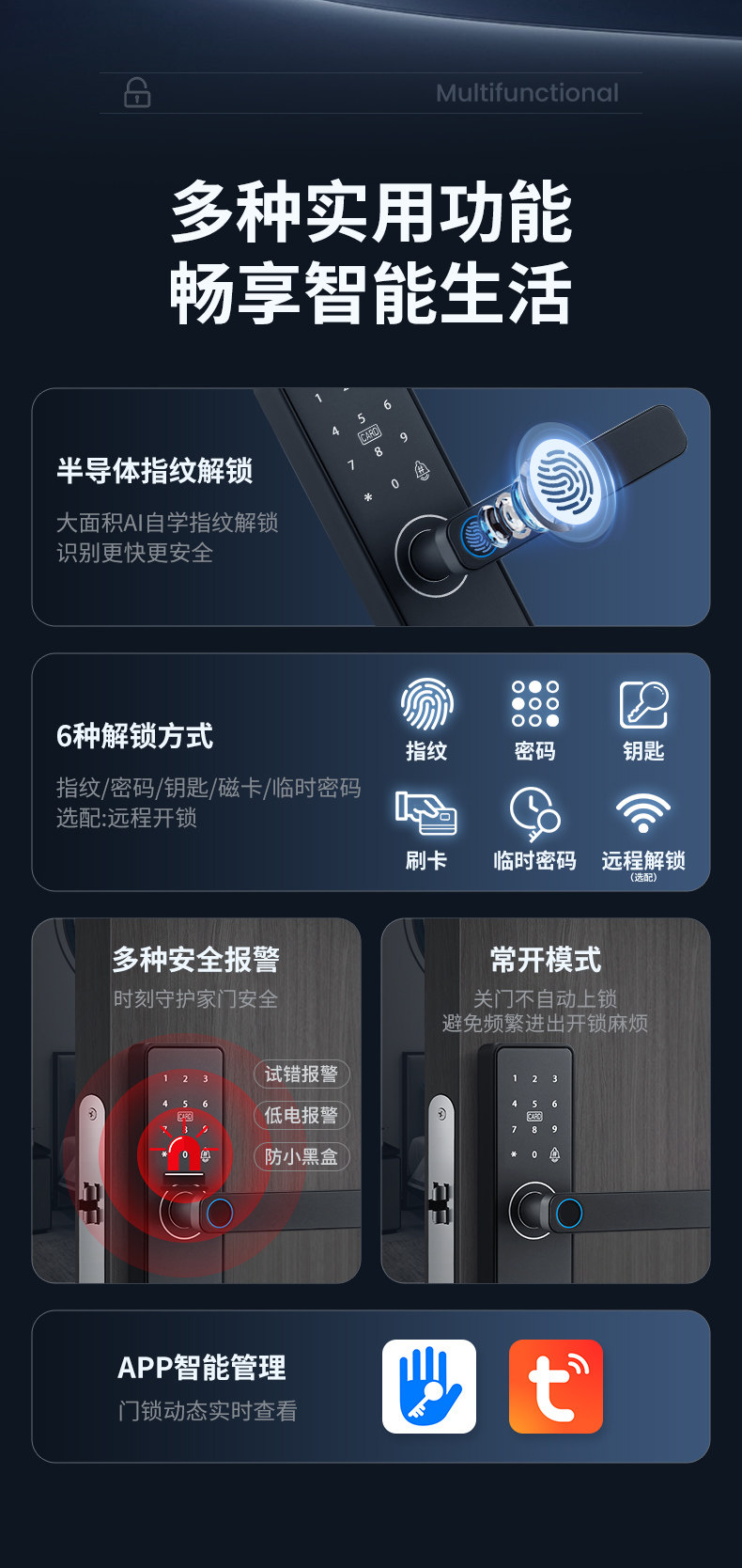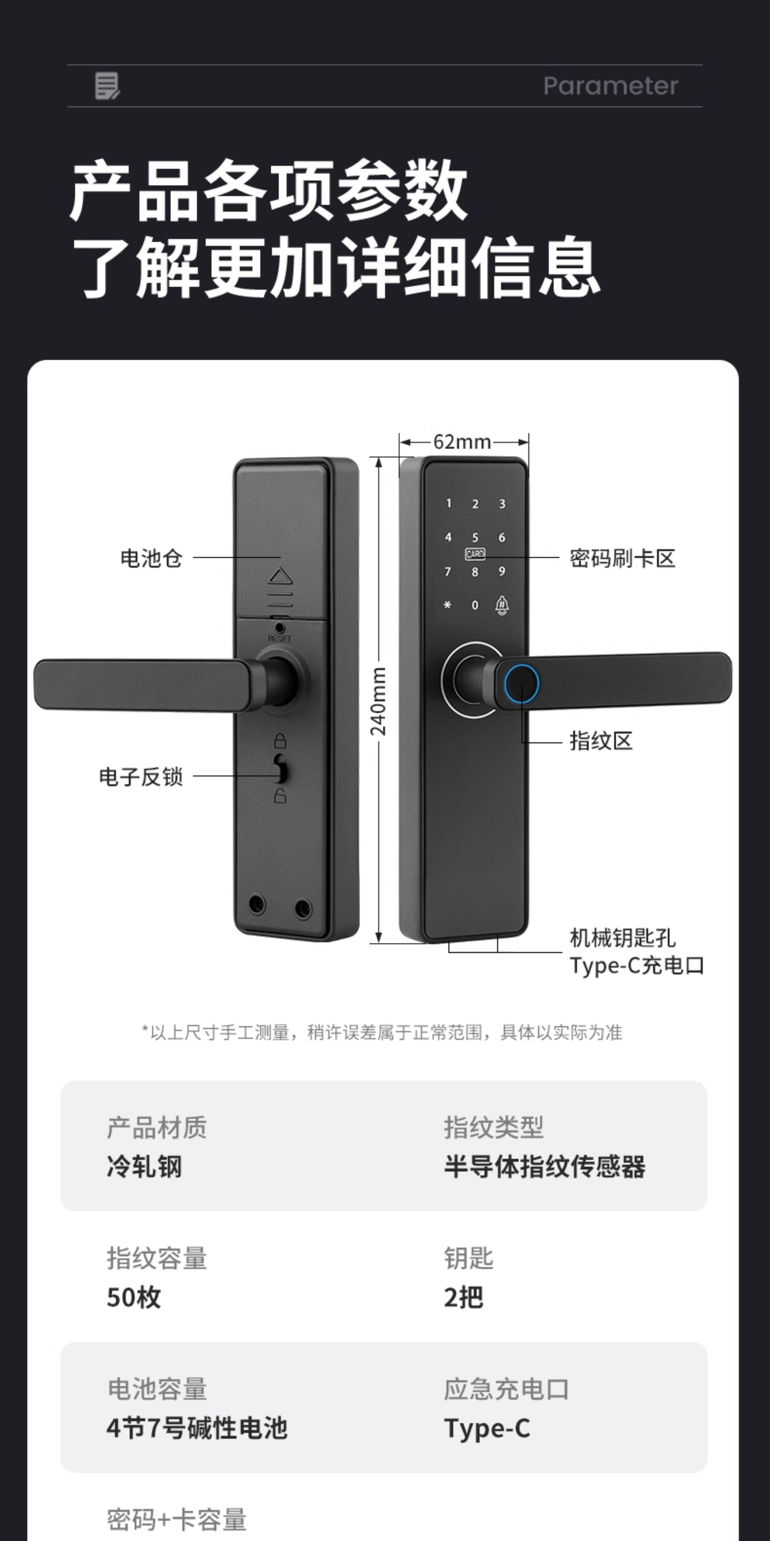 | Finish Color | Fixed Hole Spacing-*Special Offer Standard Version*[Fingerprint + Password + Card Swipe + Key + Remote Temporary Password]Guided Installation,Fixed Hole Spacing-*Special Offer Standard Version*[Fingerprint + Password + Card Swipe + Key + Remote Temporary Password]Door-To-Door Installation,Fixed Hole Spacing-*Special Tuya Wifi Remote Model*[Fingerprint + Password + Card Swipe + Key + Remote Temporary Password]Door-To-Door Installation,▼Household Wooden Doors/Office Use▼Indoor One-Click Reverse Lock,Standard Model - Adjustable Hole Spacing (Fingerprint + Password + Card Swipe + Key + Nfc + Remote Password) Guided Installation,Standard Model - Adjustable Hole Spacing (Fingerprint + Password + Card Swipe + Key + Nfc + Remote Password) Door-To-Door Installation,Tuya Wifi Remote - Adjustable Hole Spacing (6 Unlocking Methods + Remote Unlocking) - Installation Guide,Tuya Wifi Remote - Adjustable Hole Spacing (6 Types of Unlocking + Remote Unlocking) Door-To-Door Installation,Fingerprint Pass-All Model - Adjustable Hole Spacing (6 Unlocking Methods + Mobile App Management) - Includes Installation Guide,Fingerprint Pass-Through Model - Adjustable Hole Spacing (6 Unlocking Methods + Mobile App Management) - On-Site Installation Available,▼Tongtong Lock App: Specifically for Hotels, Apartments, and Homestays (Customizable Timed Unlock Available)▼,Tongtong Bluetooth Model - Can Be Set to Open Regularly (6 Types of Unlocking + Tongtong Lock Management/B&B/Rental House) Guidance on Installation,Tongtong Bluetooth Model - Can Be Set to Open Regularly (6 Types of Unlocking + Tongtong Lock Management/B&B/Rental House) Door-To-Door Installation,Connected All-In-One Smart Lock - Remote Mobile Control (6 Unlocking Methods + Wifi Remote Smart Control/Airbnb/Rental Property) - Includes Installation Guidance,Connected All-In-One Smart Lock - Remote Mobile Control (6 Unlocking Methods + Wifi Remote Smart Control/Airbnb/Rental Property) - Professional Installation Available |