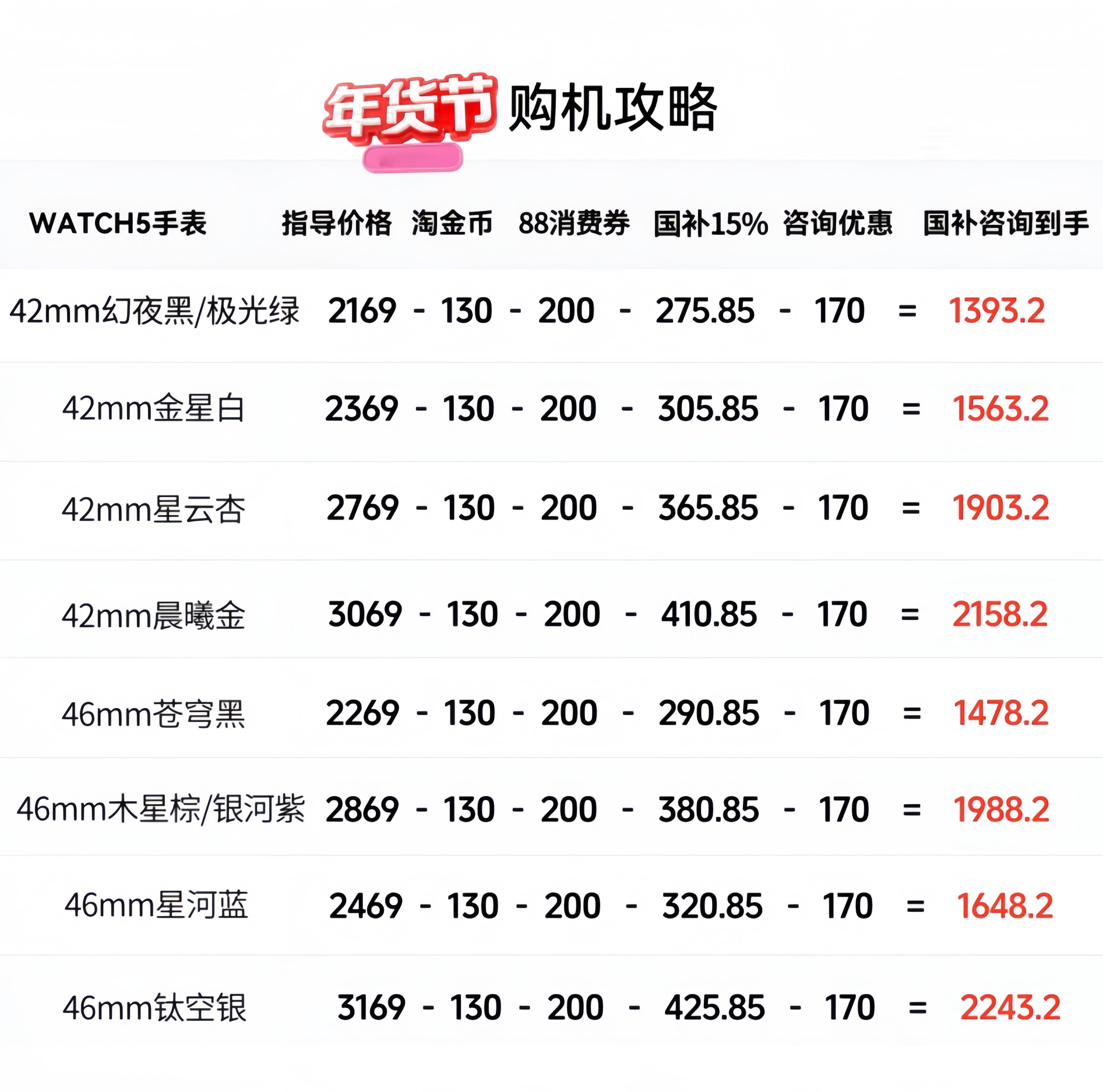 | Appearance Color | Price Guarantee during Spring Festival|Consult and Receive a Coupon for an Additional 200 Off.|Price Comparison Across the Entire Network,[10Th Anniversary Limited Edition] Huawei Watch5 [46mm Blue] Free Watch Strap/Protective Case + 100 Yuan Gift,[10Th Anniversary Limited Edition] Huawei Watch5 [42mm Blue] Free Watch Strap/Protective Case + 100 Yuan Gift,Huawei Watch 5 [42mm Phantom Black] Comes with Free Strap/Case + Gift,Huawei Watch 5 [46mm Sky Black] Comes with Free Strap/Case + Gift,Huawei Watch 5 [42mm Aurora Green] Comes with Free Strap/Case + Gift,Huawei Watch 5 [46mm Galaxy Blue] Comes with Free Strap/Case + Gift,[Wu Lei’S Same Style as the Star] Huawei Watch 5 [46mm Galaxy Purple] Comes with Free Strap/Case + Gift,Huawei Watch 5 [46mm Jupiter Brown] Comes with Strap/Case + Gift,Huawei Watch 5 [46mm Titanium Silver] Comes with Free Strap/Case + Gift,Huawei Watch 5 [42mm Venus White] Comes with Free Strap/Case + Gift,Huawei Watch 5 [42mm Nebula Apricot] Comes with Free Strap/Case + Gift,Huawei Watch 5 [42mm Dawn Gold] Comes with Free Strap/Case + Gift,Upgrade Package [46mm Sky Black] + Black Titanium Alloy Strap,Upgrade Package [46mm Galaxy Purple] + Purple Titanium Alloy Strap,Upgrade Package [46mm Jupiter Brown] + Silver Titanium Alloy Strap,[Ultimate Package] Watch5 [Sky Black] + Space Exploration Same Style Black Steel Belt,[Premium Package] Watch5 [Sky Black] + Exclusive Edition Black Steel Belt,[Premium Package] Watch5 [Sky Black] + Black Gold Three Steel Belts,[Premium Package] Watch5 [Sky Black] + Exclusive Edition Titanium Black Strap,[Premium Package] Watch5 [Jupiter Brown] + Exclusive Edition Titanium Silver Strap,[Premium Package] Watch5 [Jupiter Brown] + Titanium Sky Silver Same Style Strap,[Premium Package] Watch5 [Jupiter Brown] + Titanium Silver Strap,[Premium Package] Watch5 [Jupiter Brown] + Black Gold Three Steel Belts,Watch5 [Galaxy Blue] + Galaxy Purple Same Style Composite Belt (Original Quality),Watch5 [Galaxy Blue] + Jupiter Brown Same Style Composite Belt (Original Quality),New Year Limited Gift Box [46Mm--Sky Black],New Year Limited Gift Box [46Mm--Jupiter Brown],New Year Limited Gift Box [42mm Magic Moon Black],New Year Limited Gift Box [42Mm--Venus White],Huawei New Year Gift Box [42mm Phantom Black] + New Year Limited Gift,Huawei New Year Gift Box [42mm Venus White] + New Year Limited Gift,Huawei New Year Gift Box [46mm Sky Black] + New Year Limited Gift,Huawei New Year Gift Box [46mm Jupiter Brown] + New Year Limited Gift,Huawei Watch5 [46mm Blue] Comes with a Strap/Protective Case + a Gift of 100 Yuan,Huawei Watch5 [42mm Blue] Comes with Free Strap/Protective Case + 100 Yuan Gift,[Premium Package] Watch5 [Sky Black] + Black Milan Magnetic Titanium Strap,[Premium Package] Watch5 [Jupiter Brown] + Silver Milan Magnetic Titanium Strap,[Premium Package] Watch5 [Galaxy Blue] + Silver Milan Magnetic Titanium Strap,Inquire Now and Get an Extra $350 Off!|Free Huawei Body Fat Scale|Choose Any 2 Watch Straps,Huawei Watch 5 [42mm Phantom Black] Comes with Strap/Case + Gift Bag,Huawei Watch 5 [46mm Sky Black] Comes with Strap/Case + Gift Bag,Huawei Watch 5 [42mm Aurora Green] Comes with Strap/Case + Gift Bag,Huawei Watch 5 [46mm Galaxy Blue] Comes with Strap/Case + Gift Bag,[Wu Lei's Same Style as the Star] Huawei Watch 5 [46mm Galaxy Purple] Comes with Free Strap/Case + Gift Bag,Huawei Watch 5 [46mm Jupiter Brown] Comes with Strap/Case + Gift Bag,Huawei Watch 5 [42mm Venus White] Comes with Strap/Case + Gift Bag,Huawei Watch 5 [46mm Titanium Silver] Comes with Strap/Case + Gift Bag,Huawei Watch 5 [42mm Nebula Apricot] Comes with Strap/Case + Gift Bag,Huawei Watch 5 [42mm Dawn Gold] Comes with Free Strap/Case + Gift Bag,Watch 5 [46mm Sky Black] + Black Titanium Alloy Strap,Watch 5 [46mm Jupiter Brown] + Silver Titanium Alloy Strap,Watch 5 [46mm Galaxy Purple] + Purple Titanium Alloy Strap,[Premium Package] Huawei Watch5 [Sky Black] + Space Exploration Same Style Black Steel Band,[Premium Package] Huawei Watch5 [Sky Black] + Exclusive Edition Black Steel Band,[Premium Package] Huawei Watch5 [Sky Black] + Black Gold Three Steel Belts,[Premium Package] Huawei Watch5 [Sky Black] + Exclusive Edition Titanium Black Strap,[Premium Package] Huawei Watch5 [Jupiter Brown] + Exclusive Edition Titanium Silver Strap,[Premium Package] Huawei Watch5 [Jupiter Brown] + Titanium Sky Silver Same Style Strap,[Premium Package] Huawei Watch5 [Jupiter Brown] + Titanium Silver Strap,[Premium Package] Huawei Watch5 [Jupiter Brown] + Black Gold Three Steel Belts,Huawei Watch5 [Galaxy Blue] + Jupiter Brown Same Style Composite Belt (Original Quality),Huawei Watch5 [Galaxy Blue] + Galaxy Purple Same Style Composite Belt (Original Quality),Xinyue Gift Box [46mm Sky Black],Xinyue Gift Box [46mm Jupiter Brown],Xinyue Gift Box [46mm Galaxy Purple],Xinyue Gift Box [42mm Venus White],Xinyue Gift Box [42mm Magic Moon Black],Christmas Limited Gift Box [42Mm--Aurora Green],Christmas Limited Gift Box [42Mm--Venus White],Christmas Limited Gift Box [46Mm--Sky Black],Christmas Limited Gift Box [46Mm--Jupiter Brown] |