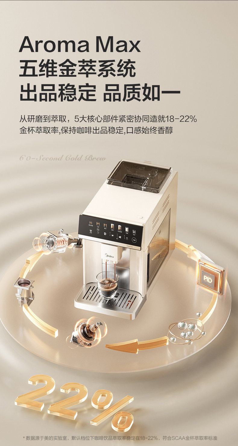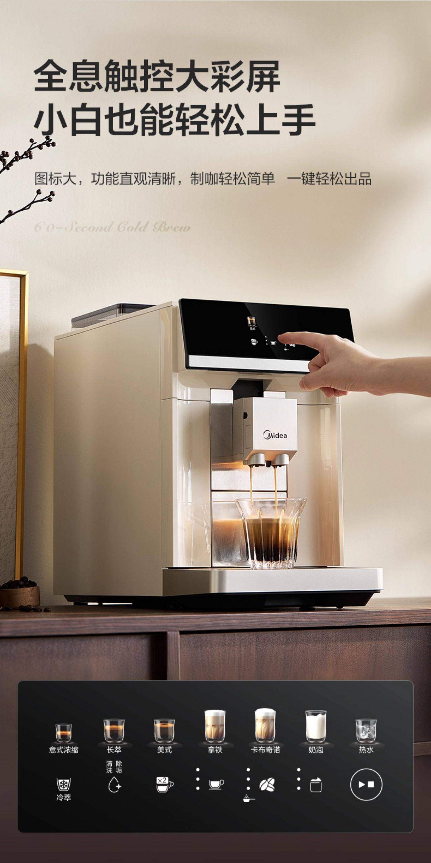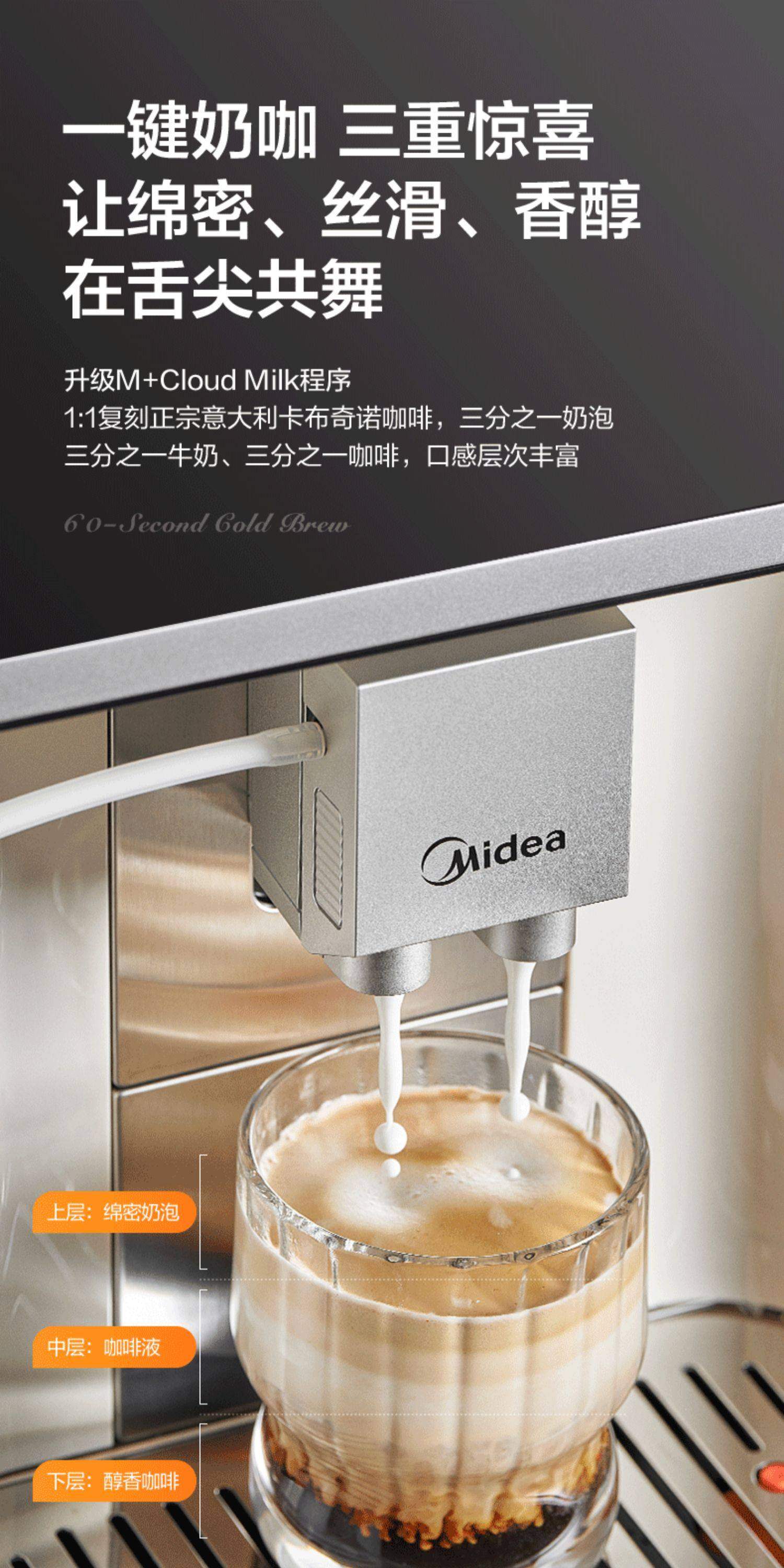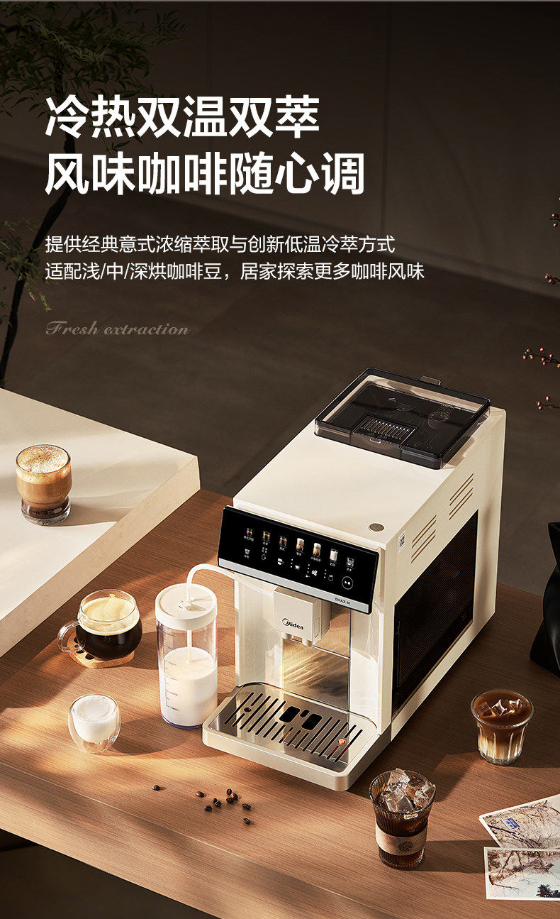 Midea Fully Automatic Coffee Machine with Dual Temperature Extraction, One-Touch Milk Frothing, Home-Use Freshly Ground Espresso Machine with Integrated Grinder and Self-Cleaning Function