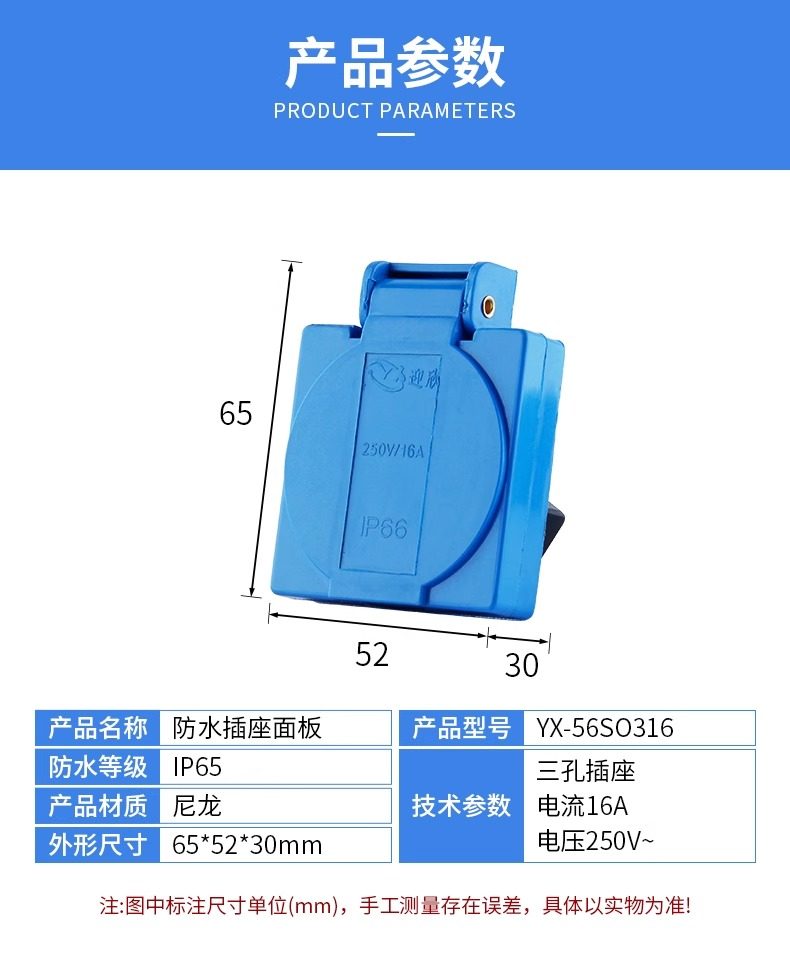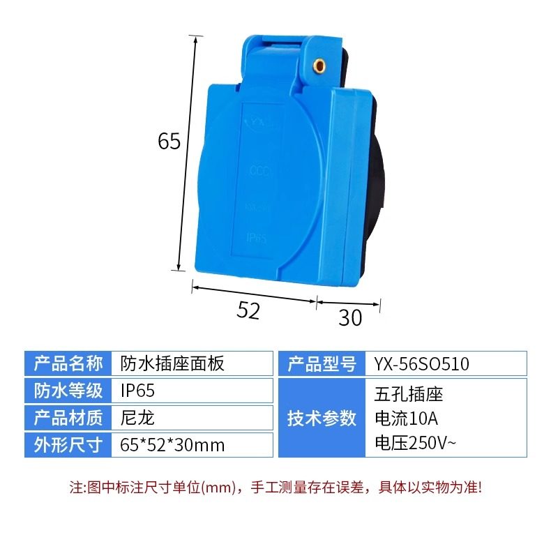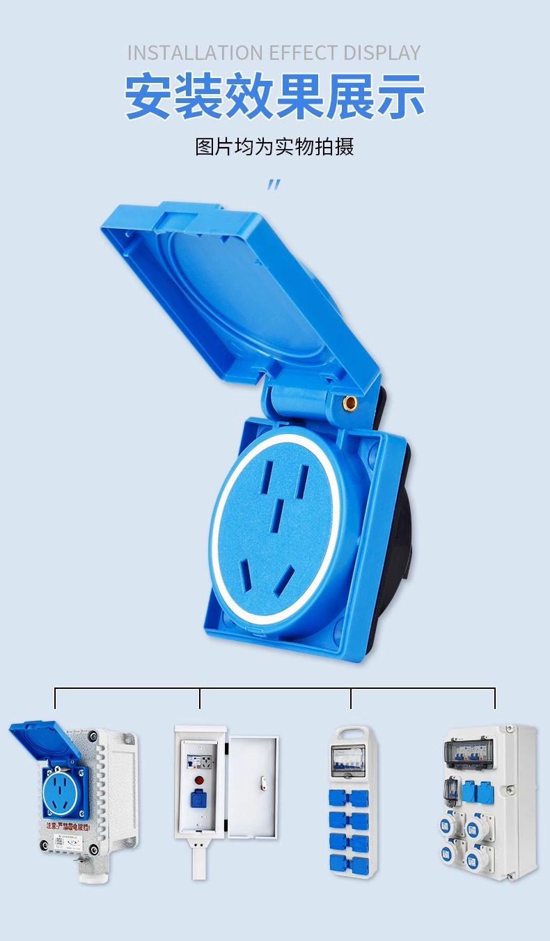 | Color Classification | 5 Holes 10A (Blue Panel),5 Holes 10A (Black Panel),3 Holes 16A (Blue Panel),3 Holes 16A (Black),Plastic Waterproof Socket One Position (Five Holes 10A),Plastic Waterproof Socket Two Positions (Five Holes 10A),Plastic Waterproof Socket Three Positions (Five Holes 10A),Plastic Waterproof Socket Four Positions (Five Holes 10A),Plastic Waterproof Socket Six Positions (Five Holes 10A),Cast Aluminum Socket One Position (Five Holes 10A),Cast Aluminum Socket Two Positions (Five Holes 10A),Cast Aluminum Socket Three Positions (Five Holes 10A),Cast Aluminum Socket Four Positions (Five Holes 10A),Cast Aluminum Socket Six Positions (Five Holes 10A),3 Holes 16A Please Contact Customer Service,Panel Color Can Be Changed as Required |