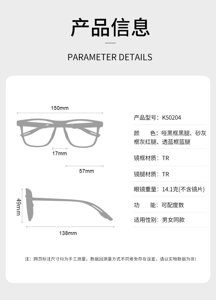 | Color Classification | Transparent Blue Frame and Blue Legs (Can Be Tried On, No Reason to Return or Exchange Within 7 Days),Sand Grey Frame, Grey-Red Temples (Try-On Available, 7-Day Hassle-Free Returns),Matte Black Frame, Black Temples (Try-On Available, 7-Day Hassle-Free Returns),Frame + 1.56 Ultra-Thin Lenses [Comes with Anti-Fog Lens Cloth] [Suitable for 0-300 Degrees, Astigmatism 0-200 Degrees],Frame + 1.60 Ultra-Thin Lenses [Comes with Anti-Fog Lens Cloth] [Suitable for 0-500 Degrees, Astigmatism 0-200 Degrees],Frame + 1.67 Ultra-Thin Lenses [Suitable for 0-800 Degrees, Astigmatism 0-200 Degrees],Frame + 1.67 Ultra-Thin Double-Sided Aspherical Lenses [Suitable for 0-1000 Degrees, Astigmatism 0-200 Degrees],Frame + 1.74 Ultra-Thin Lenses [Comes with Anti-Fog Lens Cloth] [Suitable for 0-1200 Degrees, Astigmatism 0-200 Degrees],Frame + 1.56 Anti-Fog Lenses [Comes with Anti-Fog Lens Cloth] [Suitable for 0-300 Degrees, Astigmatism 0-200 Degrees],Frame + 1.60 Anti-Fog Lenses [Comes with Anti-Fog Lens Cloth] [Suitable for 0-500 Degrees, Astigmatism 0-200 Degrees],Frame + 1.67 Anti-Fog Lenses [Comes with Anti-Fog Lens Cloth] [Suitable for 0-800 Degrees, Astigmatism 0-200 Degrees],Frame + 1.56 Anti-Blue Light Lenses [Comes with Anti-Fog Lens Cloth] [Suitable for 0-300 Degrees, Astigmatism 0-200 Degrees],Frame + 1.60 Anti-Blue Light Lenses [Comes with Anti-Fog Lens Cloth] [Suitable for 0-500 Degrees, Astigmatism 0-200 Degrees],Frame + 1.67 Anti-Blue Light Lenses [Comes with Anti-Fog Lens Cloth] [Suitable for 0-800 Degrees, Astigmatism 0-200 Degrees],Frame + 1.74 Anti-Blue Light Lenses [Comes with Anti-Fog Lens Cloth] [Suitable for 0-1200 Degrees, Astigmatism 0-200 Degrees],Frame + 1.56 Gray Lenses [Comes with Anti-Fog Lens Cloth] [Suitable for 0-300 Degrees, Astigmatism 0-200 Degrees],Frame + 1.56 Photochromic Brown Lenses [Includes Anti-Fog Cleaning Cloth] [Suitable for -0.00 to -3.00 Diopters, Astigmatism -0.00 to -2.00 Diopters],Frame +1.56 Gray Anti-Blue Light [Comes with Anti-Fog Lens Cloth] [Suitable for 0-300 Degrees, Astigmatism 0-200 Degrees],Frame +1.60 Gray Anti-Blue Light [Comes with Anti-Fog Lens Cloth] [Suitable for 0-500 Degrees, Astigmatism 0-200 Degrees],Add to Favorites + Add to Cart = Free Mirror Case Gift Set (Do Not Purchase This Item Separately) |