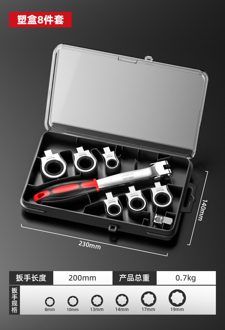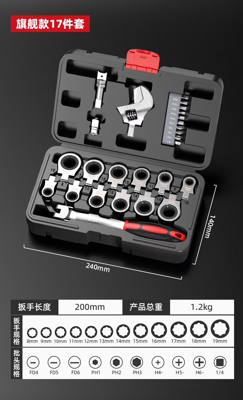 | Color Classification | 72-Tooth Ratchet Wrench 6-12 (7 Pieces) + Storage Bag,72-Tooth Ratchet Wrench 9-15 (7 Pieces) + Storage Bag,72-Tooth Interchangeable Ratchet Wrench 8-19 (6 Heads) + Storage Box,72-Tooth Interchangeable Head Ratchet Wrench 8-19 (6 Heads) + 10 Bits + Storage Box,72-Tooth Interchangeable Ratchet Wrench 8-19 (12 Heads) + Storage Box,72-Tooth Interchangeable Ratchet Wrench 8-19 (12 Heads) + 10 Bits + Adjustable Wrench Head + Storage Box |
