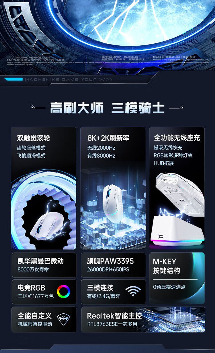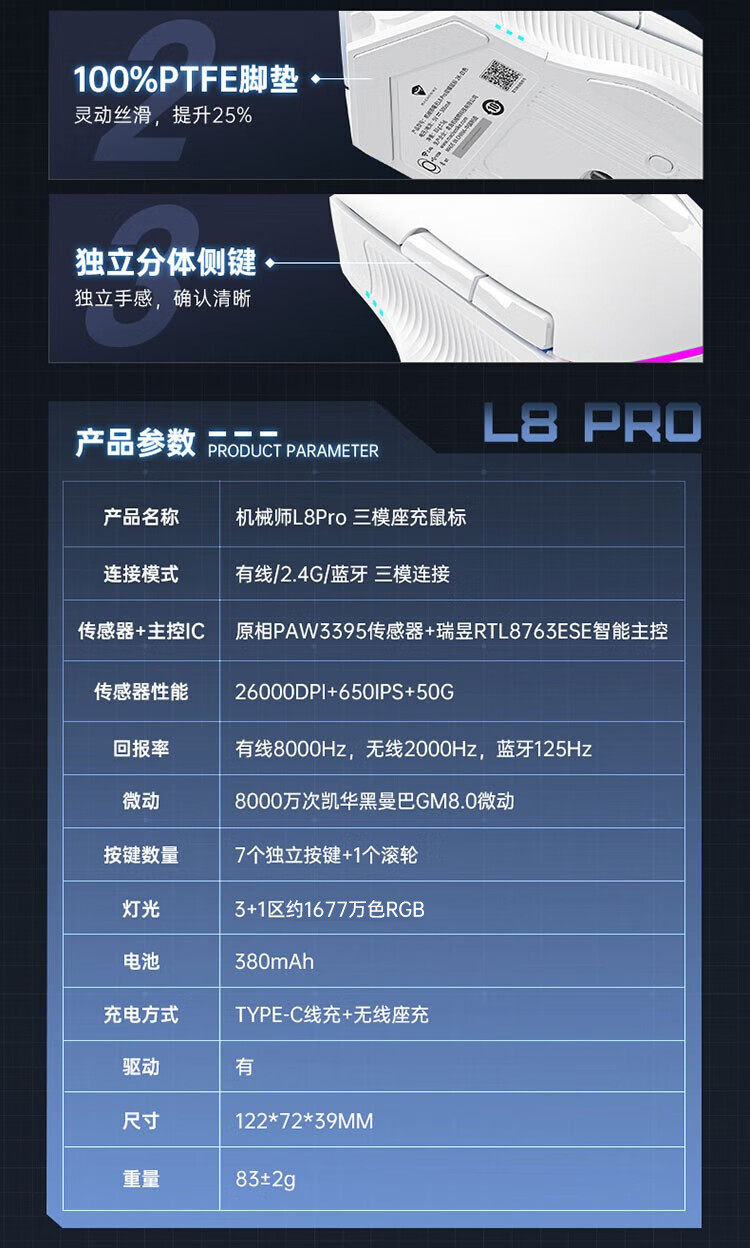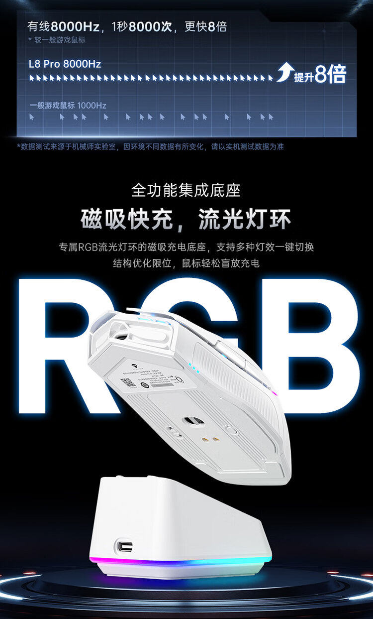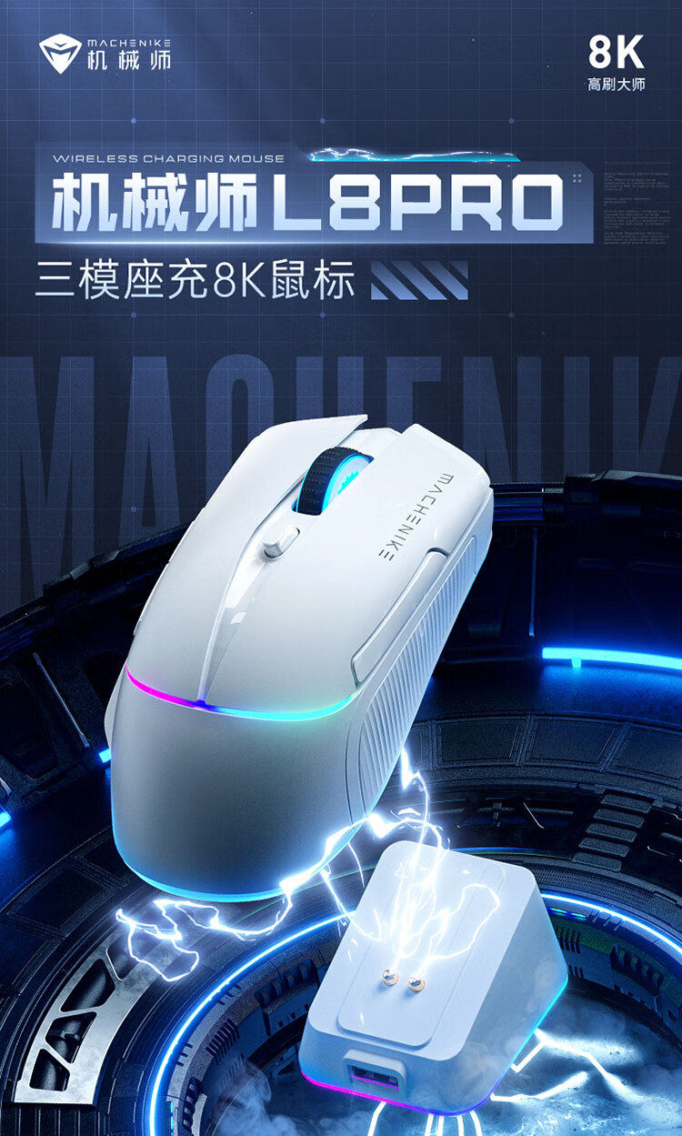 Mechanic L8Pro Three-Mode Gaming Mouse with Charging Dock, 3395 Sensor, Base Included, 8K Polling Rate, Large Hand Size