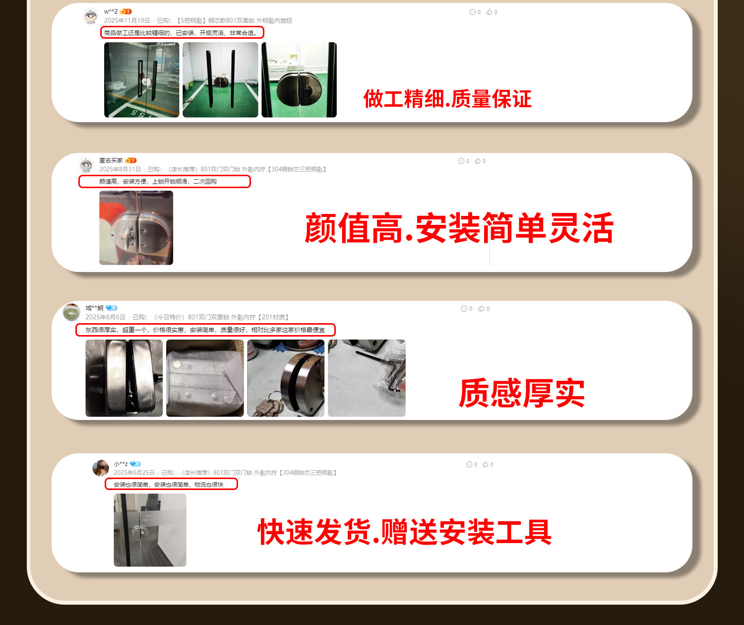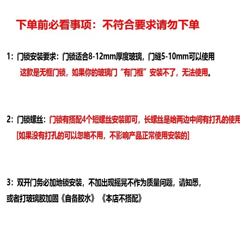 | Color Classification | Please Read This before Placing Your Order: for Double Doors, Please Add a Floor Lock or Glass Glue (You Need to Provide It Yourself). Do Not Purchase This Item,Reminder: if You Don’T Want to Add Glass Glue and Floor Locks to the Double Doors, Please Don’T Take Pictures,Pre-Purchase Instructions: Please Look at the Picture before Placing an Order "Do Not Take This Photo",[Transparent Glass Glue-For Door Locks],(Recommended by the Store Manager) 801 Double Door Double Door Lock, Outer Key and Inner Twist [304 Copper Lock Core and Three Keys],【5 Keys】Copper Core 801 Double-Sided Lock - Exterior Key, Interior Knob,(Today’S Special Offer) 801 Double Door Double-Sided Lock with Outer Key and Inner Twist [201 Material],Type 801 Double Door Double-Sided Lock, Outer Key and Inner Twist [304 Material],【5 Keys】304 Stainless Steel 801 Double-Sided Lock - Exterior Key, Interior Knob,Matt Black 801 Double Door Double-Sided Lock, Outer Key and Inner Twist [304 Material],Titanium 801 Double Door Double-Sided Lock, Outer Key and Inner Twist [304 Material],Rose Gold 801 Double Door Double-Sided Lock, Outer Key and Inner Twist [304 Material],Black Titanium 801 Double Door Double-Sided Lock, Outer Key and Inner Twist [304 Material],803 Double Door Single-Sided Lock Without Outer Key [304 Material],804 Single Door Single Side Lock Without Outer Key [304 Material],802 Single Door Double-Sided Lock, Outer Key and Inner Twist [304 Material],601 Type Double Door Double-Sided Lock, External Key Internal Twist [304 Stainless Steel]. Please Use with a Floor Lock,603 Square Double Door Single-Sided Lock with No Outer Key and No Inner Key [304 Material] Please Add a Floor Lock for Use,602 Square Single Door Double-Sided Lock with Outer Key and Inner Twist [304 Material],604 Square Single Door Single-Sided Lock with No Outer Key [304 Material],701 Double-Sided Double-Door Floor Lock with Three Keys [304 Material],702 Single Door Double-Sided Latch Lock, Outer Key and Inner Twist [304 Material],705 Double Door Single-Sided Latch Lock Single Knob [304 Material],706 Single-Sided Single-Sided Base Single Knob [304 Material],706 Small Square Single-Sided Single-Sided Door Lock Single Knob [304 Material],Set 1: Double-Sided Lock + Single Knob Floor Lock [304 Material],Set 2: Double-Sided Lock + Single Knob Floor Lock [304 Material],Set 3: Double-Sided Lock + Knob Latch [304 Material],Set 4: Double-Sided Lock + Knob Latch [304 Material],704 Single Door One-Way Key Floor Lock [304 Material],703 Double Door One-Way Key Floor Lock [304 Material],Password Model 801 Double Door Double-Sided Lock, External Password and Internal Twist [304 Material],Password Model 802 Single Door Double-Sided Lock, External Password and Internal Twist [304 Material],Password Model 803 Double Door Single-Sided Lock, No External Password Inside [304 Material],Password Model 804 Single Door Single Side Lock, No External Password Inside [304 Material],Combination Lock 601 Square Double Door Double-Sided Lock, External Combination Lock and Internal Twist [304 Material] Please Add Floor Lock for Use,Password Model 602 Square Single Door Double-Sided Lock, External Password and Internal Twist [304 Material],Combination Lock 603 Square Double Door Single-Sided Lock with No External Password and No Internal Password [304 Material] Please Add a Floor Lock for Use,Combination Lock 604 Square Single Door Single Side Lock with No External Password and No Internal [304 Material],Password Model 703 Double Door One-Way Floor Lock [304 Material],Password Model 704 Single Door One-Way Floor Lock [304 Material],(Today’S Special Offer) 801 Double Door Double-Sided Lock, Outer Key and Inner Twist [201 Material] |