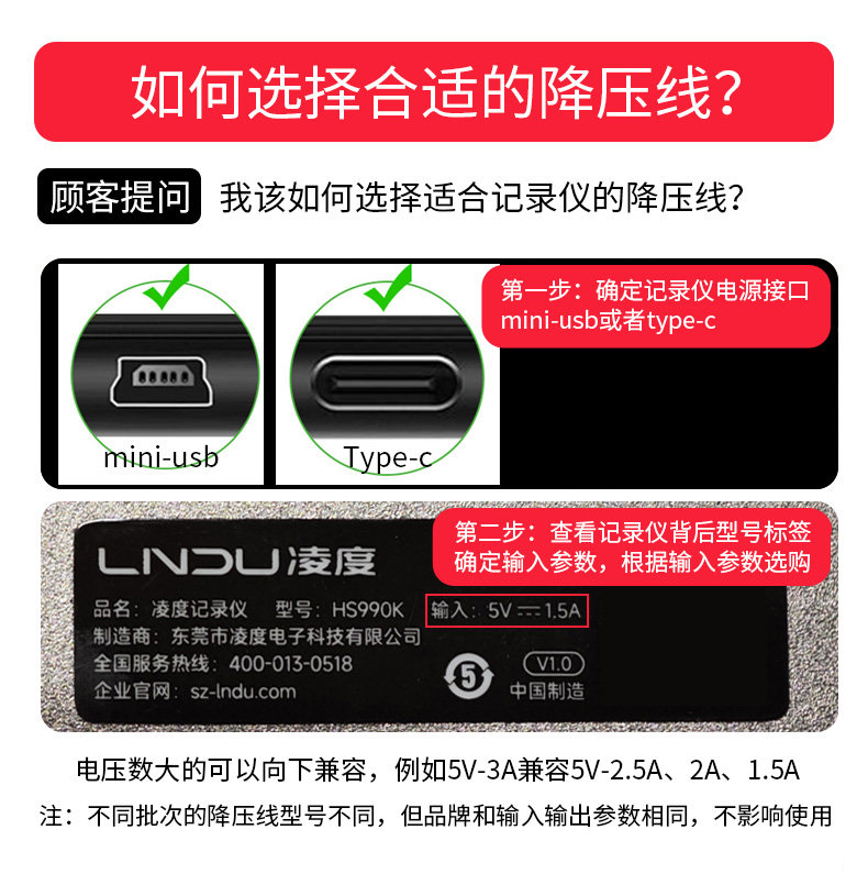 | Color Classification | Please Select the Current and Voltage According to the Label on the Back of the Recorder,Please Select the Interface Type According to the Interface on the Top of the Recorder,[Lingdu Original Factory] Three-Wire Step-Down Cable-5V/2A--Mini USB,[Lingdu Original Factory] Three-Wire Step-Down Cable-5V/2.5A-Mini USB,[Lingdu Original Factory] Three-Wire Step-Down Cable-5V/3A-Mini USB,[Lingdu Original Factory] Three-Wire Step-Down Line-5V/2.5A-Type-C,[Lingdu Original Factory] Three-Wire Step-Down Line-5V/3A-Type-C,[Lingdu Original Factory] Three-Wire Step-Down Line-5V/2A-Type-C,Dual-Wire Step-Down Cable-5V/2.5A-Mini USB |