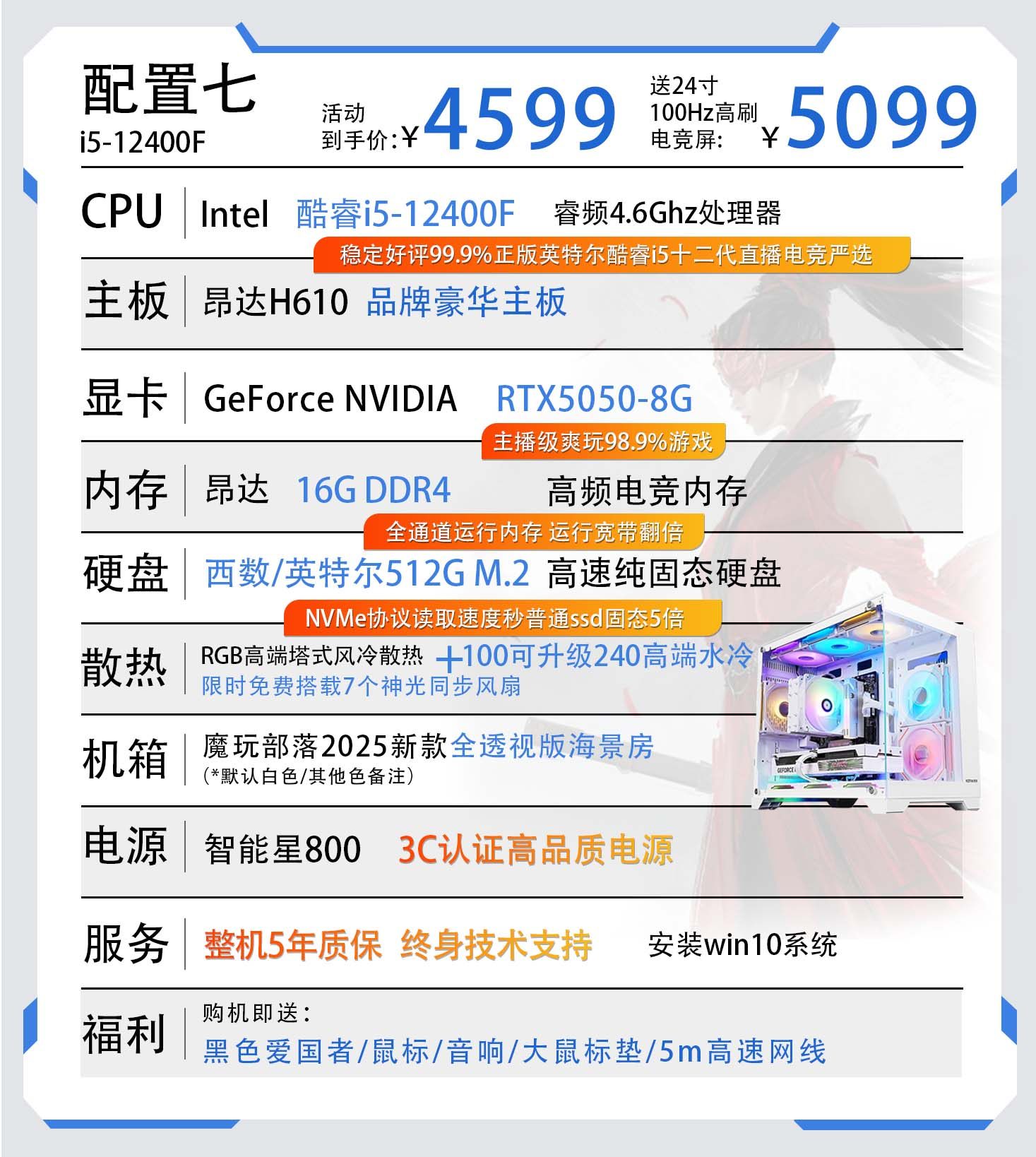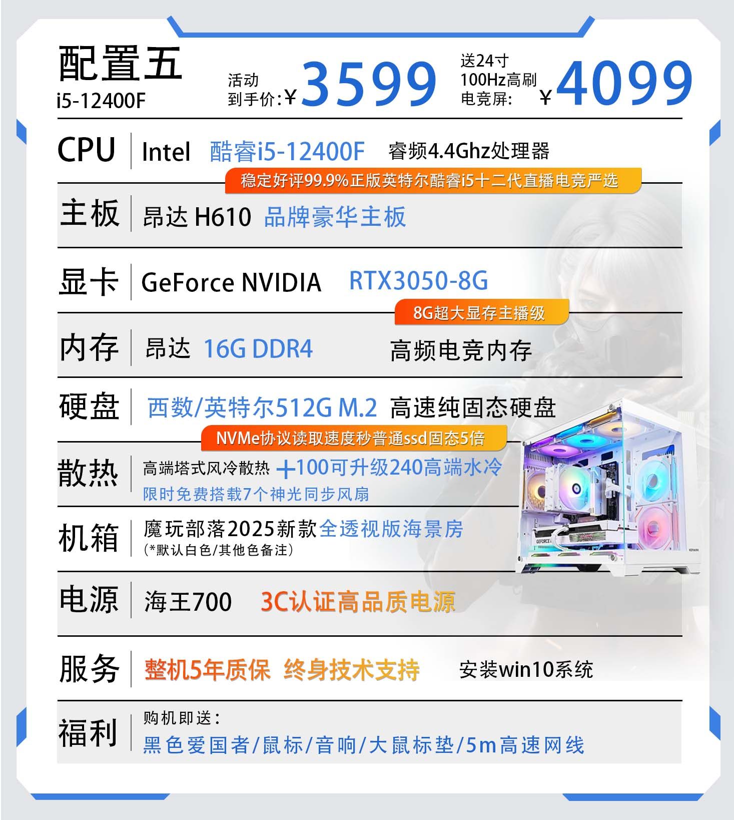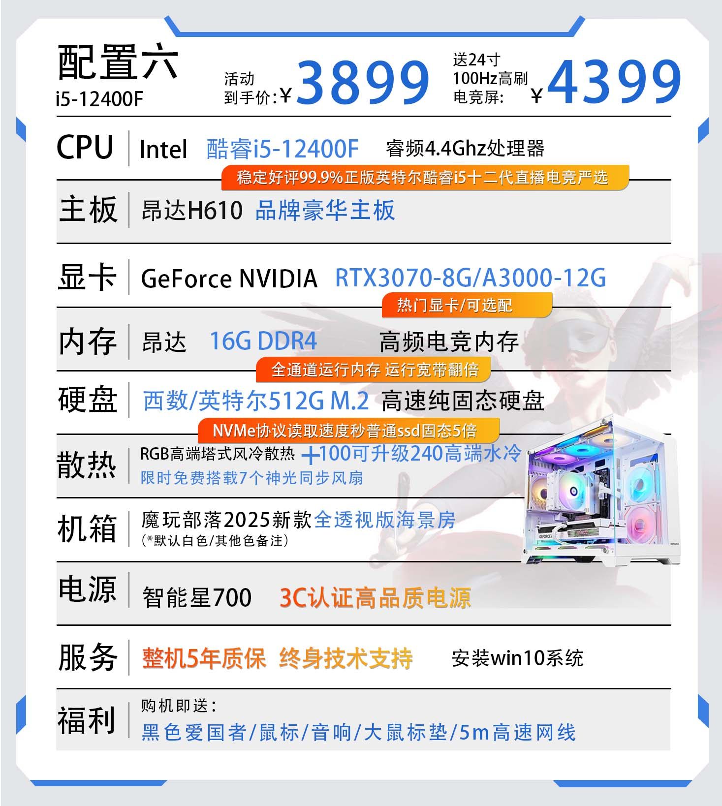 | Color Classification | Configuration 1 Core I5-11400F/256M.2/8G Ddr4/Game Independent Graphics,Configuration 2 Core I5-11400F/Gtx960 4G/256M.2/16G Ddr4,Configuration Three Core I5-11400F/Rx560 8G/256M.2/16G Ddr4,Configuration 4 Core I5-12400F/Rx590 8G/512M.2/16G Ddr4,Configuration 5 Core I5-12400F/Rtx3050-8G/512M.2/16G Ddr4,Configuration 6 Core I5-12400F/A3000 12G/512M.2/16G Ddr4,Configuration 7 Core I5-12400F/Rtx5050 8G/512M.2/16G Ddr4,Configuration Eight Core I9-12900Kf/Rtx5060 8G/1T M.2/32G Ddr4 |