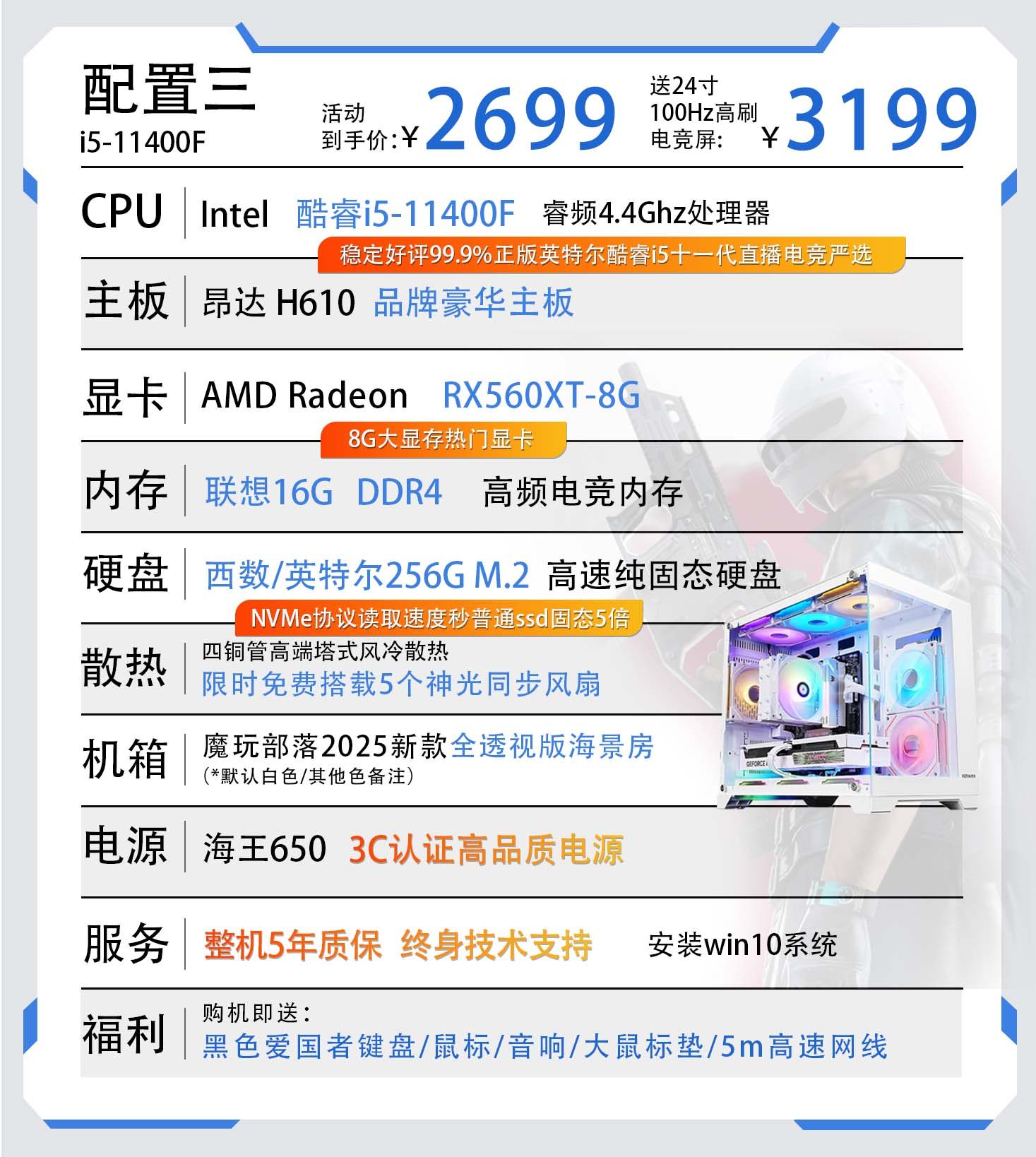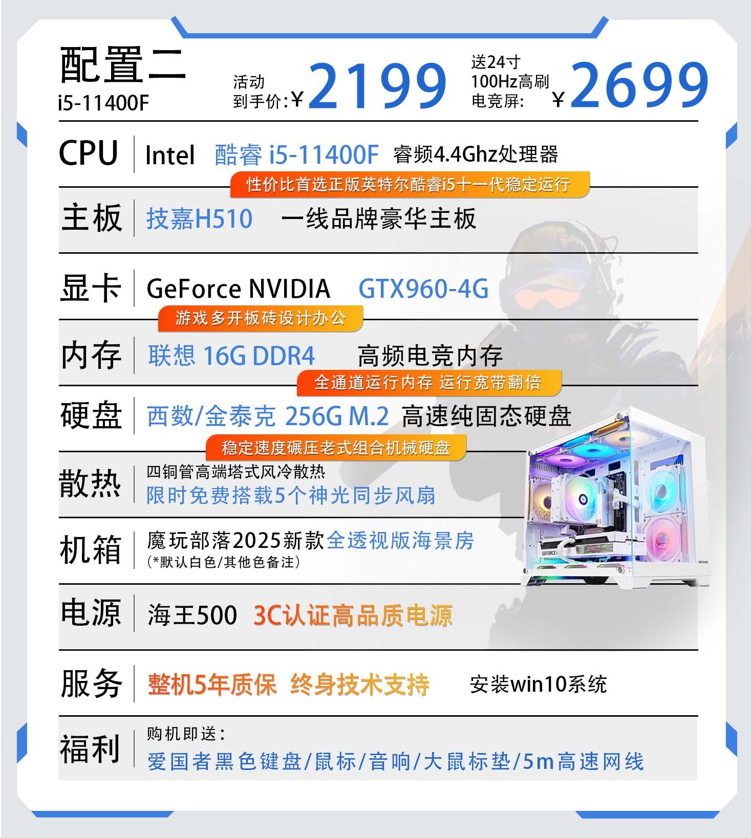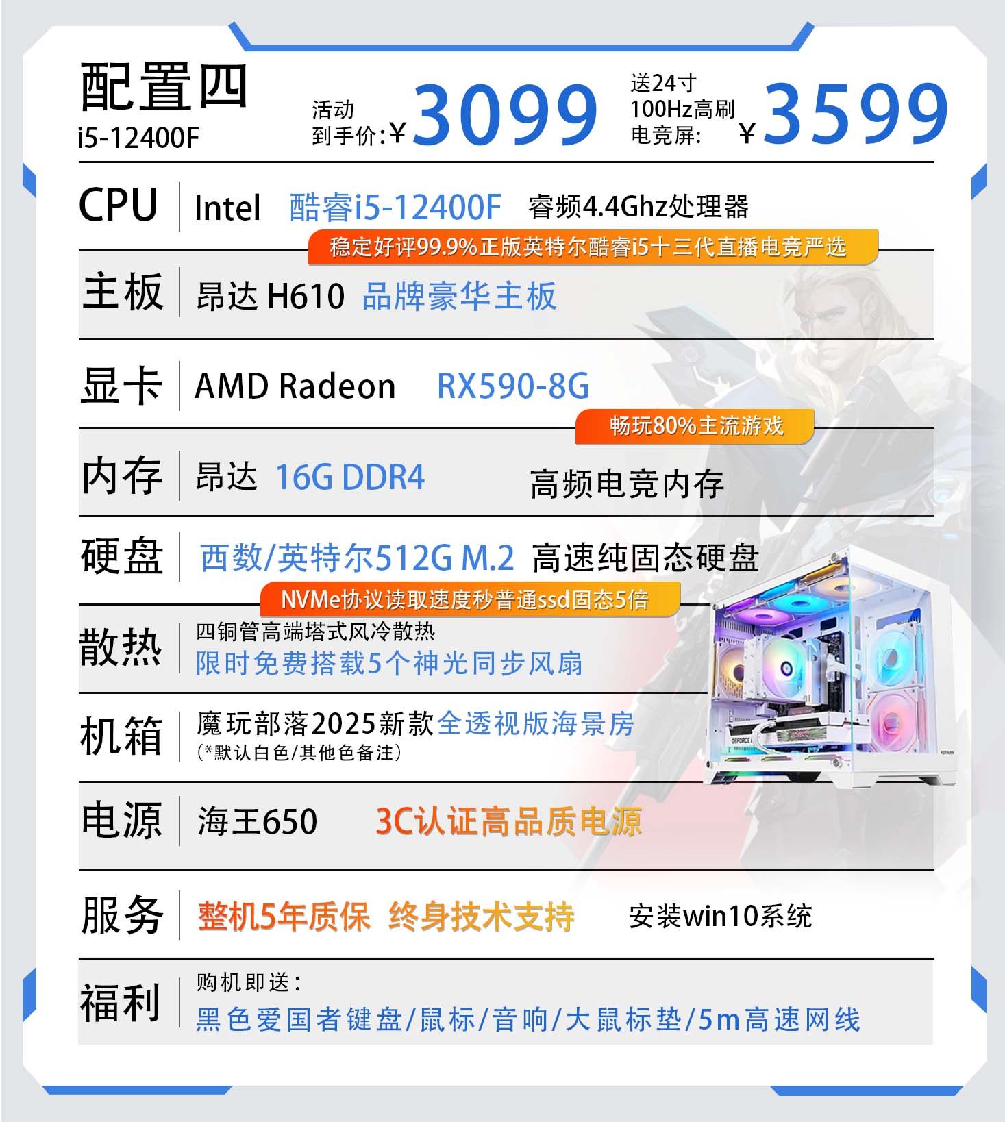 | Color Classification | Configuration 1 Core I5-11400F/256M.2/8G Ddr4/Game Independent Graphics,Configuration 2 Core I5-11400F/Gtx960 4G/256M.2/16G Ddr4,Configuration Three Core I5-11400F/Rx560 8G/256M.2/16G Ddr4,Configuration 4 Core I5-12400F/Rx590 8G/512M.2/16G Ddr4,Configuration 5 Core I5-12400F/Rtx3050-8G/512M.2/16G Ddr4,Configuration 6 Core I5-12400F/A3000 12G/512M.2/16G Ddr4,Configuration 7 Core I5-12400F/Rtx5050 8G/512M.2/16G Ddr4,Configuration Eight Core I9-12900Kf/Rtx5060 8G/1T M.2/32G Ddr4 |
