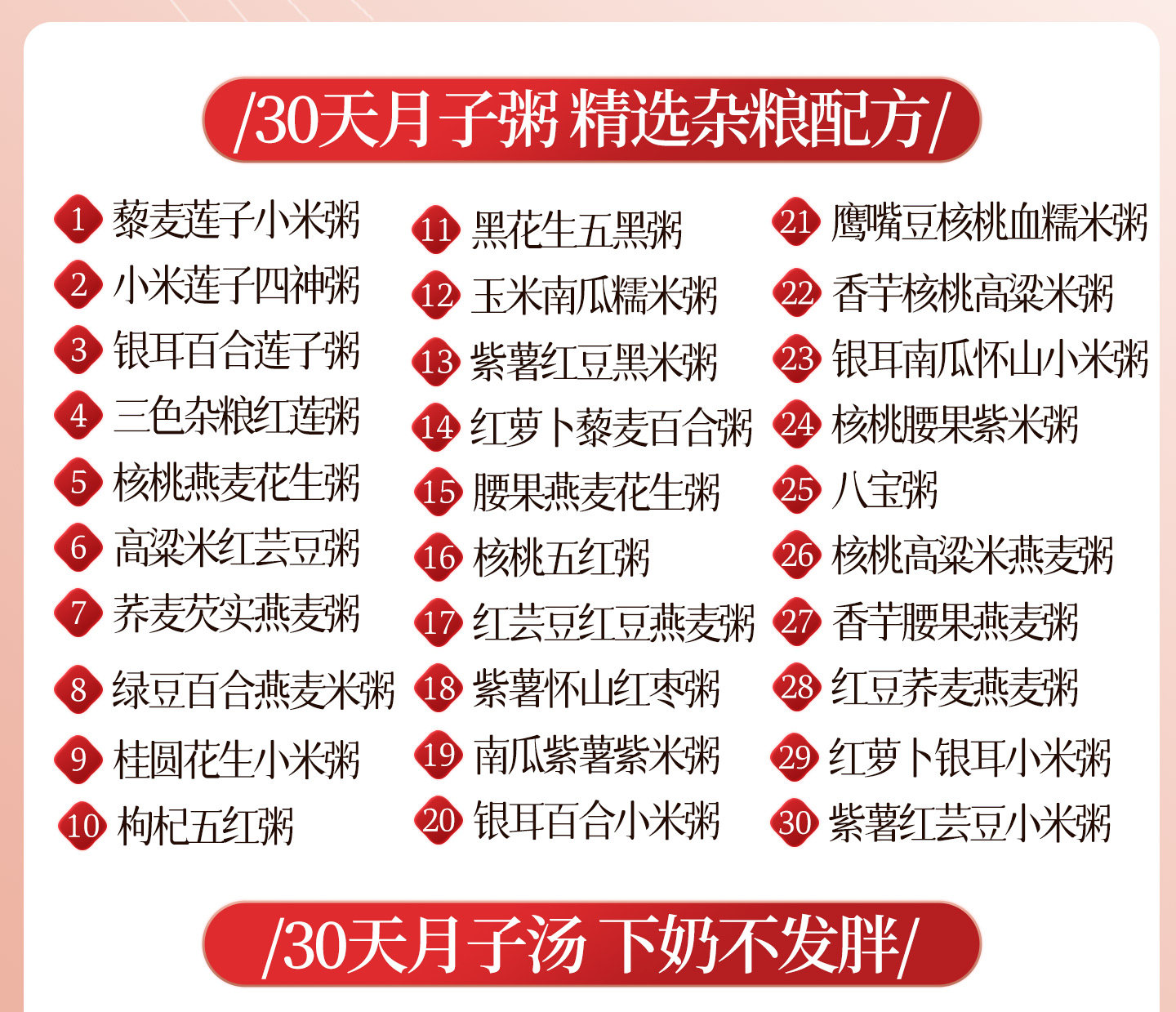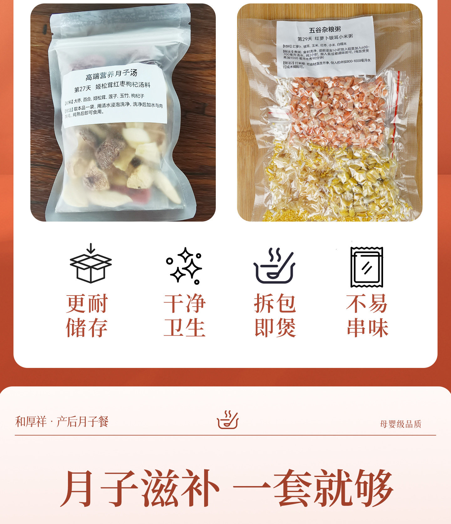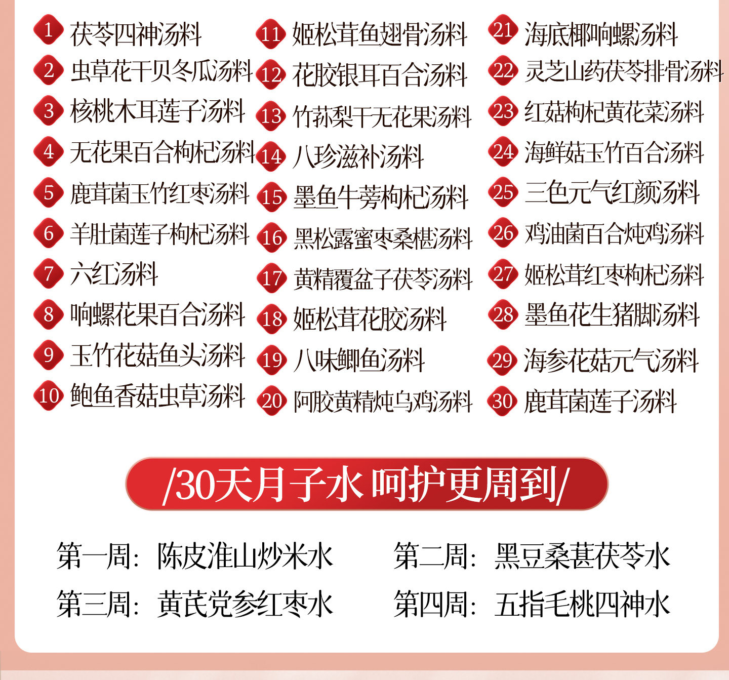 | Color Classification | Confinement Soup[30 Days Without Repetition],Confinement Soup[30 Days Without Repetition],[Four Stages, a Total of 28 Days]Breast Milk Postpartum Water,[Four Stages, a Total of 28 Days]Non-Breast Milk Postpartum Water,Confinement Soup + Soup[Every 30 Days],Confinement Water (Breast Milk Type)[28 Days]+Porridge[30 Days],Confinement Water (Breast Milk Type)[28 Days]+Soup[30 Days],Confinement Water (Breast Milk Type)[28 Days]+Porridge[30 Days]+Soup[30 Days],Postpartum Recovery Drink (Non-Breastfeeding Formula)[28 Days]+Porridge[30 Days],Postpartum Recovery Drink (Non-Breastfeeding Formula)[28 Days]+Soup[30 Days],Postpartum Recovery Drink (Non-Breastfeeding Formula)[28 Days]+Porridge[30 Days]+Soup[30 Days] |