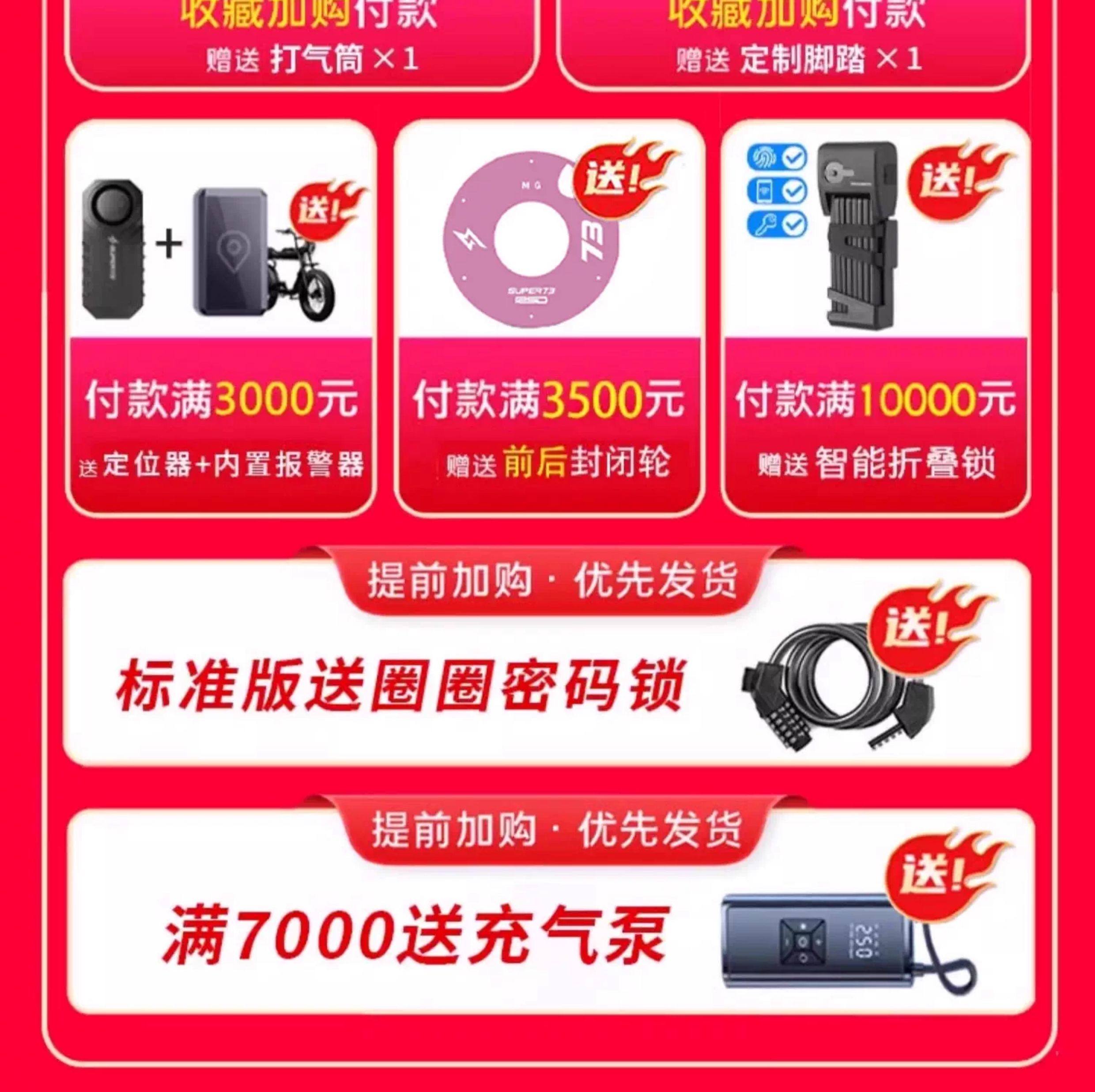 | Color Classification | [Super73-S1-Retro Version] Get Nfc 7inch for Free for Purchases over 2,500, and Get Front and Rear Closed Wheels + Customized Baskets for Purchases over 3,500,[Super73-S2-Retro Version] Get Nfc 7inch for Free for Purchases over 2,500, and Get Front and Rear Closed Wheels + Customized Baskets for Purchases over 3,500,[Super73-Y1S-Retro Version] Get Nfc 7inch for Free for Purchases over 2,500, and Get Front and Rear Closed Wheels + Customized Basket for Purchases over 3,500,[Super73-Rx-Retro Version] Get Nfc 7inch for Free for Purchases over 2,500, and Get Front and Rear Closed Wheels + Customized Baskets for Purchases over 3,500,[Super73-Rxs-Retro Version] Get Nfc 7inch for Free for Purchases over 2,500, and Get Front and Rear Closed Wheels + Customized Baskets for Purchases over 3,500,[Super73-S1-Range Extended Version] Front and Rear Dual Oil Brakes/5.0 Tires/High-Speed Brushless Motor,[Super73-S2-Range Extended Version] Front and Rear Double Oil Brakes/5.0 Tires/Seven-Speed Transmission/High-Speed Brushless Motor,[Super73-Y1S-Range Extended Version] New National Standard Can Be Licensed/Double Front and Rear Oil Brakes/5.0 Tires/Seven-Speed Transmission/Front and Rear Four-Fold Shock Absorption/High-Speed Brushless Motor,[Super73-Rx-Range Extended Version] Front and Rear Dual Oil Brakes/5.0 Tires/Seven-Speed Transmission/High-Speed Brushless Motor,[Super73-Rxs-Range Extended Version] New Front and Rear Dual Oil Brakes/5.0 Tires/Seven-Speed Transmission/Front and Rear Four-Fold Shock Absorption/High-Speed Brushless Motor,【Super73-S1 Premium Edition】Dual Hydraulic Disc Brakes (Front & Rear) / Six Colors Available / Integrated Gps Tracker & Alarm / Includes Front & Rear Closed Wheels + Custom Basket / High-Speed A9 Motor / Graphene Lithium Battery,[Super73-S2-Exclusive Edition] Dual Front and Rear Oil Brakes/Six Colors Optional/Built-In Locator and Alarm/Comes with Front and Rear Closed Wheels + Personalized Basket/7-Speed Transmission/High-Speed A9 Motor/Graphene Lithium Battery,[Super73-Y1S-Exclusive Edition] New National Standard Can Be Registered/Front and Rear Double Oil Brakes/Six Colors Optional/Built-In Locator and Alarm/Comes with Front and Rear Closed Wheels + Personalized Basket/Seven-Speed Transmission/High-Speed A9 Motor/ Graphene Lithium Battery,【Super73-Rx - Premium Edition】Dual Front and Rear Hydraulic Disc Brakes / Six Colors Available / Integrated Gps Tracker and Alarm / Includes Front and Rear Closed Wheels + Custom Basket / 7-Speed Shifting / Front and Rear Suspension / High-Speed A9 Motor / Graphene Lithium Battery,【Super73-Rxs - Premium Edition】Dual Front and Rear Hydraulic Disc Brakes / Six Colors Available / Integrated Gps Tracker and Alarm / Includes Front and Rear Closed Wheels + Custom Basket / 7-Speed Transmission / Front and Rear Quad Suspension / High-Speed A9 Motor / Graphene Lithium Battery,[Super73-S1-Aluminum Alloy High-Definition Version] Personalized Aluminum Alloy Frame/Ceramic Oil Sand/Waterproof Colorful Nfc Screen Pure Electric Five-Speed Adjustment/5.0 Off-Road Tires/Samsung or Panasonic Battery/Adjustable Front Plug,[Super73-S2-Aluminum Alloy High-Definition Version] Personalized Aluminum Alloy Frame/Ceramic Oil Sand/Waterproof Colorful Nfc Screen Pure Electric Five-Speed Adjustment/5.0 Off-Road Tires/Samsung or Panasonic Battery/Adjustable Front Insert,[Super73-Y1S-Aluminum Alloy High-End Version] Customized Aluminum Alloy Frame/New National Standard Can Be Registered/Ceramic Oil Sand/Waterproof Color Nfc Screen Pure Electric Five-Speed Adjustment/5.0 Tires/Samsung or Panasonic Battery/Adjustable Front Plug,[Super73-Rx-Aluminum Alloy High-End Version] Personalized Aluminum Alloy Frame/Ceramic Oil Sand/Waterproof Colorful Nfc Screen Pure Electric Five-Speed Adjustment/5.0 Off-Road Tires/Samsung or Panasonic Battery/Adjustable Front Plug/Front and Rear Shock Absorption,[Super73-Rxs-Aluminum Alloy High-Definition Version] Customized Aluminum Alloy Frame/Ceramic Oil Sand/Waterproof Colorful Nfc Screen Pure Electric Five-Speed Adjustment/5.0 Off-Road Tires/Samsung or Panasonic Battery/Adjustable Front Plug/Front and Rear Shock Absorption |