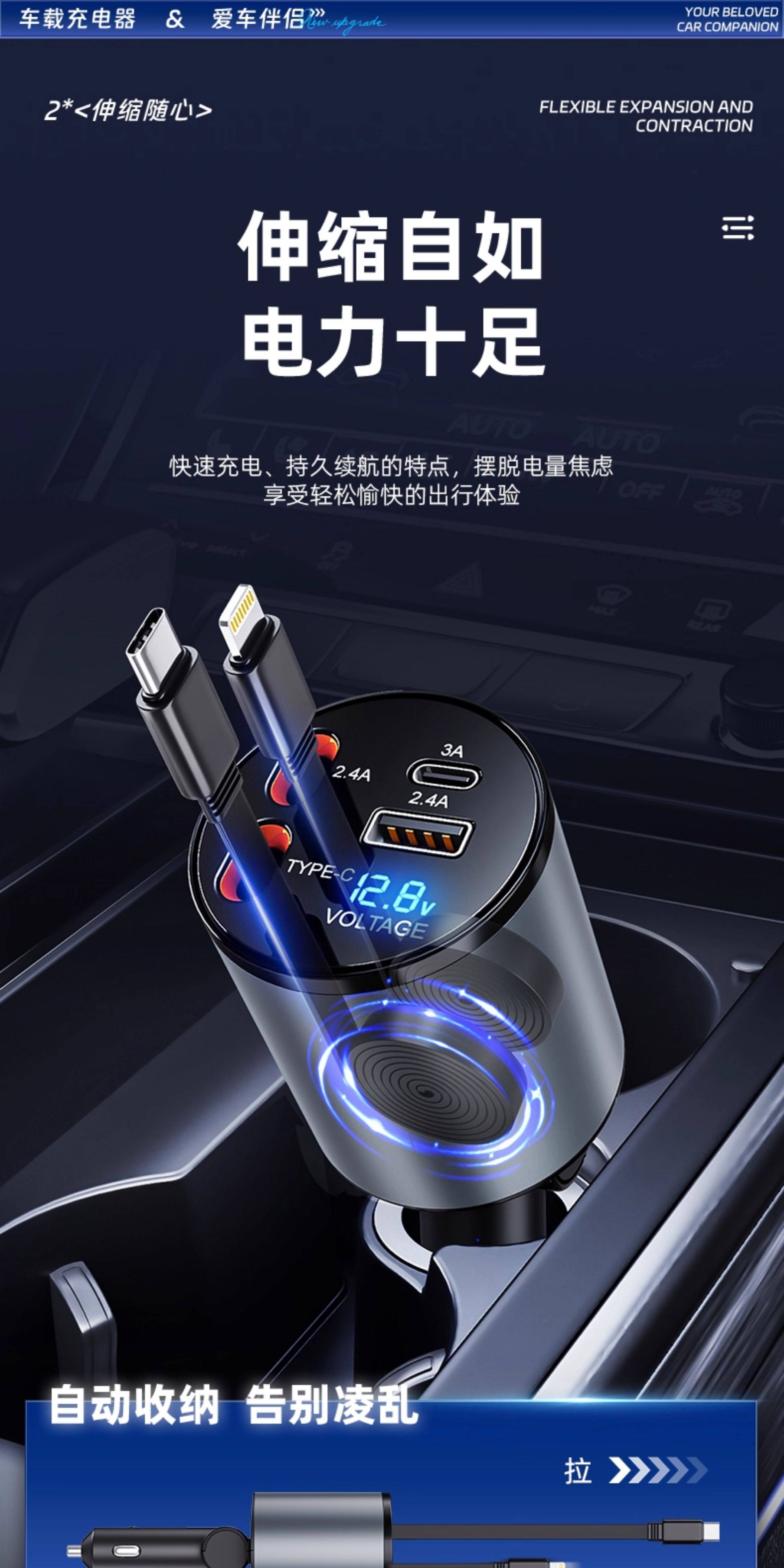 Car Charger 165W Super Fast Charging Car Retractable Cable One-To-Four USB Cigarette Lighter Adapter