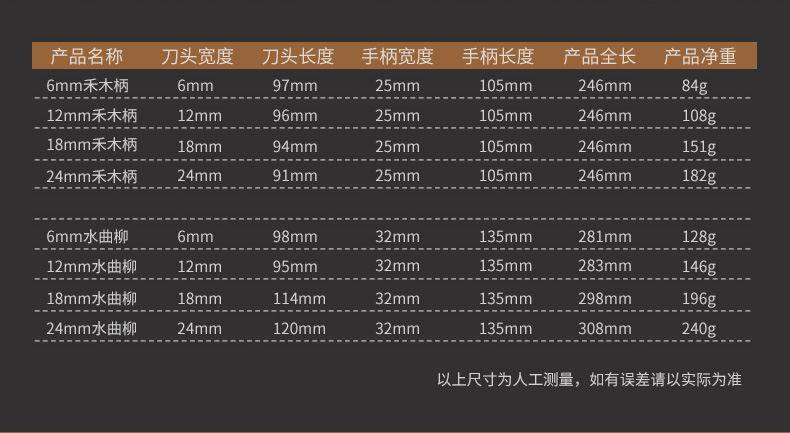 | Color Classification | Single Half-Round Outer Blade 6mm,Single Half-Round Outer Blade 12mm,Single Half-Round Outer Blade 18mm,Single Half-Round Outer Blade 24mm,Semi-Circular Outer Edge 4-Piece Set,Hemu Handle, Chrome Vanadium Steel Outer Blade 6mm,Hemu Handle, Chrome Vanadium Steel Outer Blade 12mm,Hemu Handle, Chrome Vanadium Steel Outer Blade 18mm,Hemu Handle, Chrome Vanadium Steel Outer Blade 24mm,Hemu Handle, Chrome Vanadium Steel Outer Blade, 4 Pieces 6/12/18/24,Ash Handle, Chrome Vanadium Steel Outer Blade 6mm,Ash Handle, Chrome Vanadium Steel Outer Blade 12mm,Ash Handle, Chrome Vanadium Steel Outer Blade 18mm,Ash Handle, Chrome Vanadium Steel Outer Blade 24mm,Ash Handle Chrome Vanadium Steel Outer Blade 6/12/18/24,German Heavy Duty Flat Chisel 6mm,German Heavy Duty Flat Chisel 8mm,German Heavy Duty Flat Chisel 10mm,German Heavy Duty Flat Chisel 12mm,German Heavy Duty Flat Chisel 18mm,German Heavy Duty Flat Chisel 20mm,German Heavy Duty Flat Chisel 24mm,German Heavy Duty Flat Chisel 32mm,German Heavy Duty Flat Chisel 38mm |