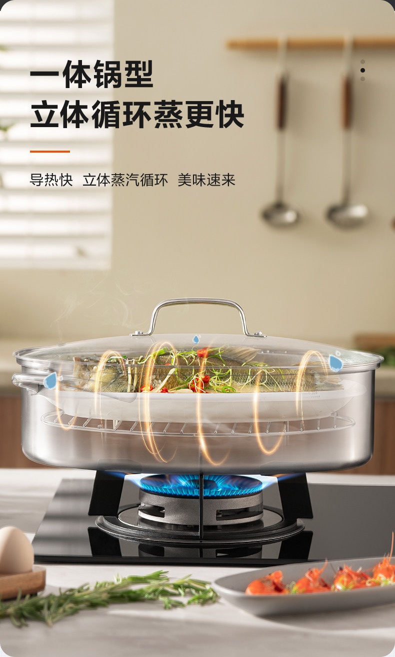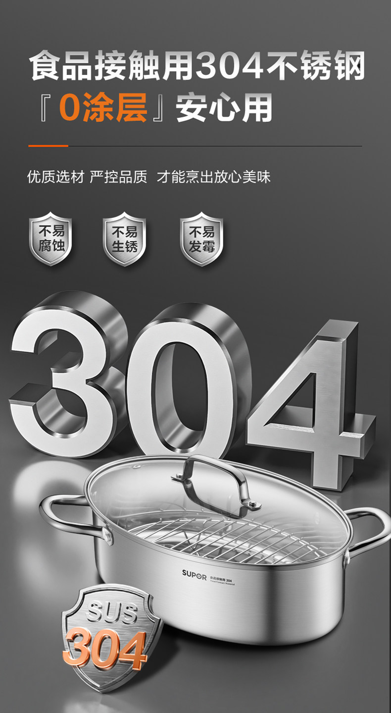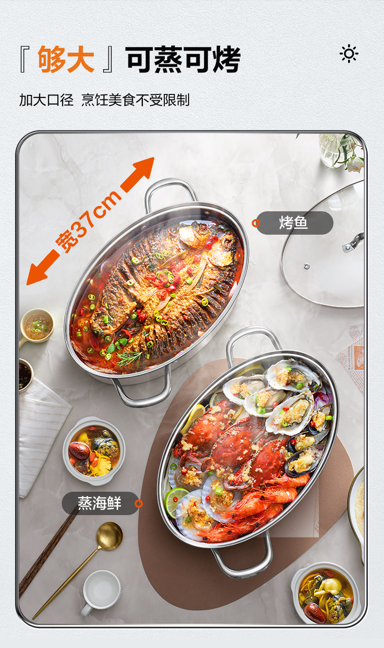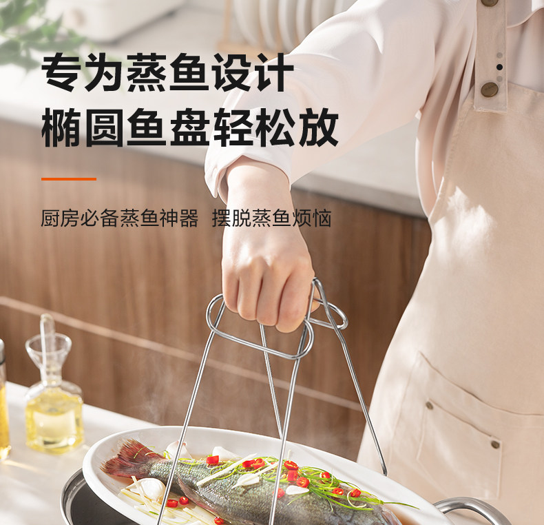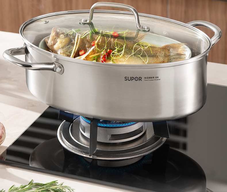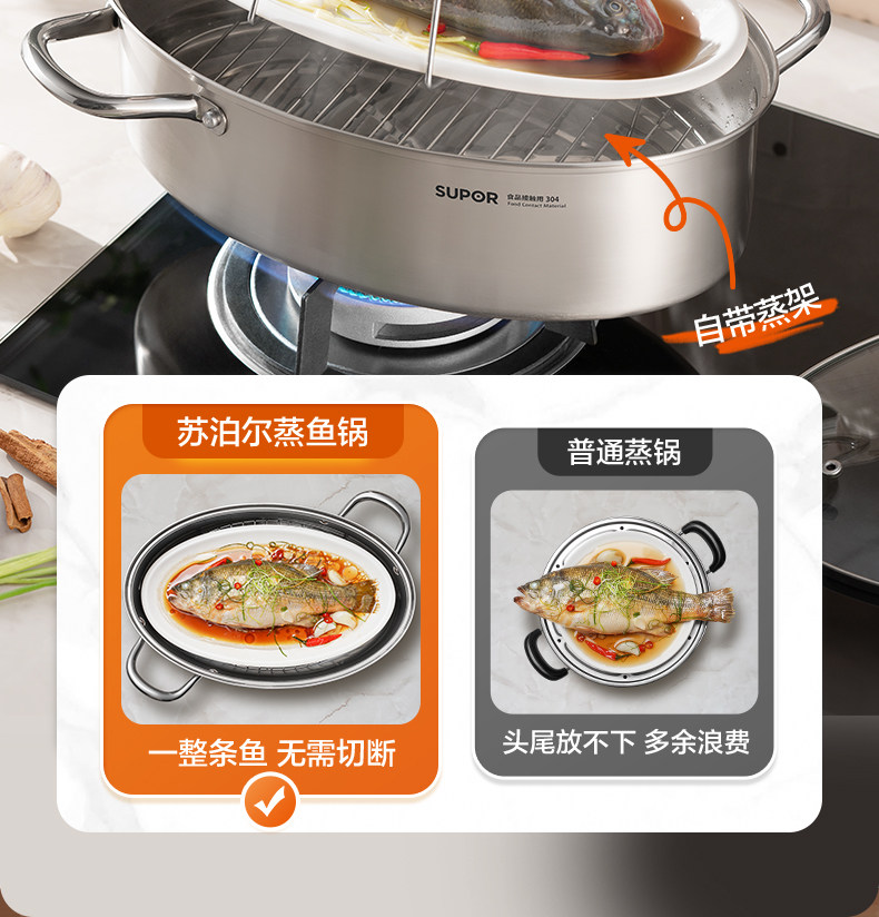 Supor Steamer for Home Use, Fish Steamer Made of 304 Stainless Steel, Special Steamer for Steaming Fish, Long Oval-Shaped Fish Steaming Tool