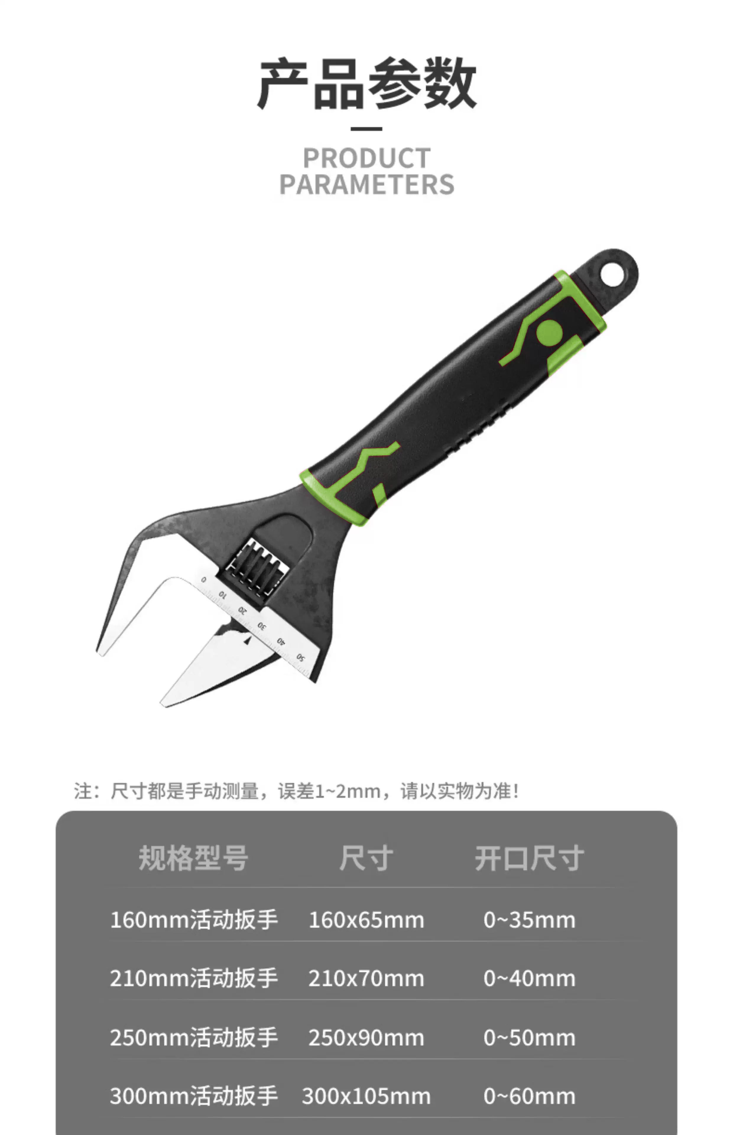 | Color Classification | [Extra Large Opening] Industrial Grade 6inch [Opening 33mm],[Extra Large Opening] Industrial Grade 8inch [Opening 38mm],[Extra Large Opening] Industrial Grade 10inch [Opening 48mm],[Pipe and Live Combination Wrench] 8inch,[Pipe and Live Combination Wrench] 10inch,[Pipe and Live Combination Wrench] 12inch,[Industrial Gradeā Triple Polishing] Adjustable Wrench 6inch 20*150mm,[Industrial Gradeā Triple Polishing] Adjustable Wrench 8inch 25*200mm,[Industrial Gradeā Triple Polishing] Adjustable Wrench 10inch 30*250mm,[Industrial Gradeā Triple Polishing] Adjustable Wrench 12inch 35*300mm,[Industrial Gradeā Triple Polishing] Adjustable Wrench 15inch 45*375mm,Bathroom Wrench* 5inch [Opening 0-30mm],Bathroom Wrench* 6inch [Opening 0-36mm],Bathroom Wrench* 8inch [Opening 0-45mm] |