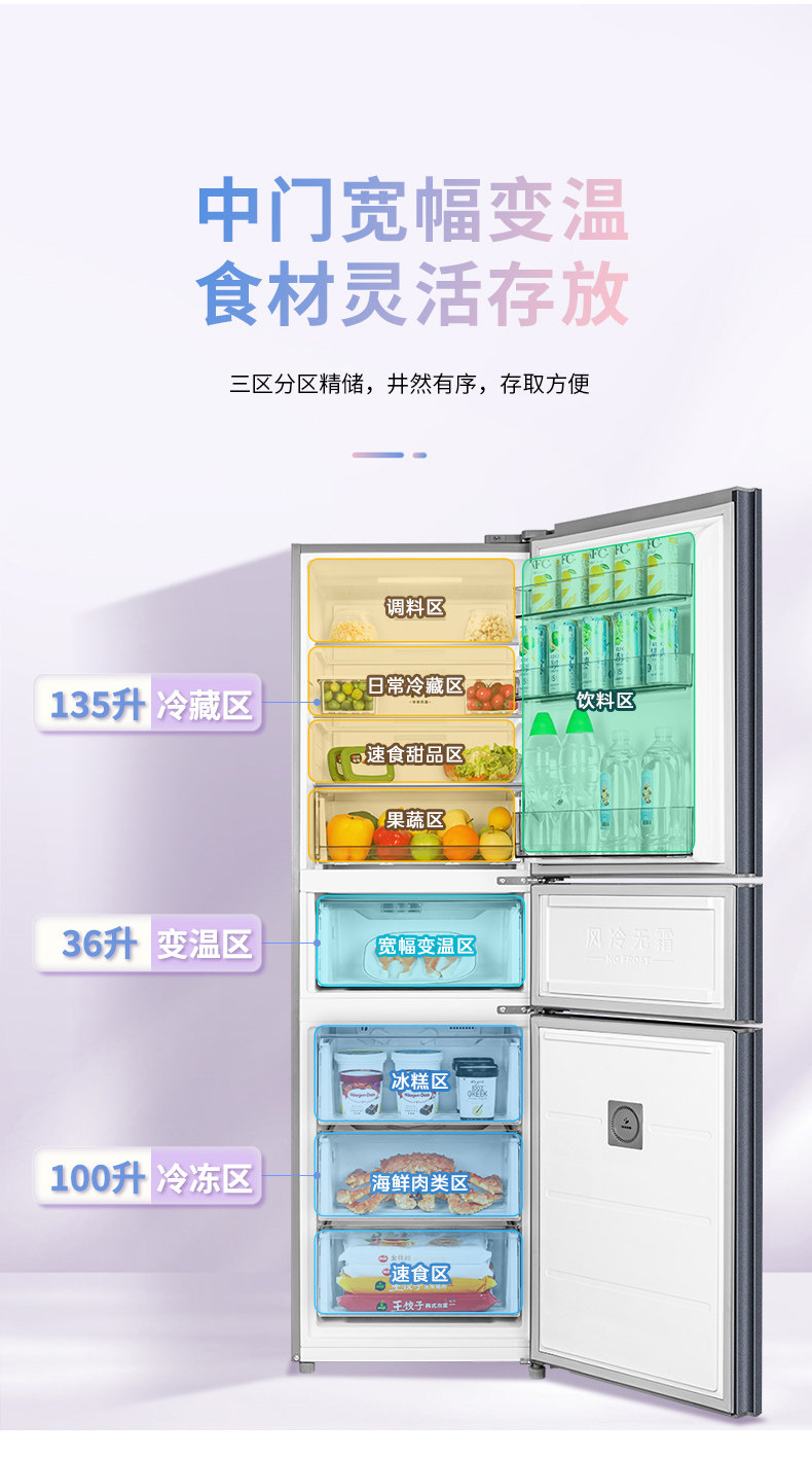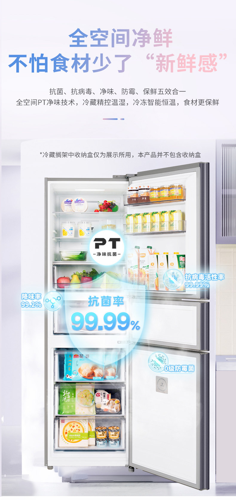 Midea Hualing 282 Three-Door Refrigerator for Home Use, Small Size, Inverter, First-Class Energy Efficiency, Energy-Saving, Frost-Free, Suitable for Rental Apartments