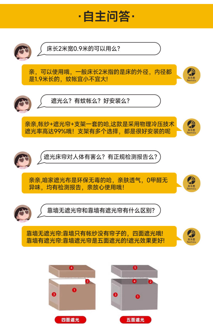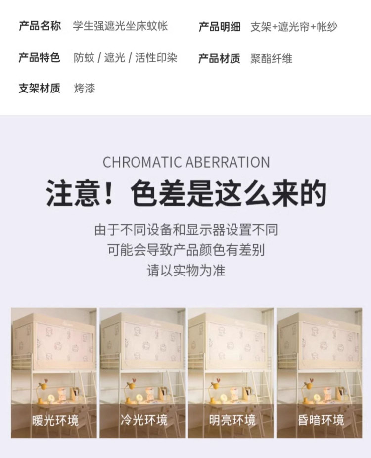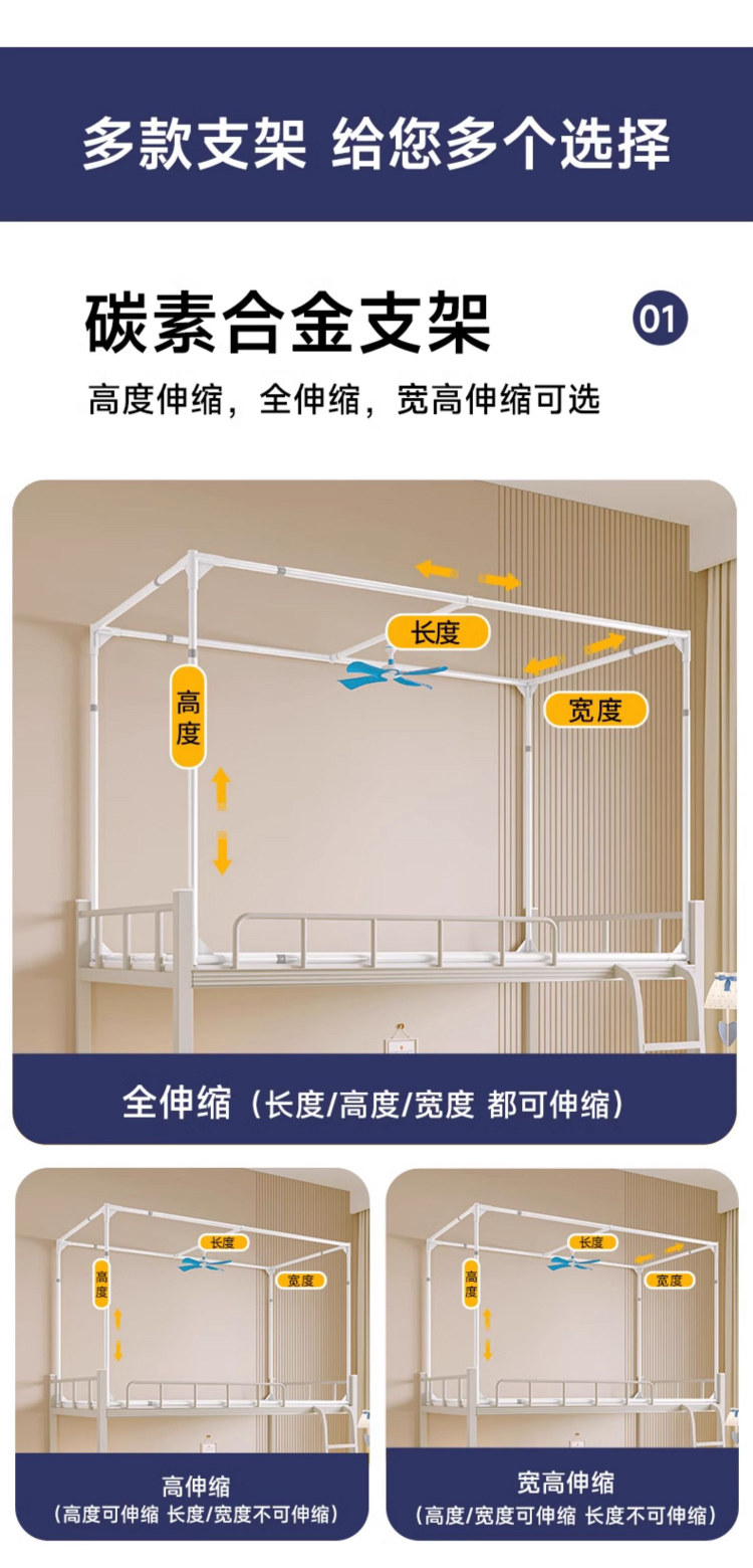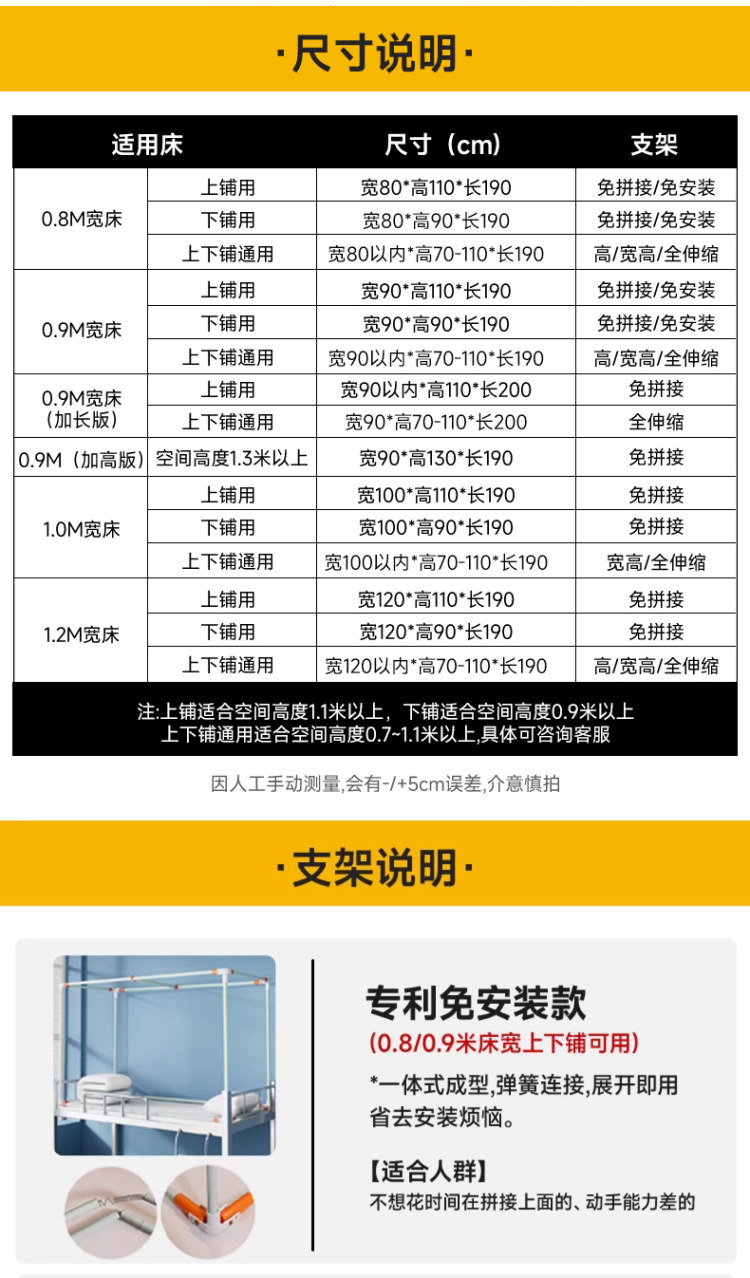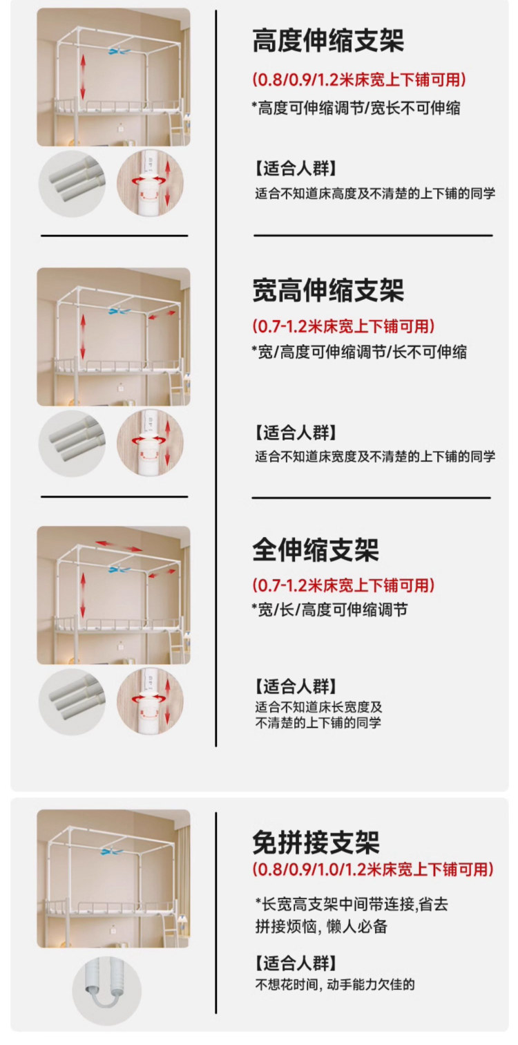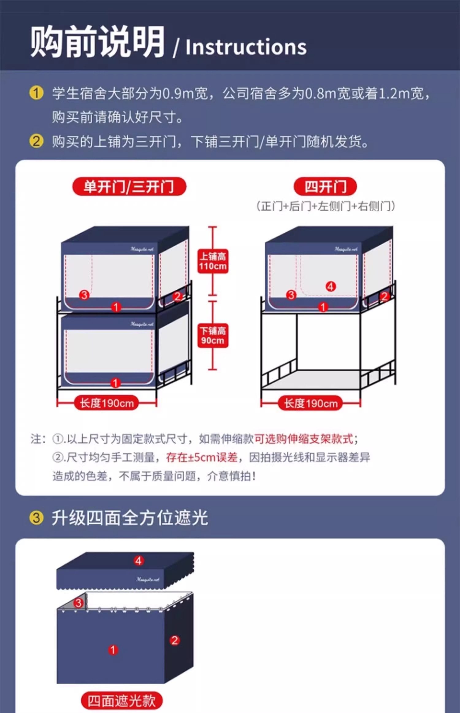 | Applicable Bed Size | 0.8m Bed[80x190x110cm][Mosquito Net + Seamless Frame]Strong Shading on All Sides,0.8m under Bed[80x190x90cm][Mosquito Net + Seamless Frame]Strong Shading on All Sides,0.9m Bed[90x190x110cm][Mosquito Net + Seamless Frame]Strong Shading on All Sides,0.9m under Bed[90x190x90cm][Mosquito Net + Seamless Frame]Strong Shading on All Sides,0.8m Bed[80x190x110cm][Mosquito Net + Seamless Bracket + Wall-Mounted Curtain]Five-Sided Strong Shading,0.8m under Bed[80x190x90cm][Mosquito Net + Seamless Bracket + Wall-Mounted Curtain]Five-Sided Strong Shading,0.9m Bed[90x190x110cm][Mosquito Net + Seamless Bracket + Wall-Mounted Curtain]Five-Sided Strong Shading,0.9m under Bed[90x190x90cm][Mosquito Net + Seamless Bracket + Wall-Mounted Curtain]Five-Sided Strong Shading |