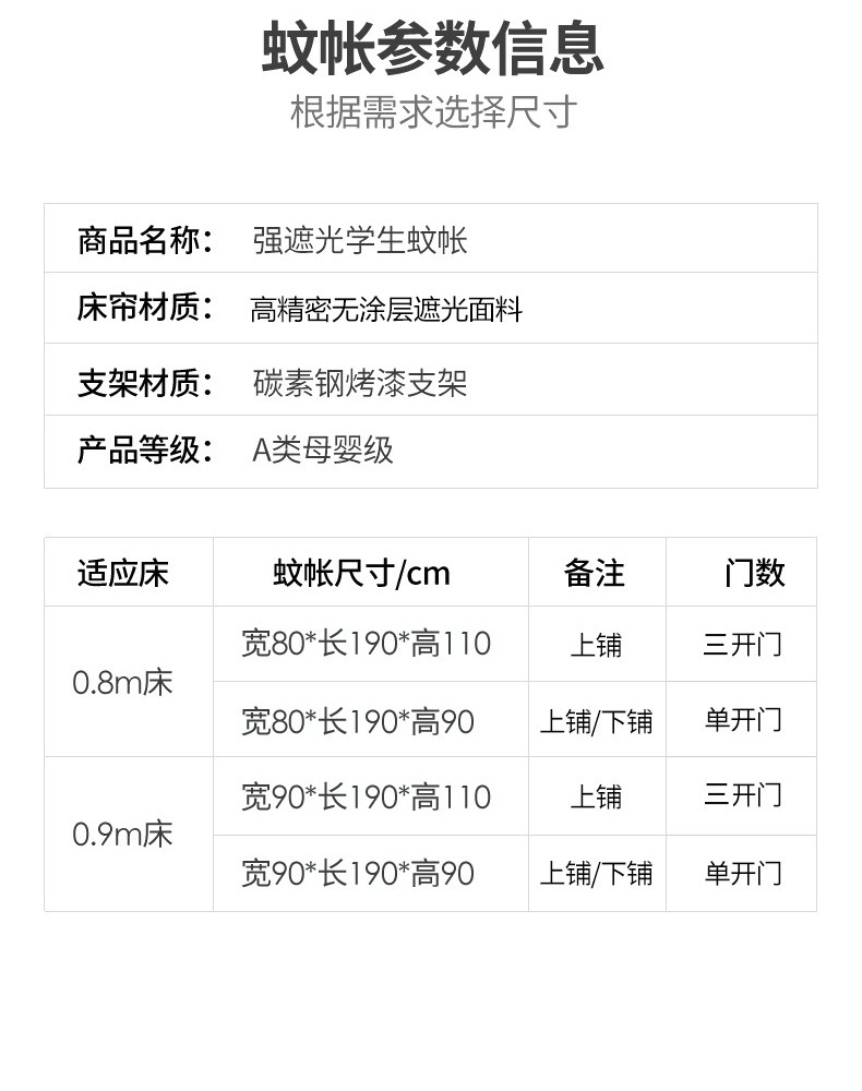 | Applicable Bed Size | 0.8m Bed - Universal Single Door for Lower Bunk[Super Light-Blocking + No Splicing Bracket]80X190 Height 90cm,0.8m Bed - Upper Bed with Three High Doors[Super Light-Blocking + No Splicing Bracket]80X190 Height 110cm,0.9m Bed - Universal Single Door for Lower Bunk[Super Light-Blocking + No Splicing Bracket]90X190 Height 90cm,0.9m Bed - Upper Bed with Three High Doors[Super Light-Blocking + No Splicing Bracket]90X190 Height 110cm |