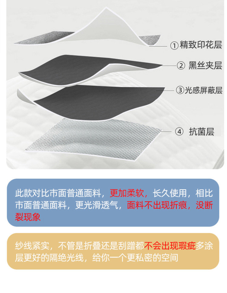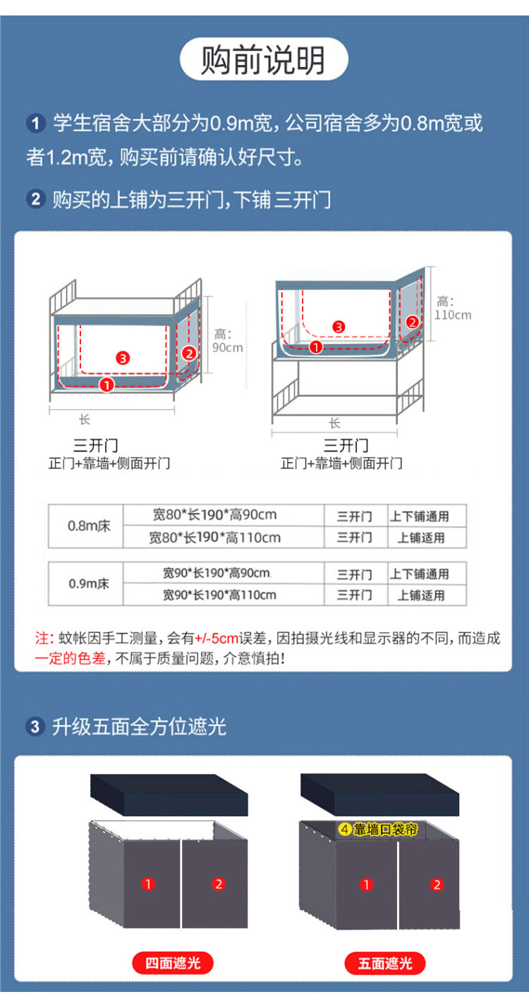 | Applicable Bed Size | 0.8m Bed[80x190x110cm][Mosquito Net + Seamless Frame]Strong Shading on All Sides,0.8m under Bed[80x190x90cm][Mosquito Net + Seamless Frame]Strong Shading on All Sides,0.9m Bed[90x190x110cm][Mosquito Net + Seamless Frame]Strong Shading on All Sides,0.9m under Bed[90x190x90cm][Mosquito Net + Seamless Frame]Strong Shading on All Sides,0.8m Bed[80x190x110cm][Mosquito Net + Seamless Bracket + Wall-Mounted Curtain]Five-Sided Strong Shading,0.8m under Bed[80x190x90cm][Mosquito Net + Seamless Bracket + Wall-Mounted Curtain]Five-Sided Strong Shading,0.9m Bed[90x190x110cm][Mosquito Net + Seamless Bracket + Wall-Mounted Curtain]Five-Sided Strong Shading,0.9m under Bed[90x190x90cm][Mosquito Net + Seamless Bracket + Wall-Mounted Curtain]Five-Sided Strong Shading |