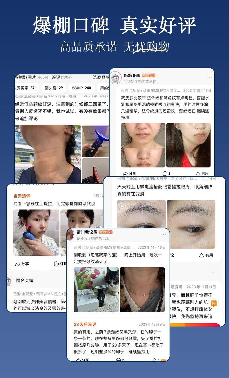 | Color Classification | Fully Equipped with Blue Rechargeable Model + Neck Cream/Ems Lifting + Controllable Temperature + Smoothing Neck Lines + Three-Purpose Neck, Eye and Face + Revitalizing Collagen,Flagship Model + Neck Cream/Firming and Lightening Lines + Warm Lifting + Dual Use for Neck and Face + Essence Introduction,Luxury Model/Dual Use for Neck and Face + Colored Light Skin Care,Fully Equipped with Black Charging Model + Neck Cream/Ems Lifting + Controllable Temperature + Smoothing Neck Lines + Three-Purpose Neck and Eye Face + Shaping Swan Neck,30 Days Free Trial,5 Years Warranty |