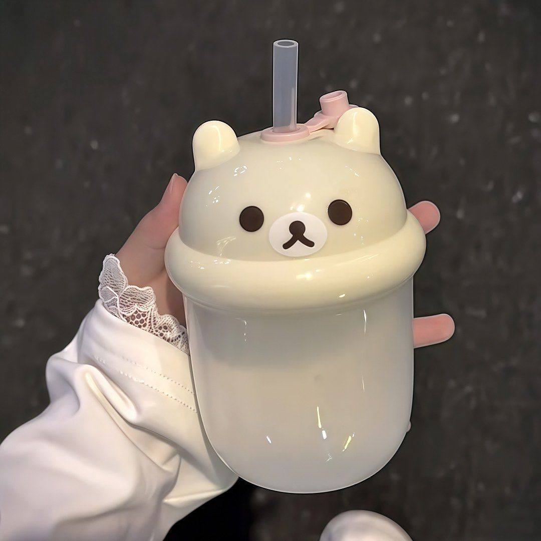 [New Product]Japanese Rilakkuma Mini Milk Coffee Glass Cup, High-Quality, Portable with Straw