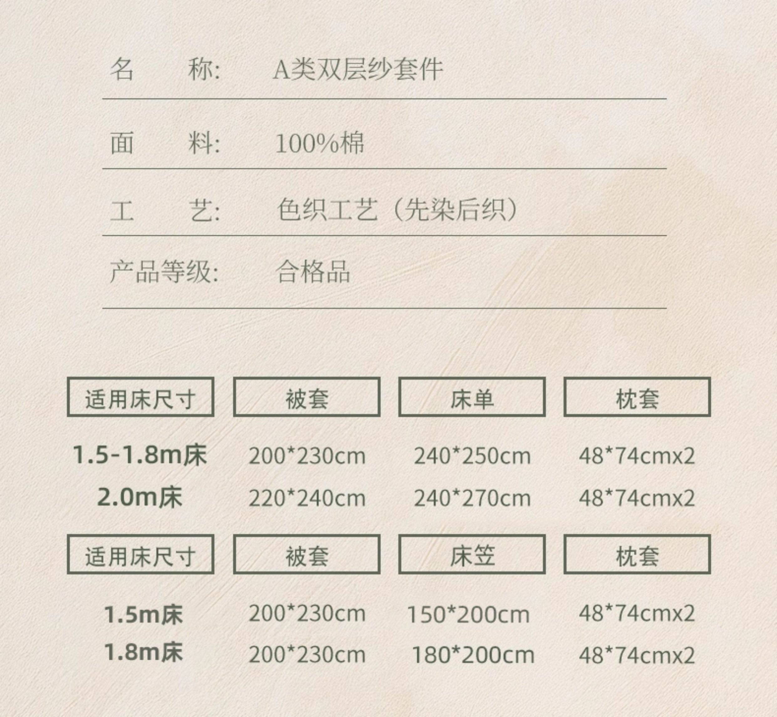 | Applicable Bed Size | 1.5m/1.8m Four-Piece Bed Sheet Set [Sheet*1+Quilt Cover*1+Pillowcase*2],2.0m Bed Sheet Four-Piece Set [Sheet*1+Quilt Cover*1+Pillowcase*2],1.5m Fitted Sheet Set of Four [Fitted Sheet*1+Quilt Cover*1+Pillowcase*2],1.8m Fitted Sheet Set of Four [Fitted Sheet*1+Quilt Cover*1+Pillowcase*2] |