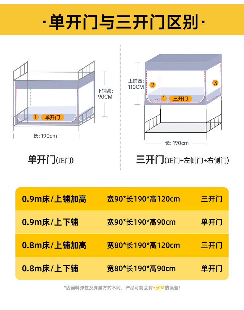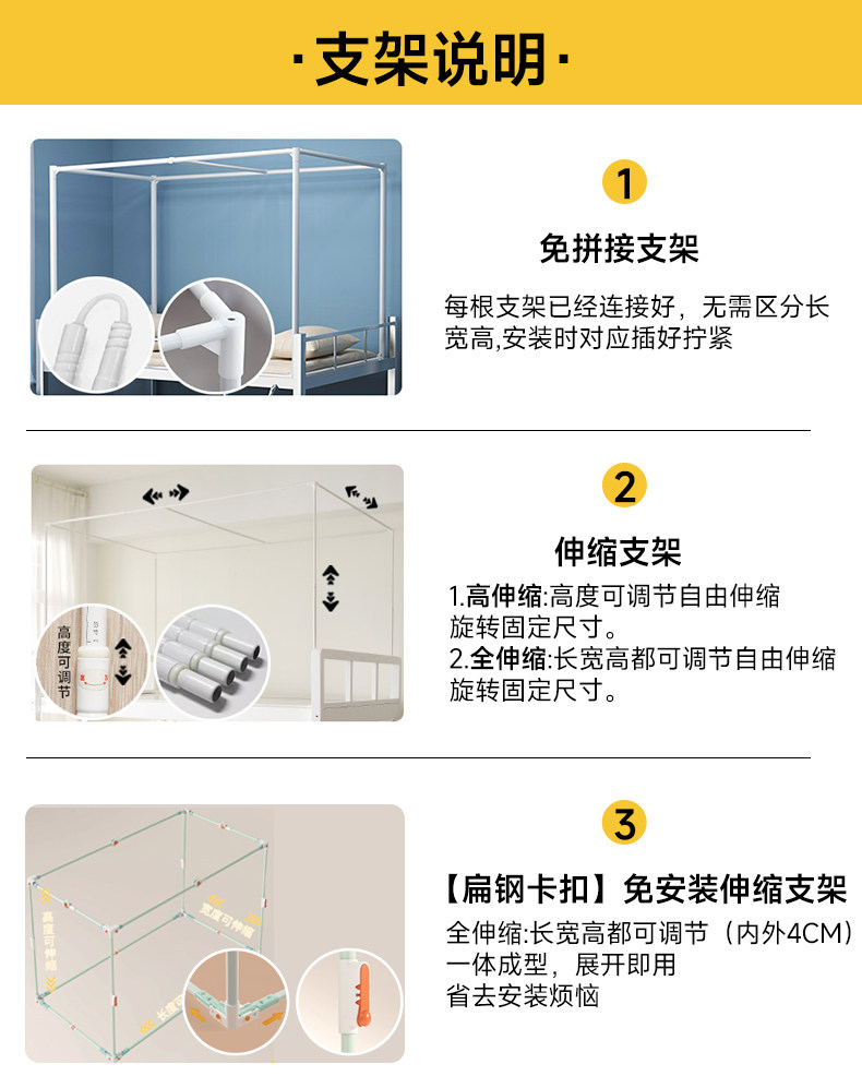 | Applicable Bed Size | [Heavy-Duty Patented Zero-Installation Bracket]Width 90Xlength 190/Three-Door Universal for Upper and Lower Beds - Height 90-110 Adjustable,[Heavy-Duty Patented Zero-Installation Bracket]Width 90Xlength 190/Single Door for Lower Bunk-Height 90-100,[Heavy-Duty Patented Zero-Installation Bracket]Width 80Xlength 190/Three-Door Upper Bed-Height 110,[Heavy-Duty Patented Zero-Installation Bracket]Width 100Xlength 190/Three-Door Upper Bed-Height 110,[Thickened Folding Bracket]Width 90Xlength 190/Three-Door Upper Bed-Height 110,[Thickened Folding Bracket]Width 90Xlength 190/Single Door for Lower Bunk-Height 90,[Thickened Folding Bracket]Width 80Xlength 190/Three-Door Upper Bed-Height 110,[Thickened Folding Bracket]Width 80Xlength 190/Single Door for Lower Bunk-Height 90,[Thickened Folding Bracket]Width 100Xlength 190/Three-Door Upper Bed-Height 110,[Thickened Folding Bracket]Width 120 X Length 190 / Three-Door Top Bunk - Height 110,[Hercules Fixed Bracket]Width 90Xlength 190/Three-Door Upper Bed-Height 90-110,[Hercules Fixed Bracket]Width 90Xlength 190/Single Door for Lower Bunk-Height 90,[Hercules Fixed Bracket]Width 80Xlength 190/Three-Door Upper Bed-Height 90-110,[Hercules Fixed Bracket]Width 80Xlength 190/Single Door for Lower Bunk-Height 90,[Hercules Fixed Bracket]Width 100Xlength 190/Three-Door Upper Bed-Height 110,[Hercules Fixed Bracket]Width 120 X Length 190 / Three-Door Top Bunk - Height 110 |