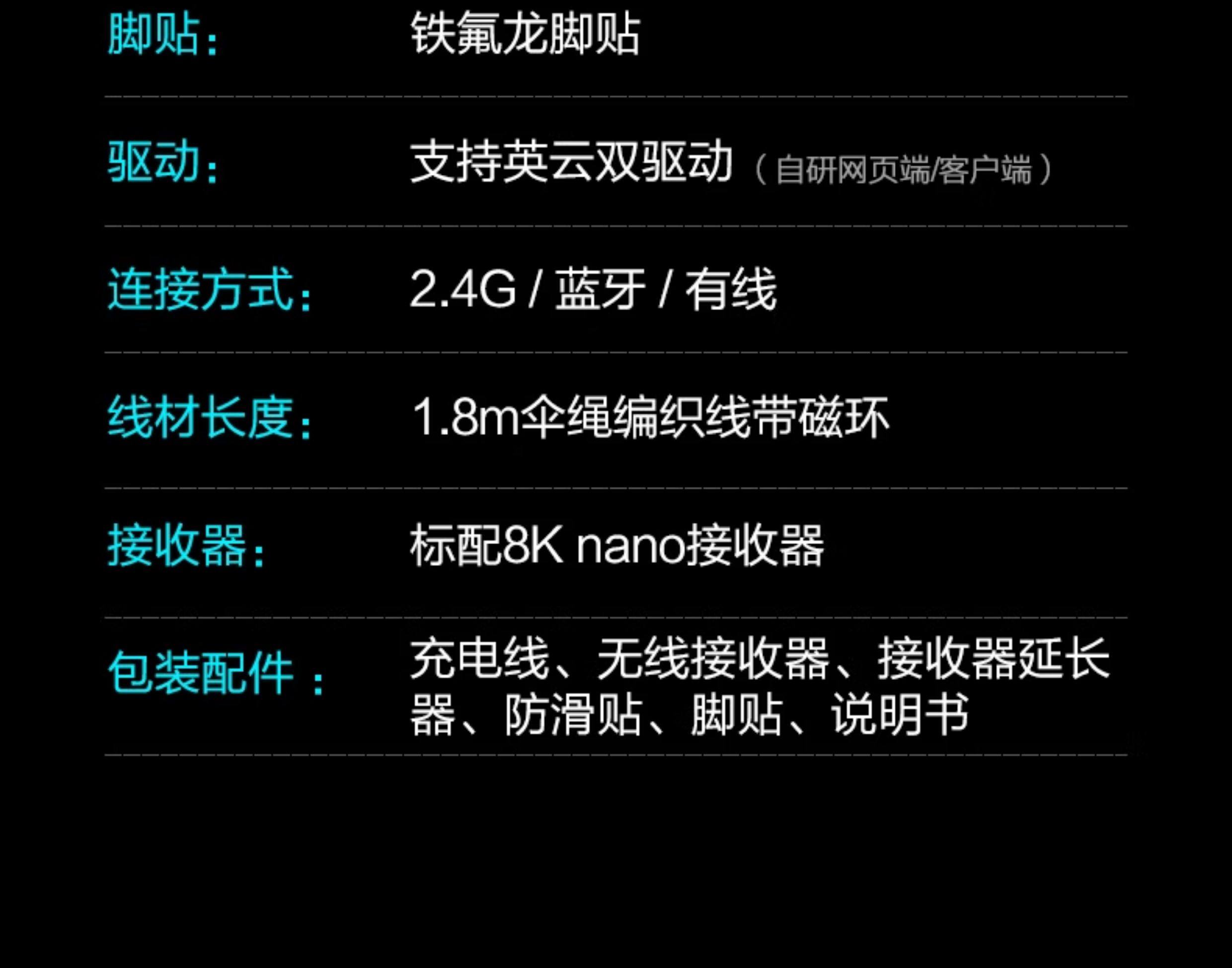 | Wireless Technology | 2.4Ghz+Bluetooth |