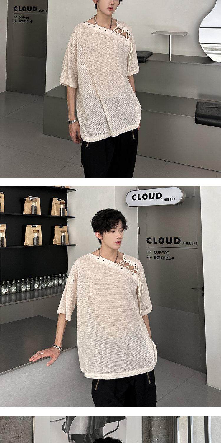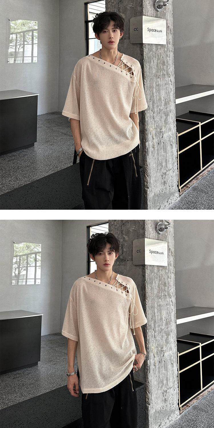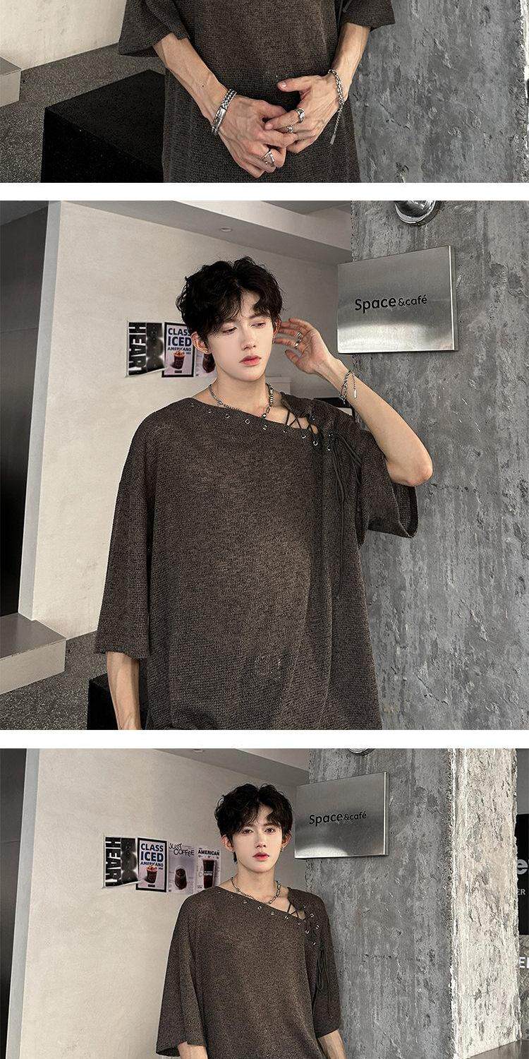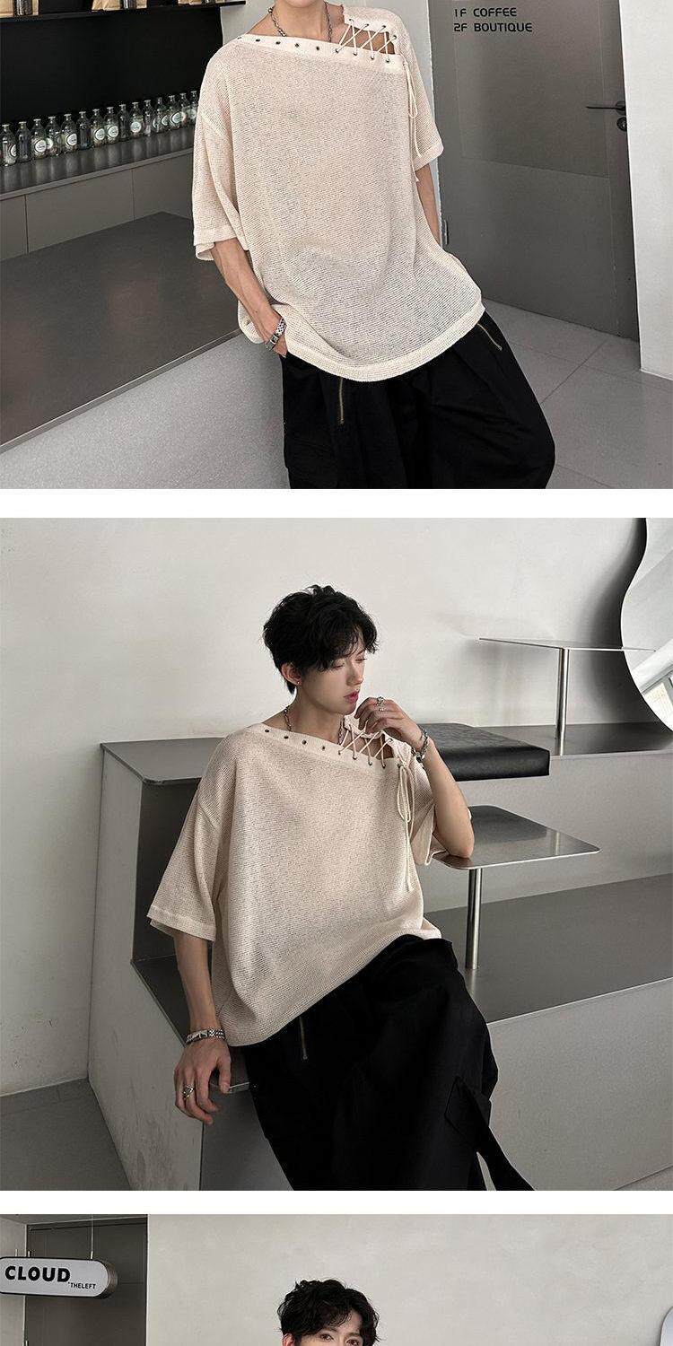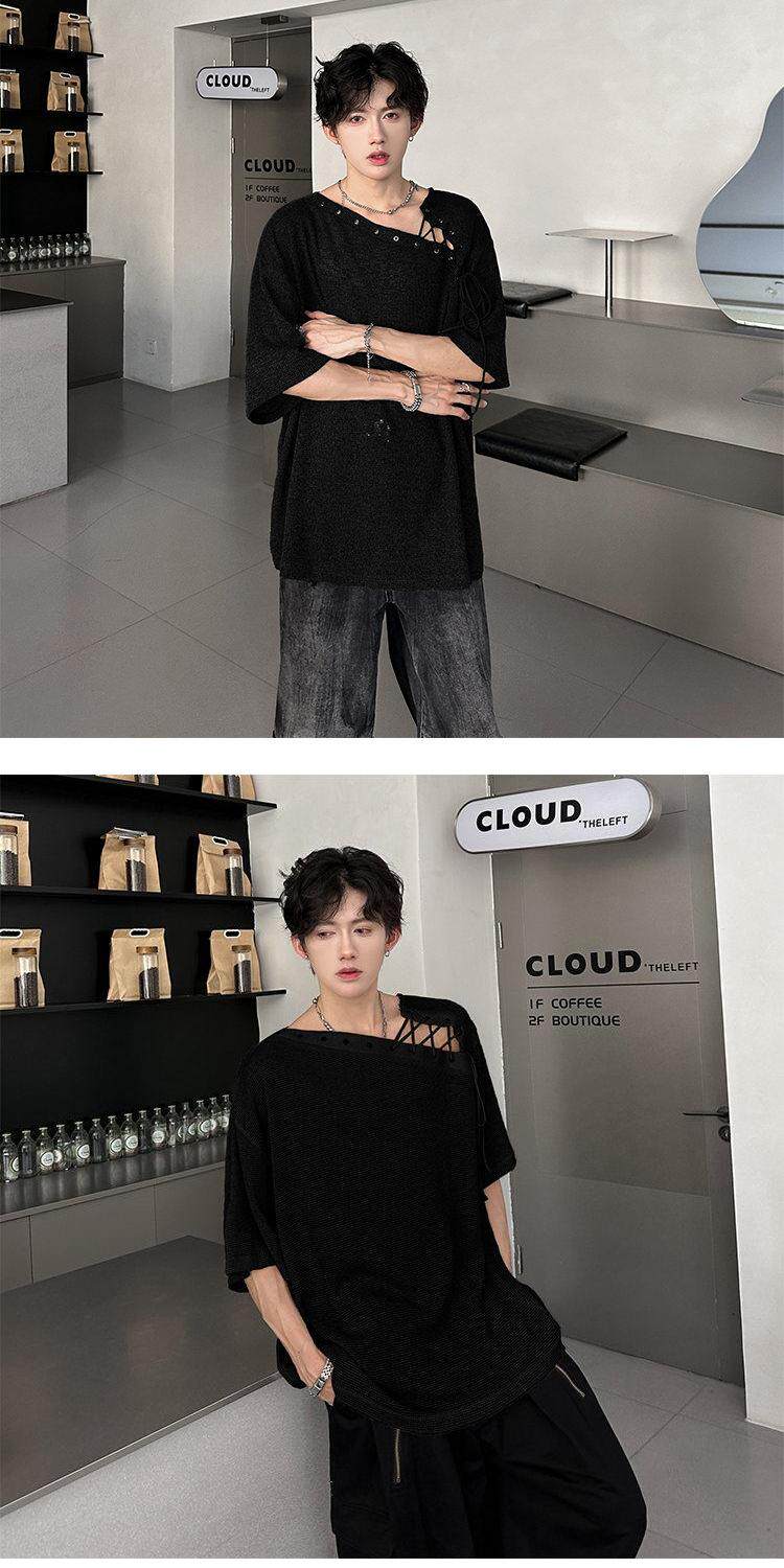 Irregular Design, Tie-Up, Off-Shoulder, Short-Sleeved, Unisex, Popular Summer Outfit, Niche, Relaxed Knit T-Shirt