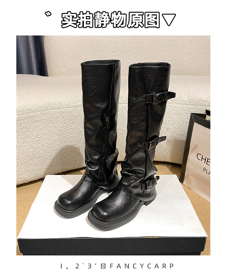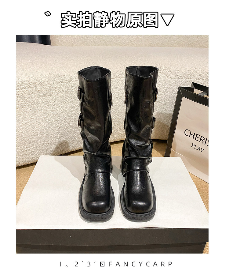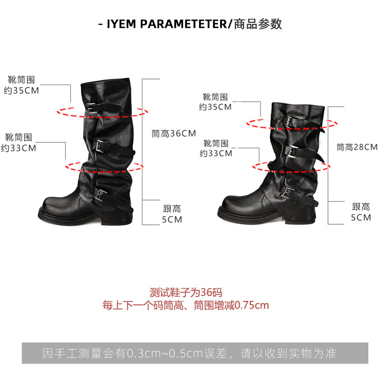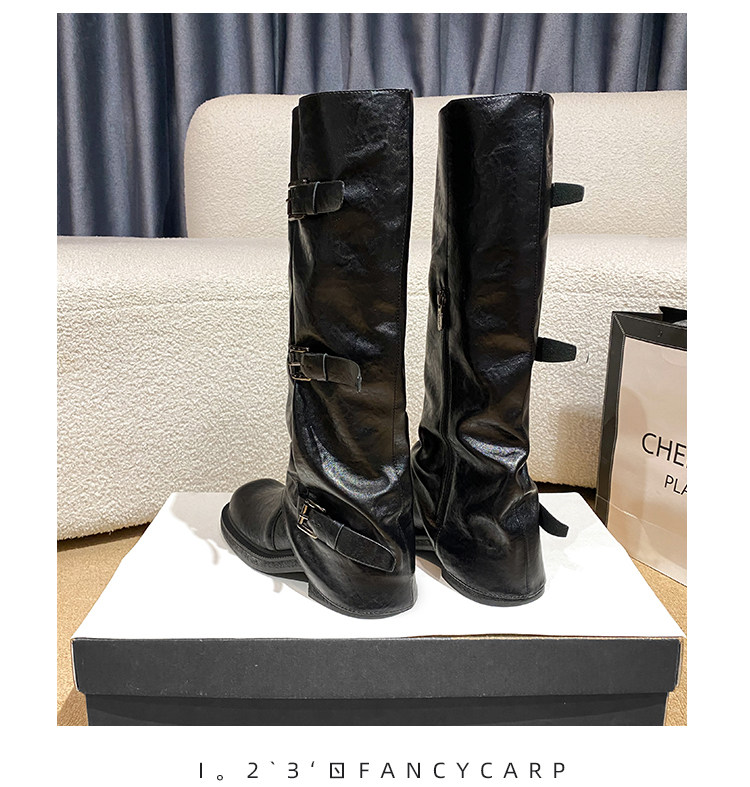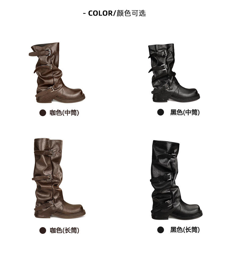 Genuine Leather~ Jiaoyu Leather Buckle Black Mid-Calf Pants Boots Women's Slouch Boots Long Boots Riding Boots Western Cowboy Boots