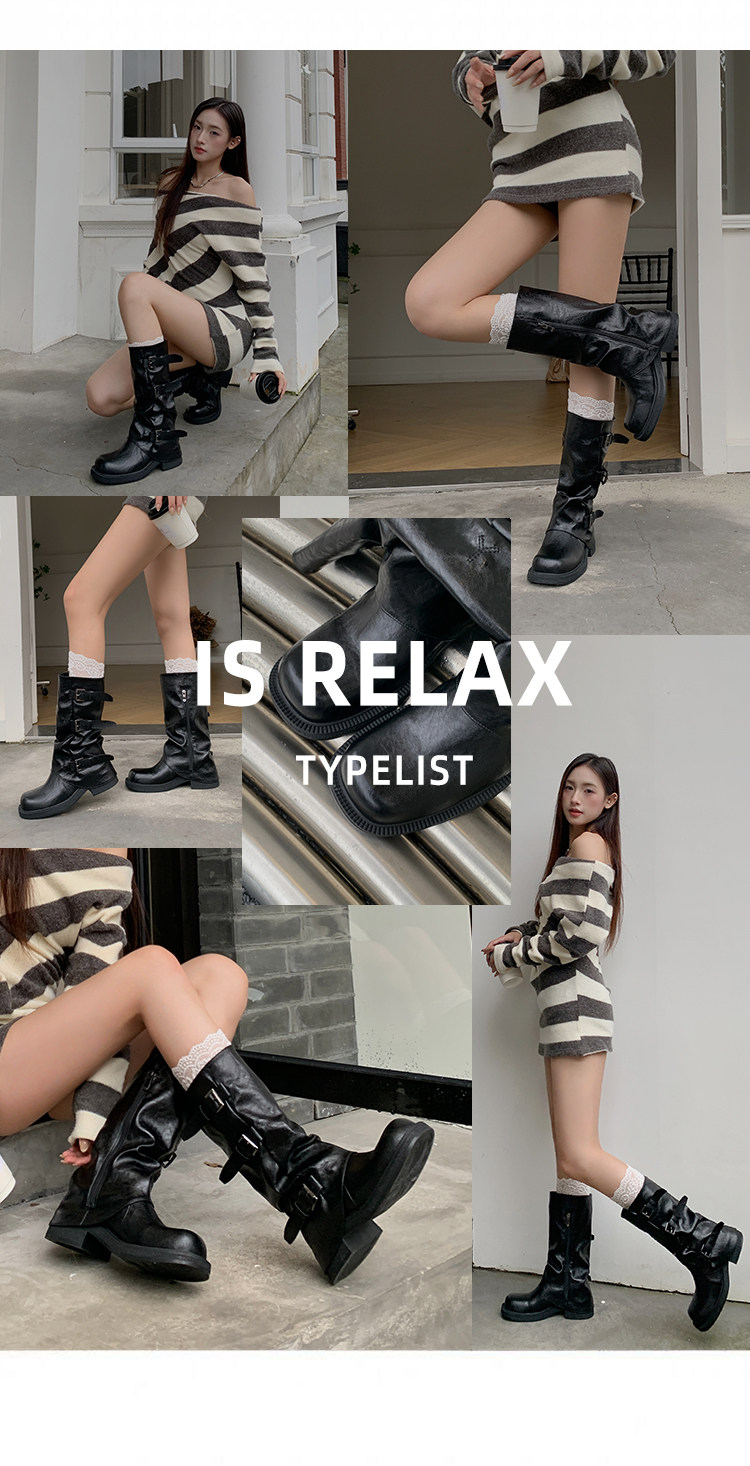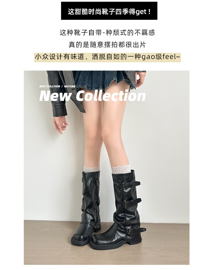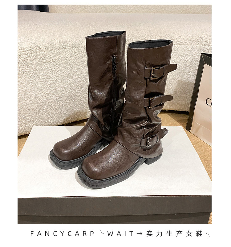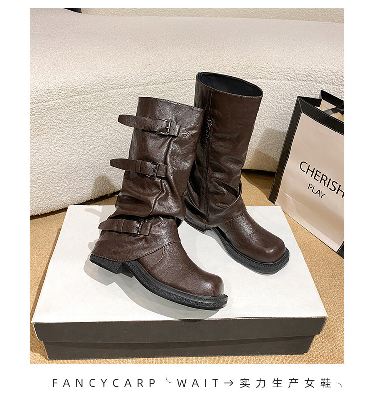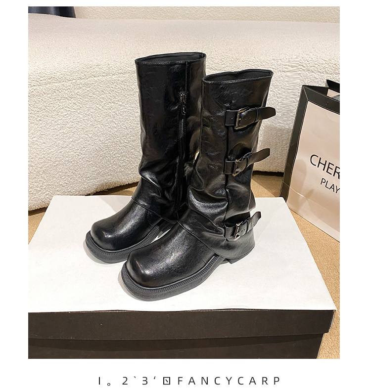 Genuine Leather~ Jiaoyu Leather Buckle Black Mid-Calf Pants Boots Women's Slouch Boots Long Boots Riding Boots Western Cowboy Boots