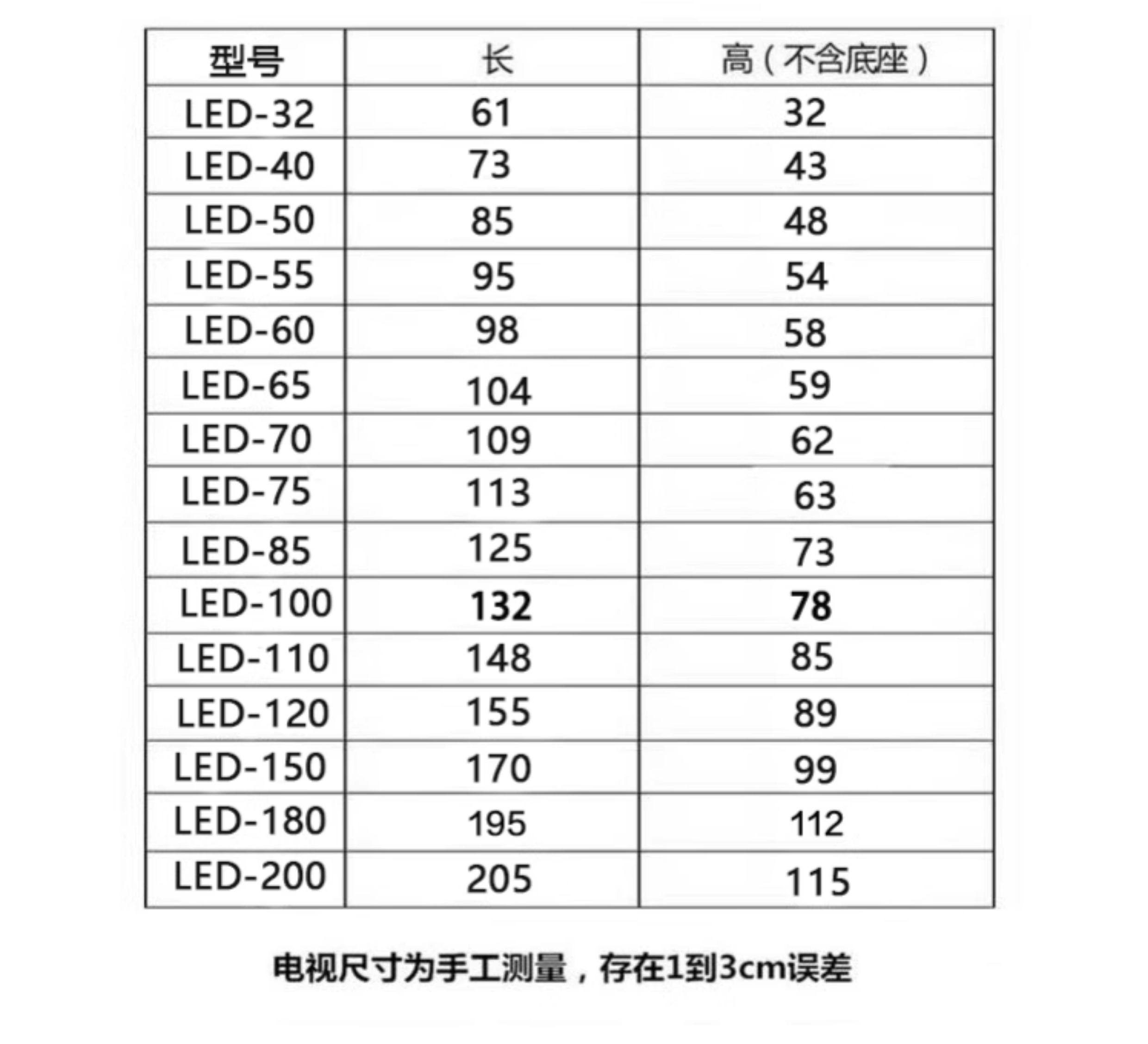 | Color Classification | Led-40Tv Model-Ultra-Clear Eye Protection Screen[Tv Version][Length 73 Width 43],Led-40Tv Model-Ultra Clear Smart Wifi[Web Version]Length 73, Width 43,Led-40Tv Model-Ultra Clear Smart Wifi[Voice Explosion-Proof Version]Length 73, Width 43,Led-50Tv Model-Ultra-Clear Eye Protection Screen[Tv Version]Length 90, Width 48,Led-50Tv Model-Ultra Clear Smart Wifi[Web Version]Length 90, Width 48,Led-50Tv Model-Ultra Clear Smart Wifi[Voice Explosion-Proof Version]Length 90, Width 48,Led-55V Model-Ultra-Clear Eye Protection Screen[Tv Version]Length 95, Width 54,Led-55Tv Model-Ultra Clear Smart Wifi[Web Version]Length 95, Width 54,Led-55Tv Model-Ultra Clear Smart Wifi[Voice Explosion-Proof Version]Length 95, Width 54,Led-60Tv Model-Ultra Clear Smart Wifi[Voice Explosion-Proof Version]Length 98, Width 58,Led-65Tv Model-Ultra Clear Smart Wifi[Web Version]Length 104*59,Led-65Tv Model-Ultra Clear Smart Wifi[Voice Explosion-Proof Version]Length 104*59,Led-70Tv Model-Ultra Clear Smart Wifi[Web Version]Length 109*62,Led-70Tv Model-Ultra Clear Smart Wifi[Voice Explosion-Proof Version]Length 109*62,Led-75Tv Model-Ultra Clear Smart Wifi[Web Version]Length 113*63,Led-75Tv Model-Ultra Clear Smart Wifi[Voice Explosion-Proof Version]Length 113*63,Led-85Tv Model-Ultra Clear Smart Wifi[Web Version]Length 125*73,Led-85Tv Model-Ultra Clear Smart Wifi[Voice Explosion-Proof Version]Length 125*73,Led-100Tv Model-Ultra Clear Smart Wifi[Web Version]Length 132*78,Led-100Tv Model-Ultra Clear Smart Wifi[Voice Explosion-Proof Version]Length 132*78,Led-110Tv Model-Ultra Clear Smart Wifi[Voice Explosion-Proof Version]Length 148*85,Led-120Tv Model-Ultra Clear Smart Wifi[Voice Explosion-Proof Version]Length 155*89,Led-150Tv Model-Ultra Clear Smart Wifi[Voice Explosion-Proof Version]Length 170*99,Led-180Tv Model-Ultra Clear Smart Wifi[Voice Explosion-Proof Version]Length 195*112 |