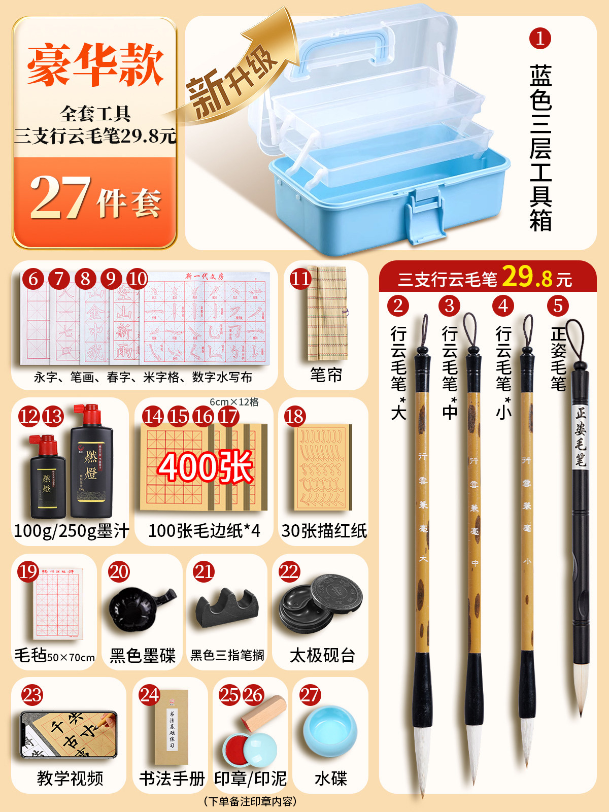 | Color Classification | When You Place an Order, You Will Receive a System Calligraphy Tutorial - Professional Course,Practical 18-Piece Set[Enlarged Toolbox + 200 Sheets of Paper + Workbook],Hot Selling Recommendations⭐Practical 20-Piece Set[Enlarged Tool Box + Upright Brush + 200 Sheets of Paper + Red Copybook],⭐Practical 22-Piece Set[Town Ruler + Straight Brush + Pen Curtain],Student Suit[10cm Grid Paper + White Cloud Brush + Posture Pen + Enlarged Tool Box],Third Grade Set[9cm Grid Paper + White Cloud Brush + Posture Pen + Enlarged Tool Box],Advanced 21-Piece Set⭐White Cloud Pen Tip[Brush Upgrade + Enlarged Tool Box + Pen Curtain],Luxurious 27-Piece Set[Extra Large Blue 3-Layer Tool Box + Brush Upgrade + 430 Pieces of Calligraphy Paper + Full Set of Tools]Please Specify the Stamp Content in the Order Notes,Primary School Student Regular Script Set (16cm Large Grid Paper + Large Brush),Entry-Level 14-Piece Set (100 Pieces of Raw Edge Paper + 100g Ink),Water Writing Cloth 8-Piece Set[Practice Calligraphy with Clear Water],Trial 9-Piece Set[Toolbox + 100 Sheets of Paper],8-Piece Starter Set[50 Pieces of Raw Edge Paper] |